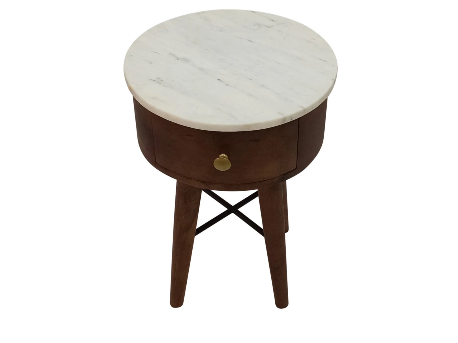 A side table for your favorite chair that not only looks great but also adds valuable storage for keys, remotes, or other items. The Bronagh End Table features a durable white marble top finish with solid mango base in a brown cherry finish that will complement virtually any decor with its transitional styling. Cylindrical legs lend a touch of mid-century modern to this eye-catching table.