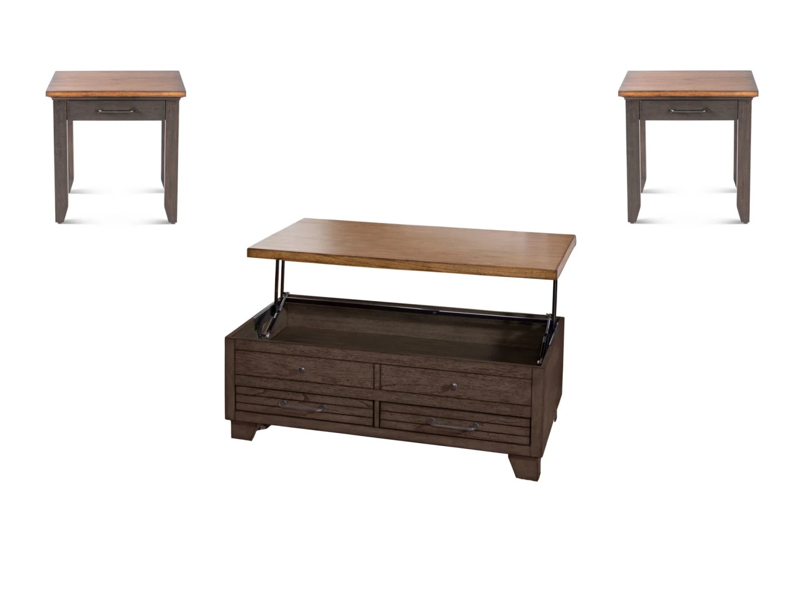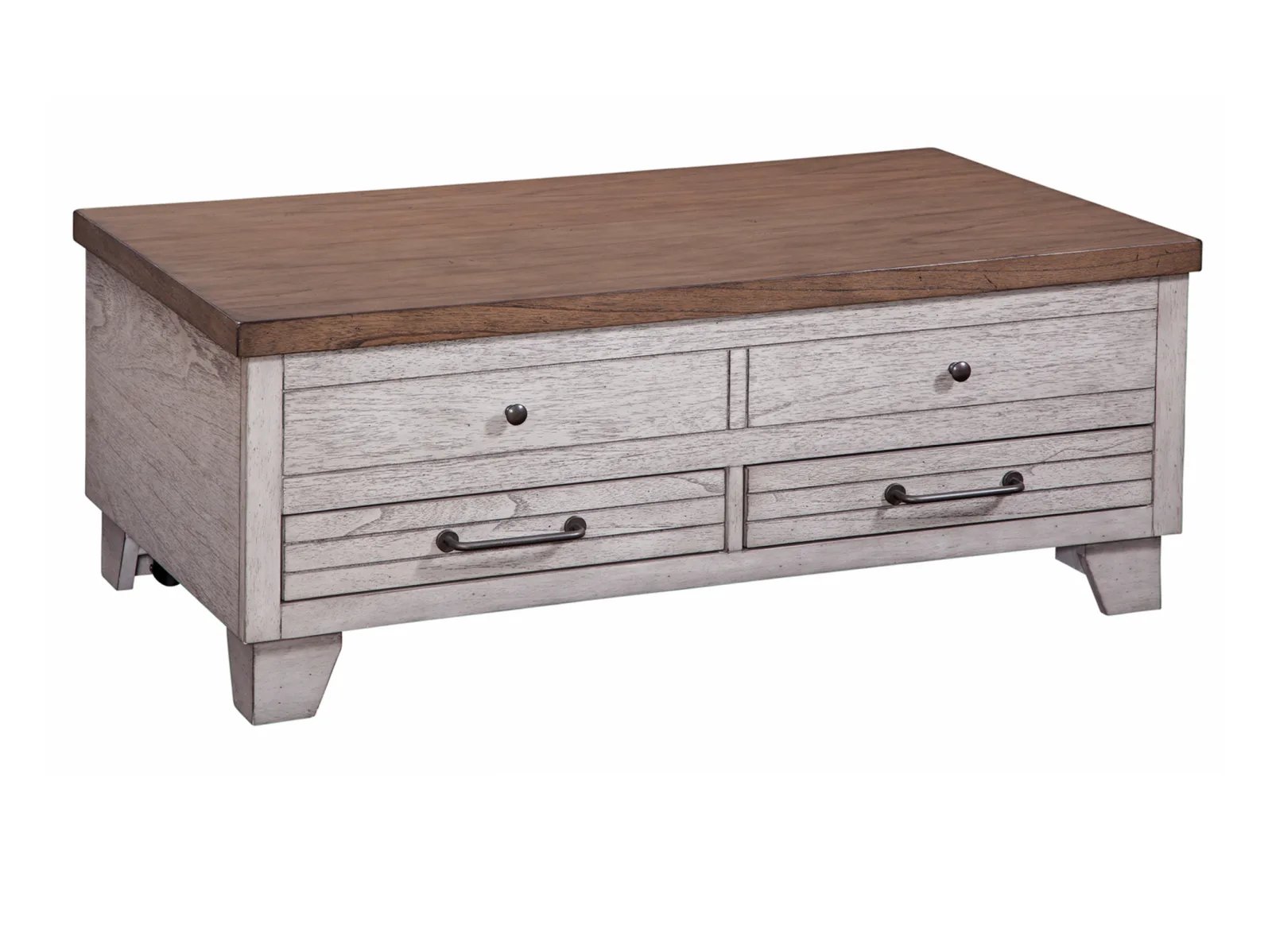 Add some function to your Coffee Table with the Lift-Top Coffee Table from Brook Park! Perfect for your farmhouse-inspired home, the Brook Park Lift-Top Coffee Table offers just the right mix of casual design and lift-top functionality to create the perfect table set for today’s rustic homes. The lift-top allows you to work or eat right from your sofa while offering storage below the lift-top and in the bottom drawers of the table. The two-tone combination of white and honey smoke finish works well with any casual upholstery setting and features distressing that makes the table look like a vintage heirloom in any room.