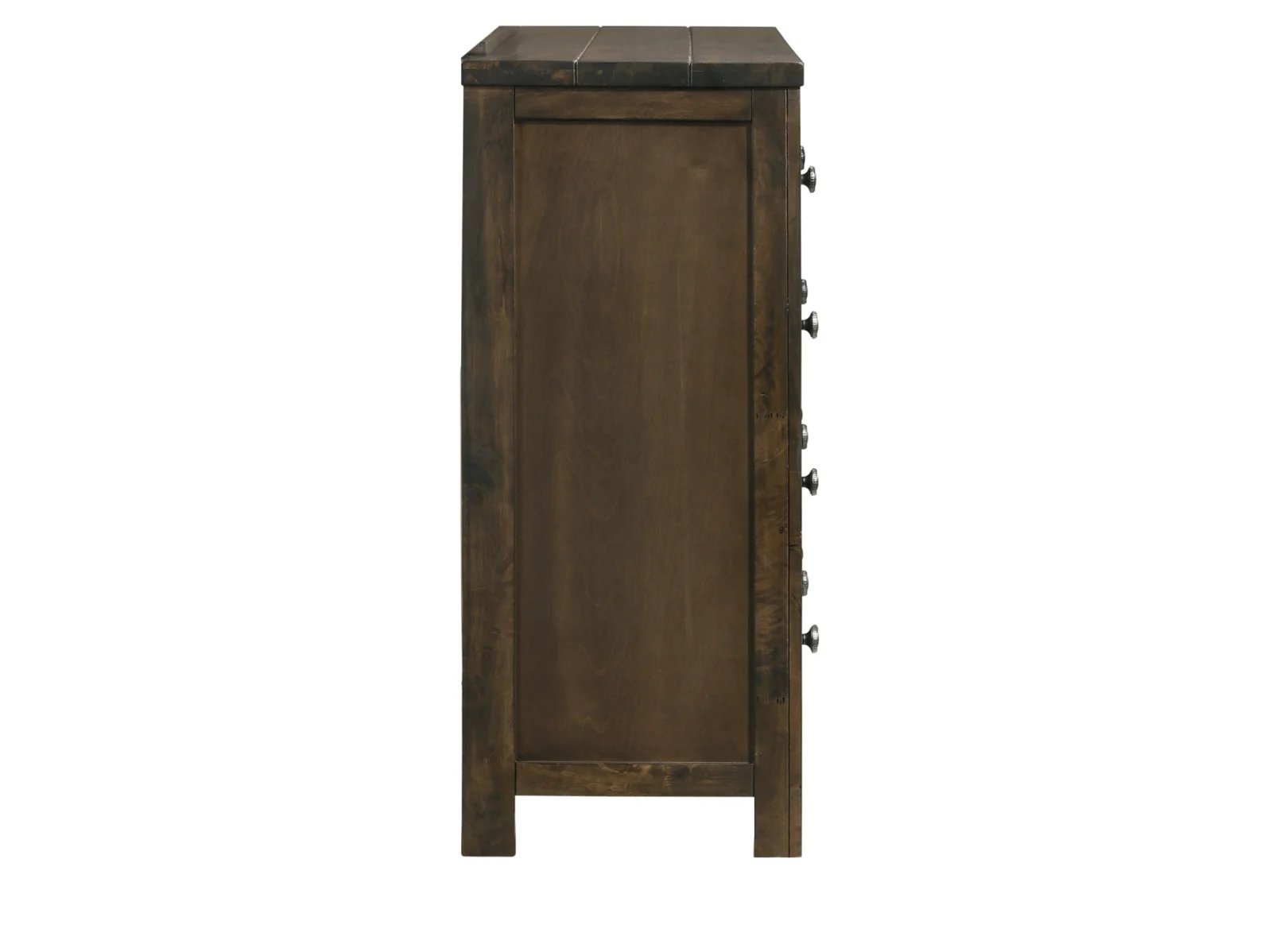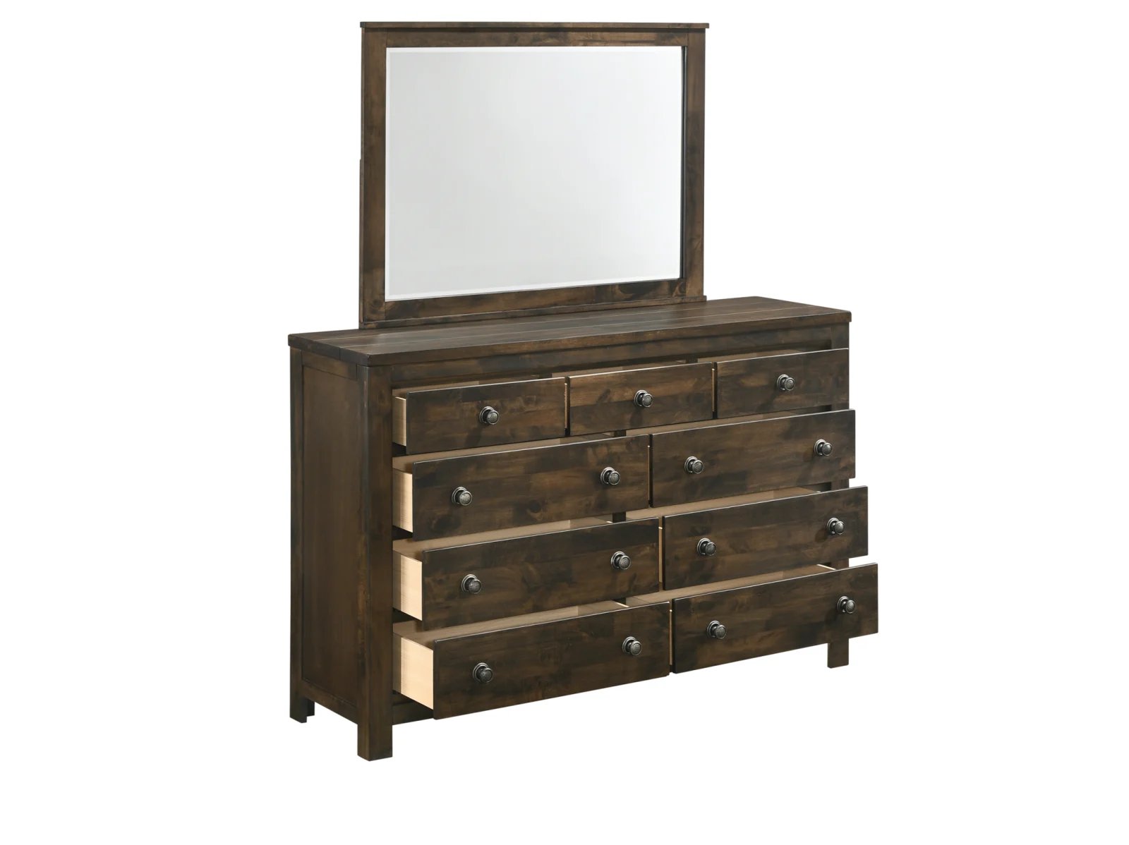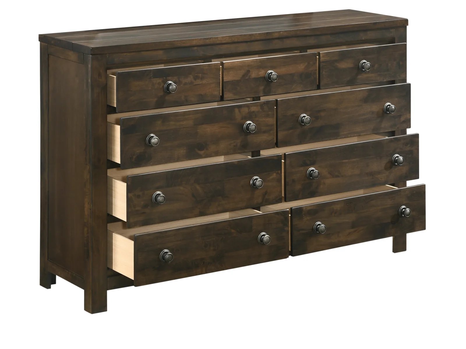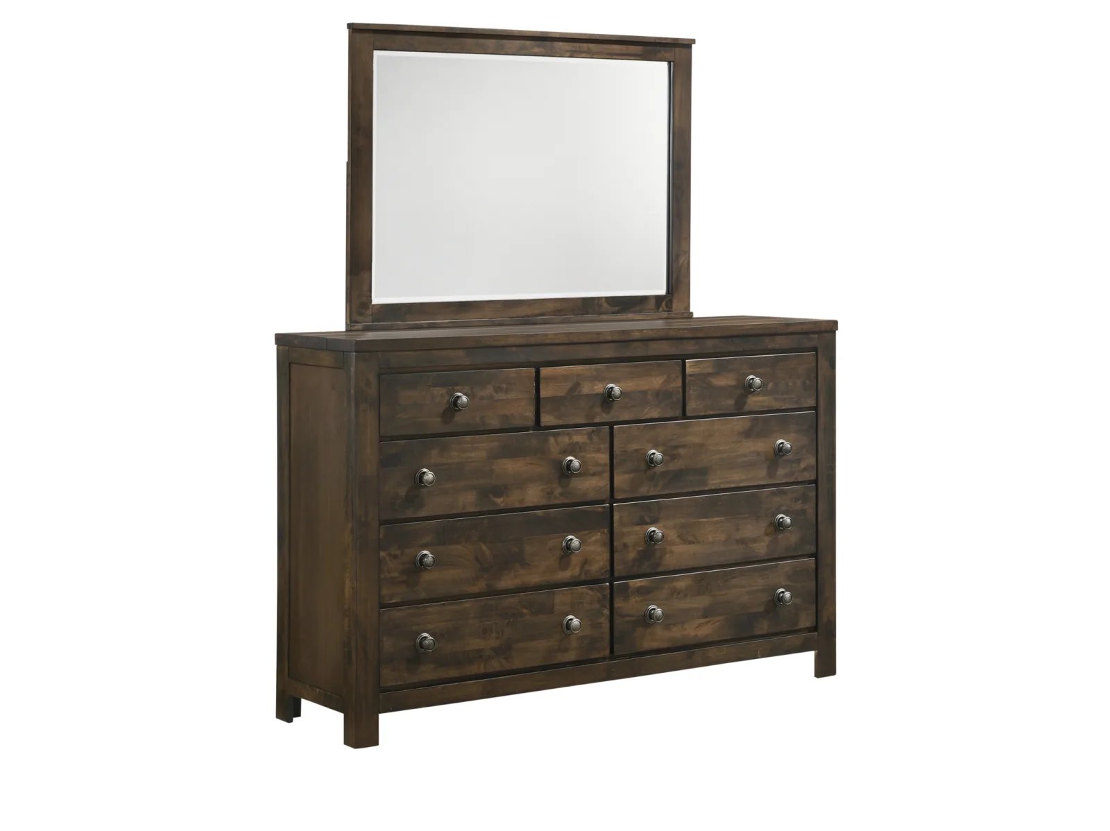 Enjoy the one-of-a-kind comfort of the Buffalo Ridge Sleigh Dresser. Constructed of reclaimed solid wood, no two pieces are exactly alike, yet all bear the heritage of old, weathered and time tested lumbar that has been reworked into this unique collection. With a rustic brown with gray undertones finish, the dresser features 6 drawers drawers, and a top row of 3 smaller drawers, with a velvet lining in the top row of drawers.