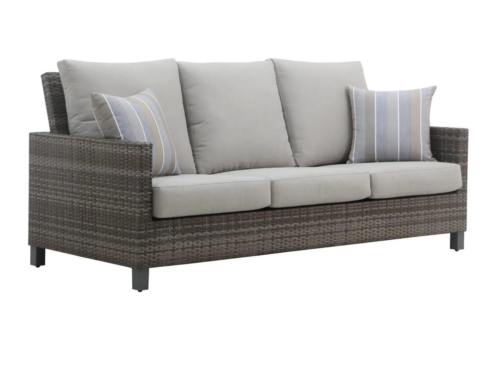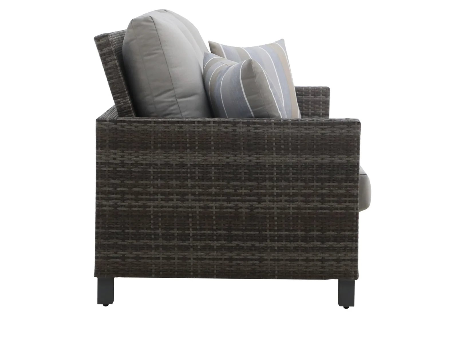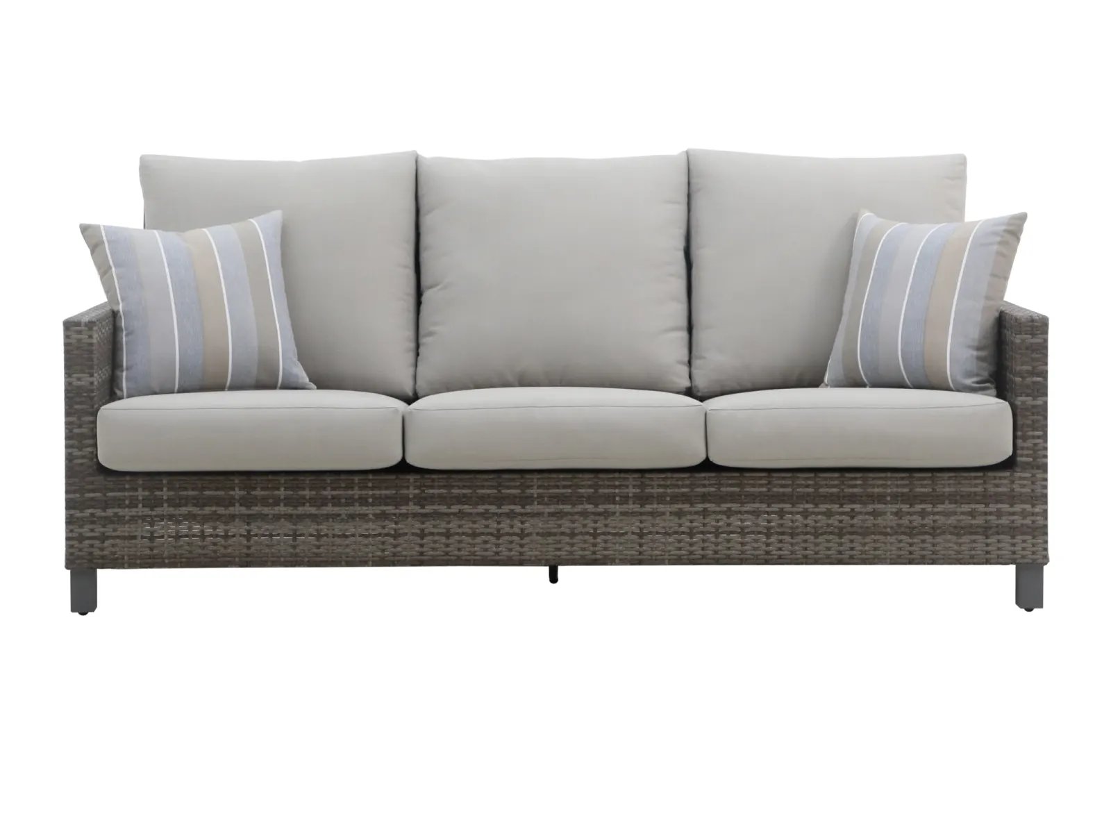 & Free ShippingThe Burnley Sofa with 2 Accent Pillows offers the perfect blend of durability and comfort for your outdoor living space. Built to last, its sturdy aluminum frame is powder-coated for superior scratch resistance, ensuring long-term strength. Wrapped in high-density PE wicker, the eco-friendly synthetic resin is low-maintenance and designed to withstand weather conditions without fading or warping. The fade-resistant Sandura fabric cushions are crafted from 100% solution-dyed polyester, providing moisture and mildew resistance, while retaining their vibrant color season after season. The high-density 12cm foam seat and back cushions deliver exceptional comfort, offering resilient support for relaxation. With its modern design and versatile gray palette, this sofa is a stylish addition to any patio. Enjoy the combination of durability, comfort, and design for a worry-free outdoor lounging experience making it a smart investment for your home.