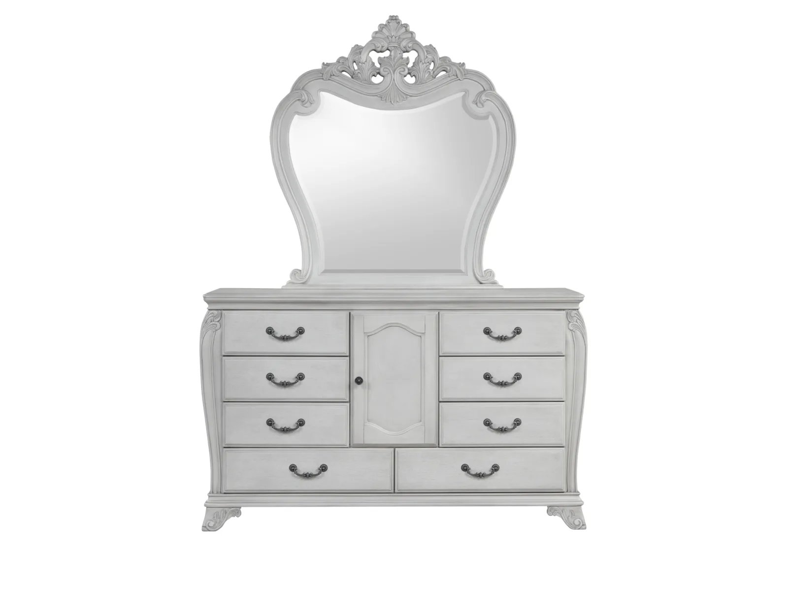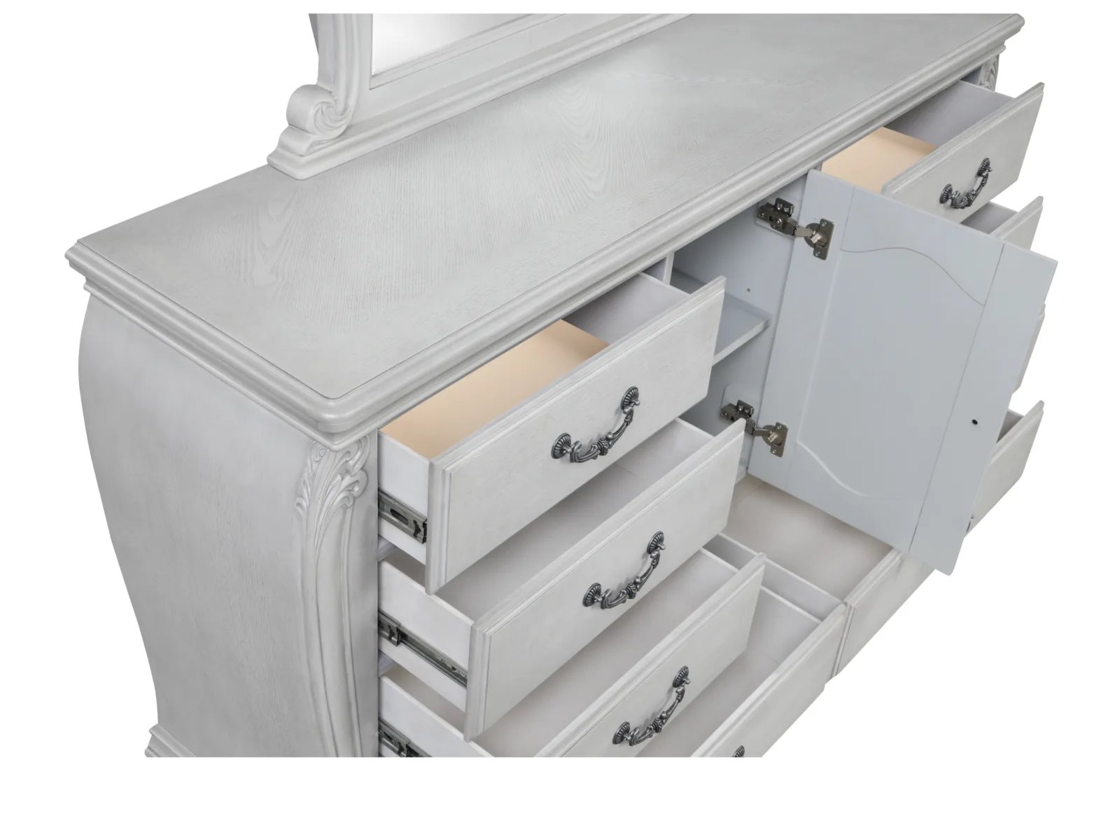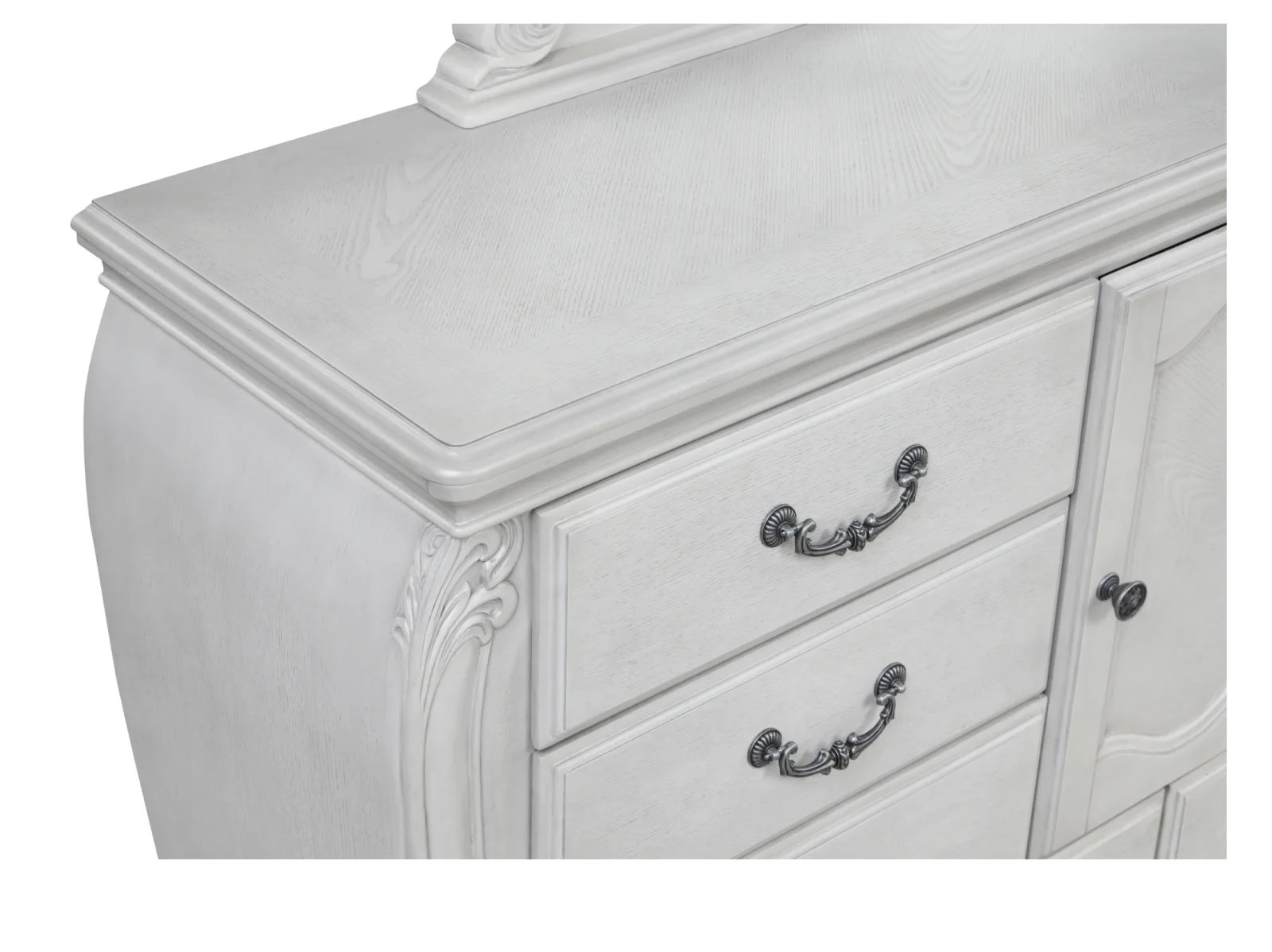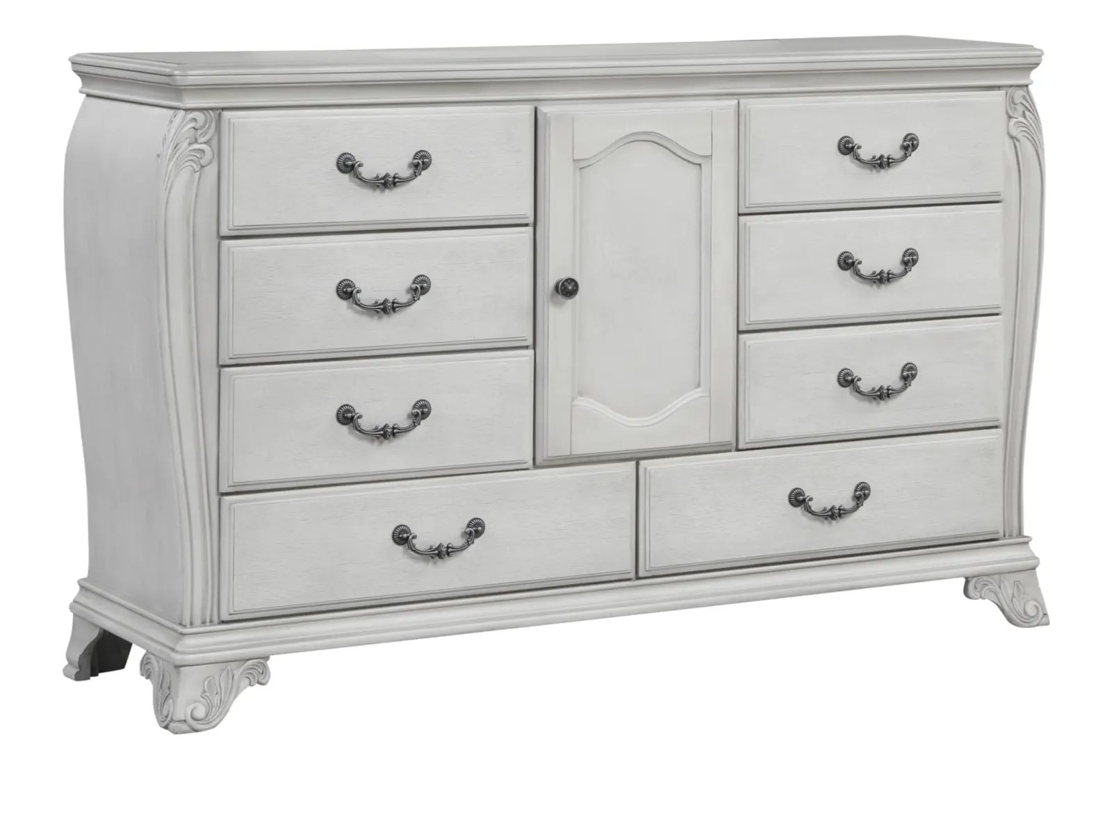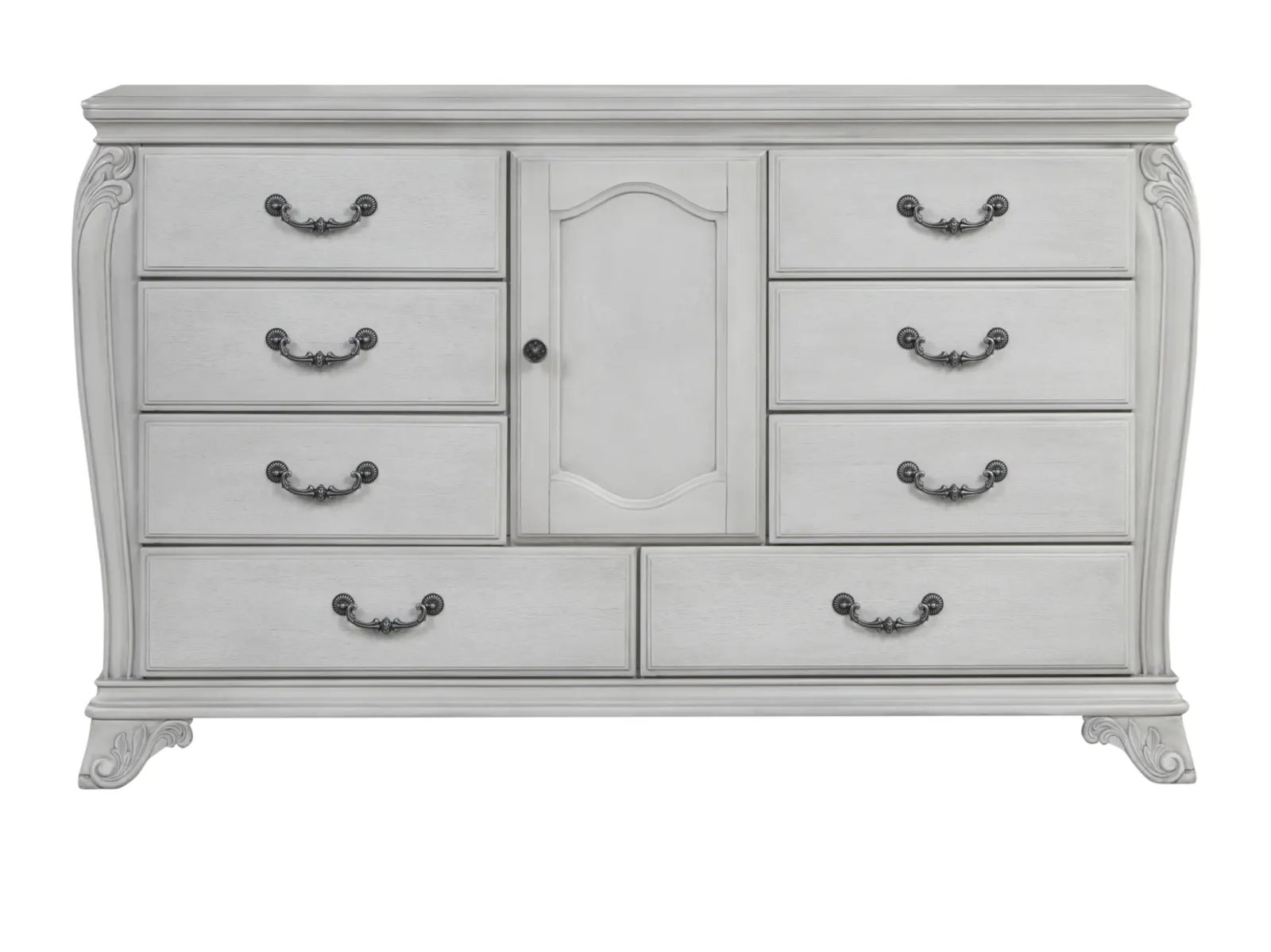 The Calipatria Dresser brings timeless style and function with its distinctive bombe silhouette and luxurious mist gray finish. It features eight spacious English dovetail drawers with felt-lined top drawers for delicate items and classic metal pull handles, plus a central closed cabinet for added storage. Ornate carved details highlight its sophisticated European influence.