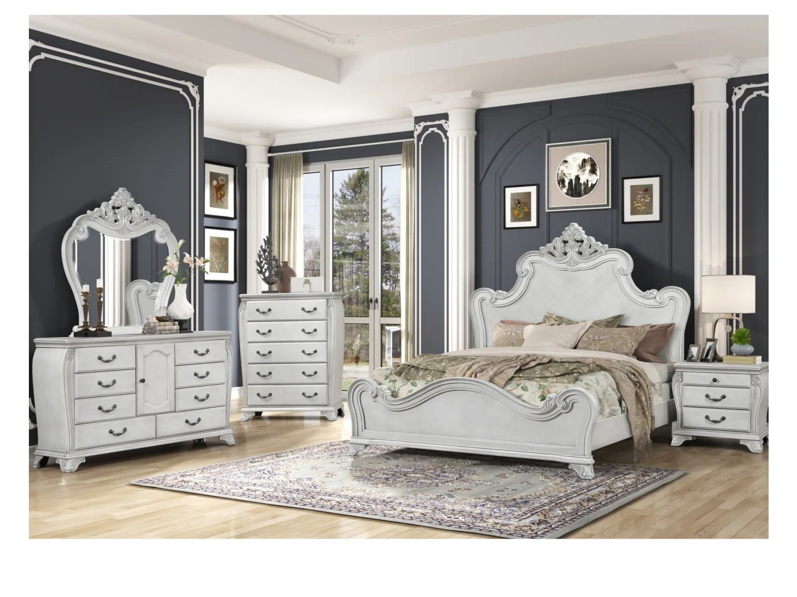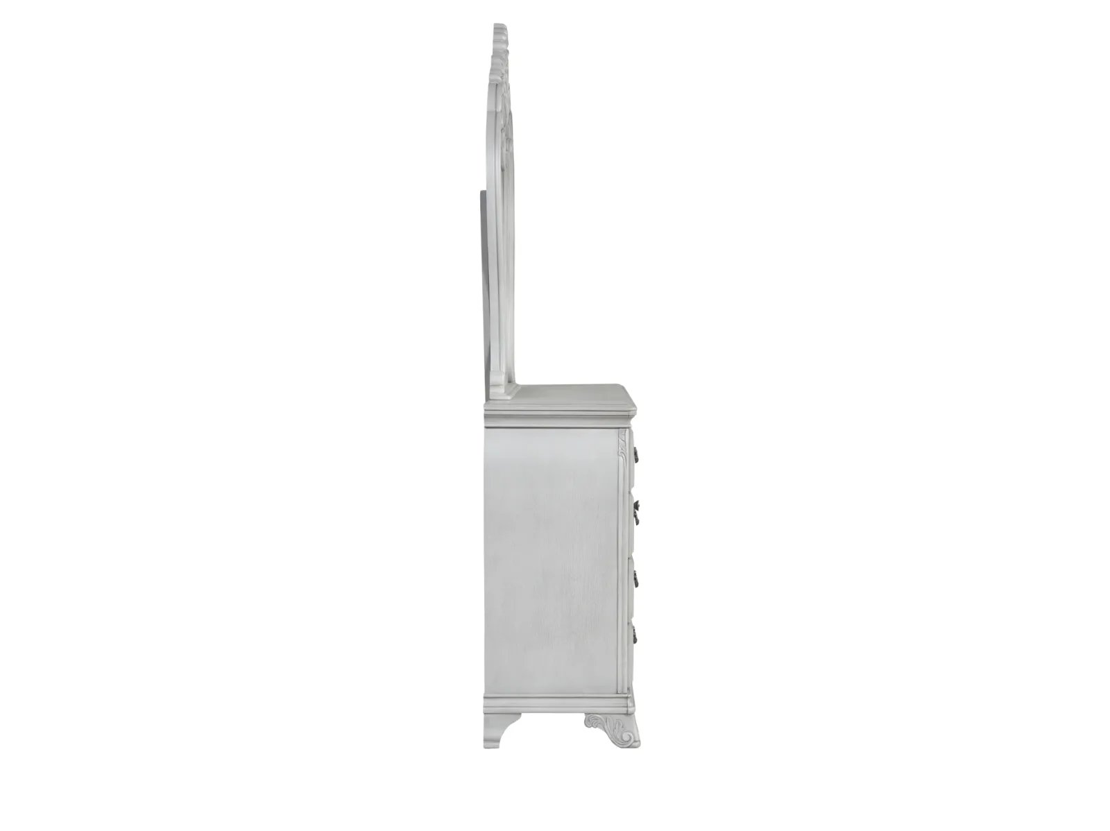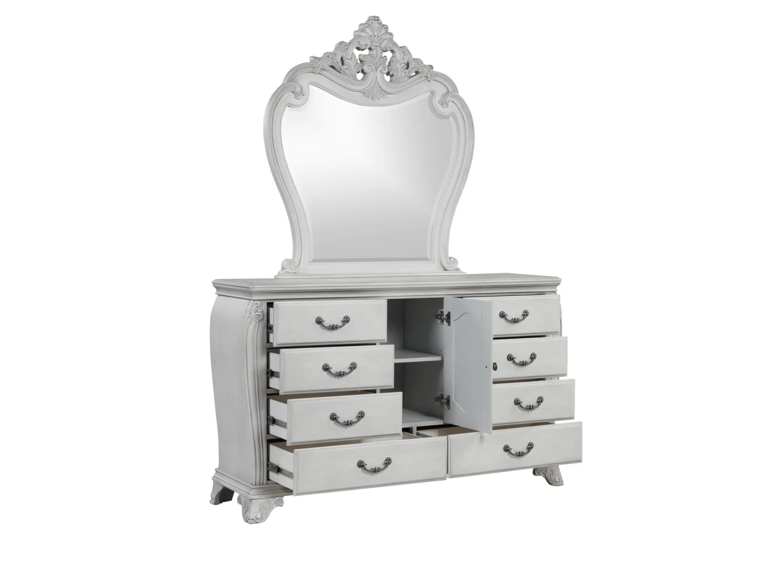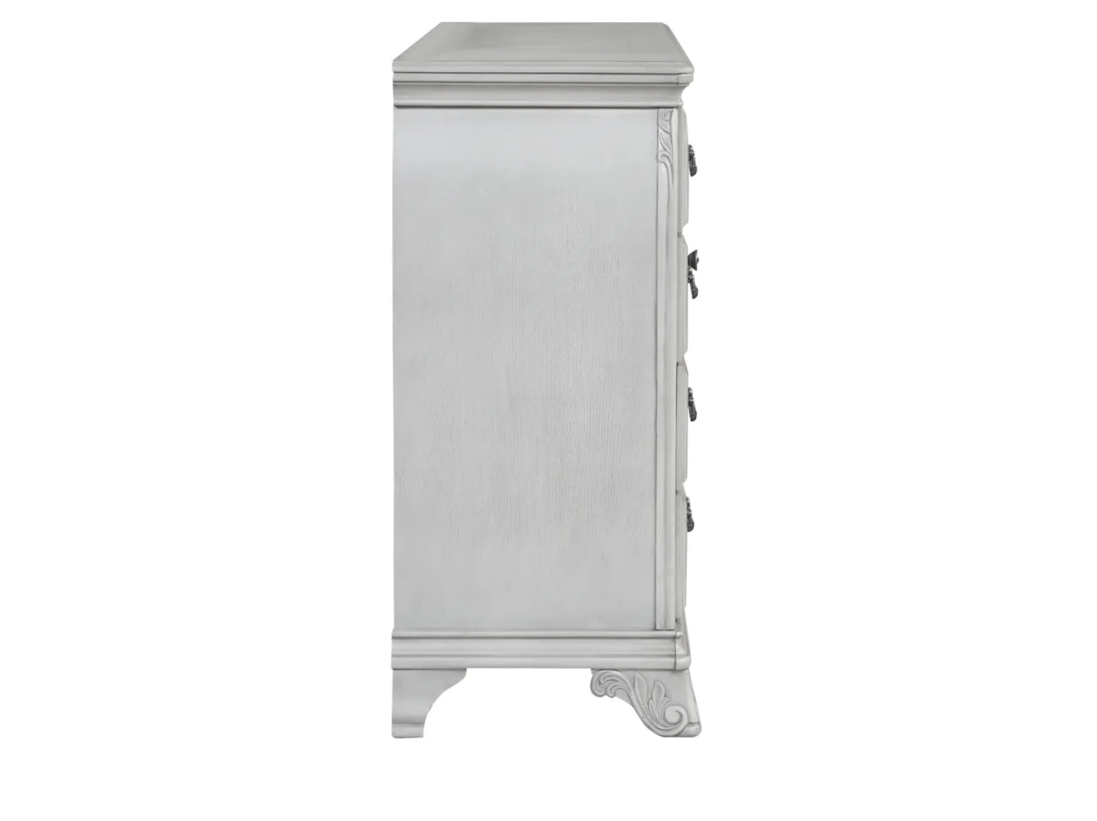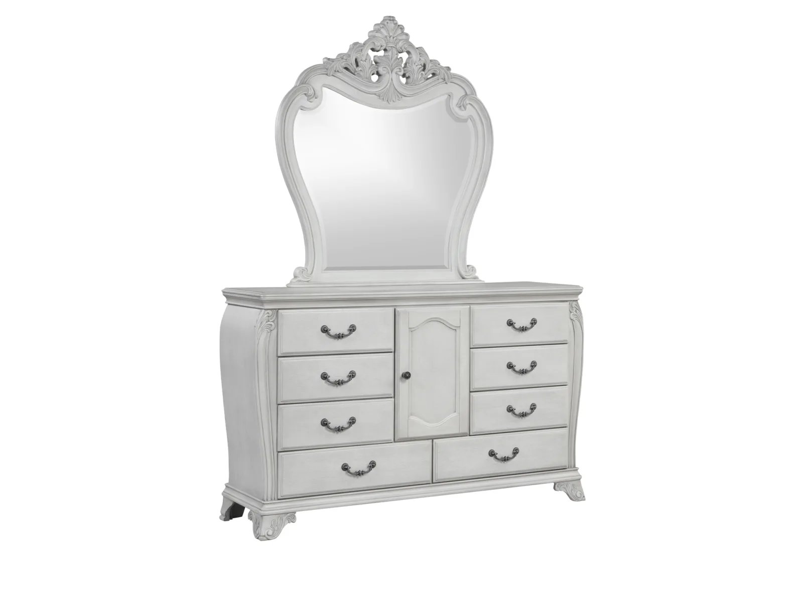 The Calipatria Dresser brings timeless style and function with its distinctive bombe silhouette and luxurious mist gray finish. It features eight spacious English dovetail drawers with felt-lined top drawers for delicate items and classic metal pull handles, plus a central closed cabinet for added storage. Ornate carved details highlight its sophisticated European influence.