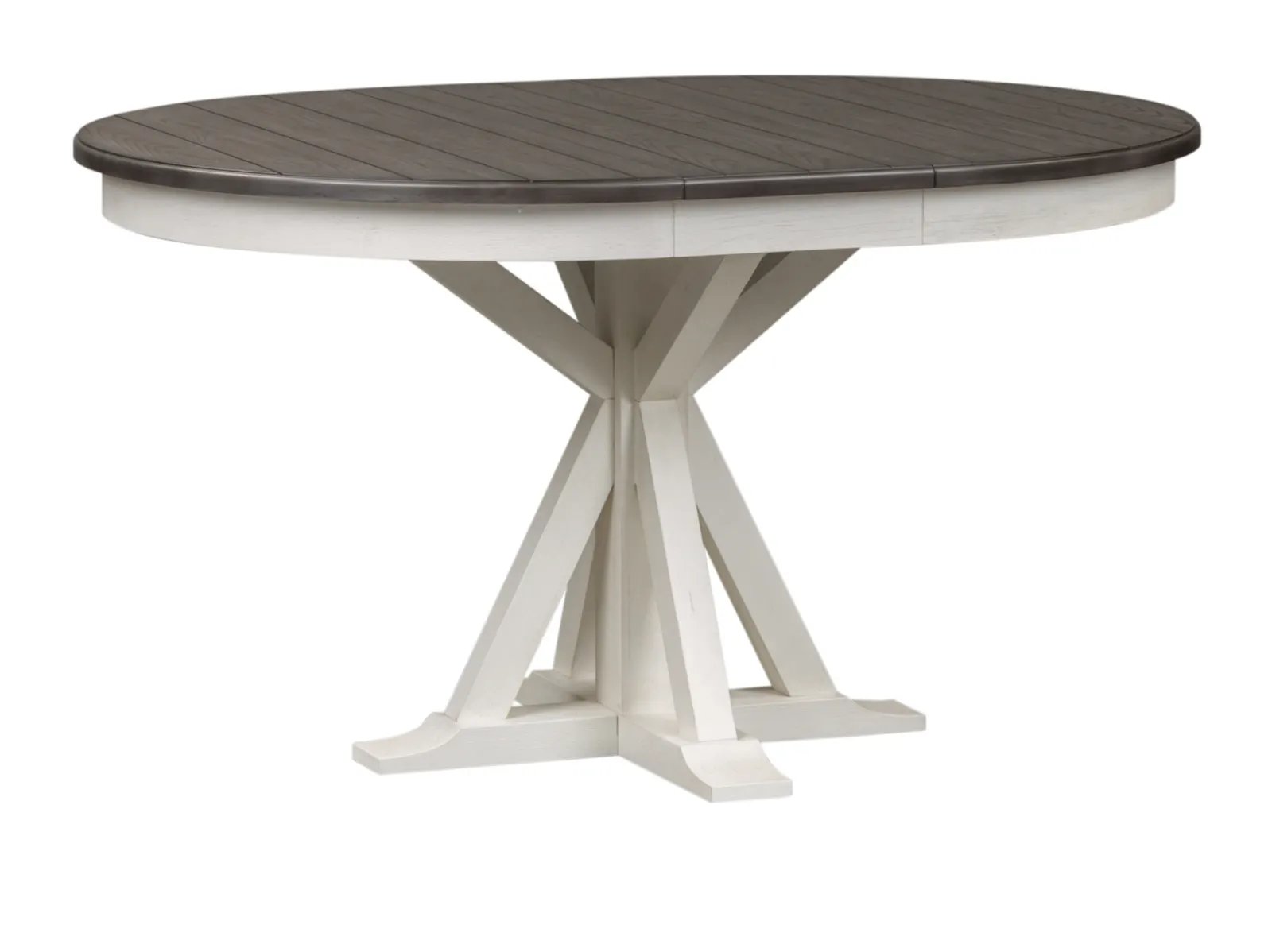 & Free ShippingSitting pretty with the Calument Oval Table. Crafted of pine solids and veneers with a cathedral white oak top, this table features wire brushed white finish and a wire brushed charcoal top. The tabletop is planked and includes a 12” removable leaf on an easy glide track system making expansion to an oval top or contraction to a round top a breeze. The pedestal has a unique crisscross design that flows into bracket feet for a nice design appeal. Calument offers cottage styles you love in a wire brushed two tone finish that will work from the beach to the mountains to an industrial loft.
