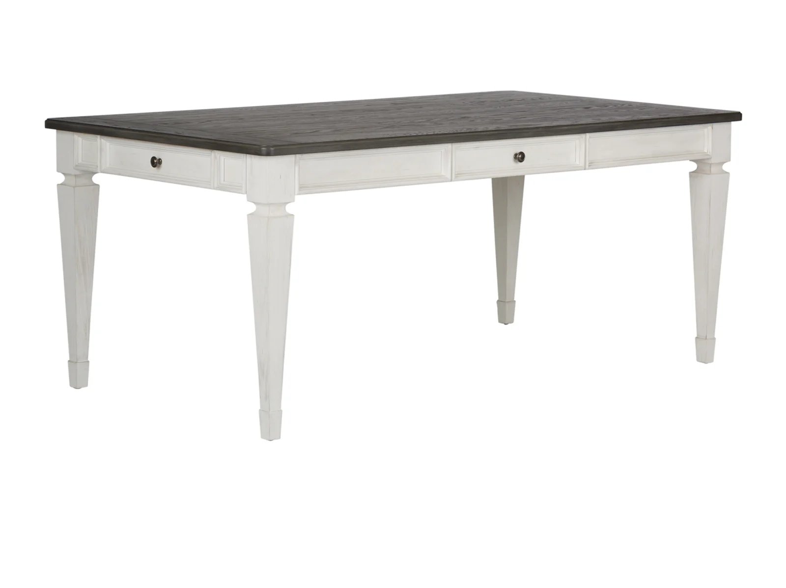 Gather the entire family around the Calument rectangular table. Crafted of rubberwood and pine solids with pine veneer and cathedral white oak veneer top, this piece features a wire brushed white finish with a planked charcoal top, fixed top, fully stained interior drawers with felt lining, full extension drawer glides for easy access to storage, antique pewter knob hardware, one storage drawer on each side of the table offering additional storage for user convenience and decluttering and is anchored by square turned legs. This table is perfect for creating a classic look while maintaining a casual feel.