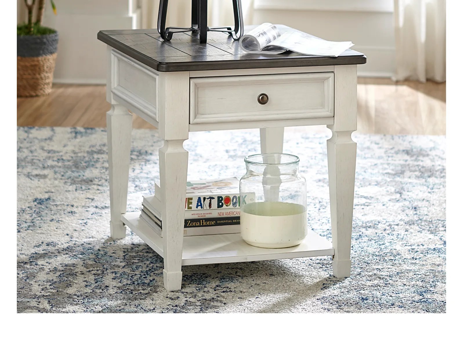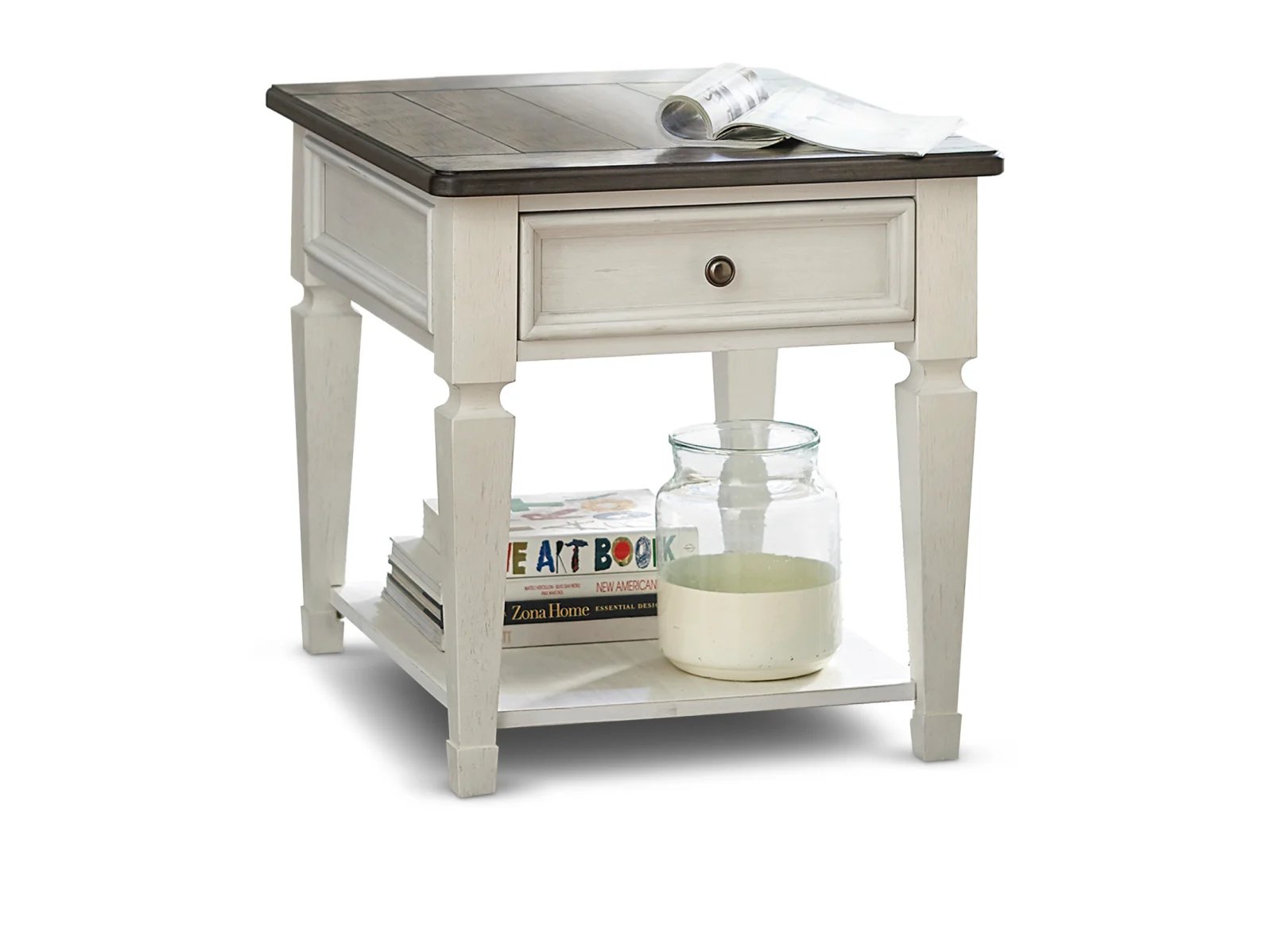 & Free ShippingEnhance your space with the Calument End Table. Crafted of pine solids and veneers with cathedral white oak tops, this piece features a wire brushed white finish with a planked charcoal top, one wood framed full extension drawer accented with antique pewter knob hardware, a bottom shelf for additional storage, and is anchored by square tapered legs. This classic end table would make a gorgeous addition to your casual styled home.