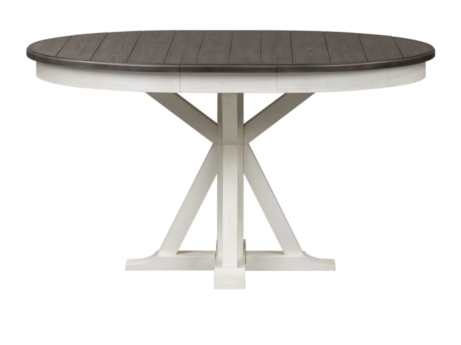 Sitting pretty with the Calument Oval Table. Crafted of pine solids and veneers with a cathedral white oak top, this table features wire brushed white finish and a wire brushed charcoal top. The tabletop is planked and includes a 12” removable leaf on an easy glide track system making expansion to an oval top or contraction to a round top a breeze. The pedestal has a unique crisscross design that flows into bracket feet for a nice design appeal. Calument offers cottage styles you love in a wire brushed two tone finish that will work from the beach to the mountains to an industrial loft.