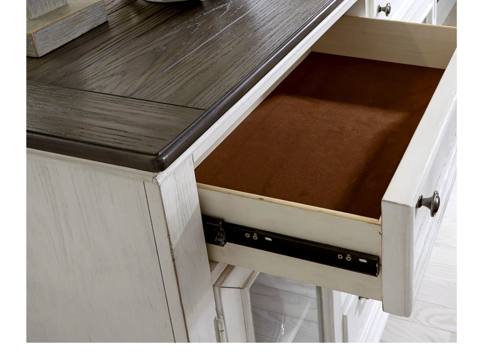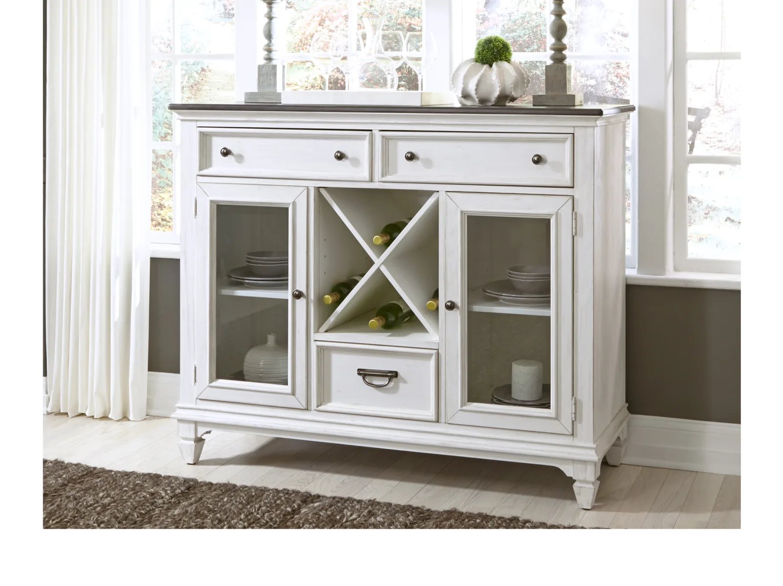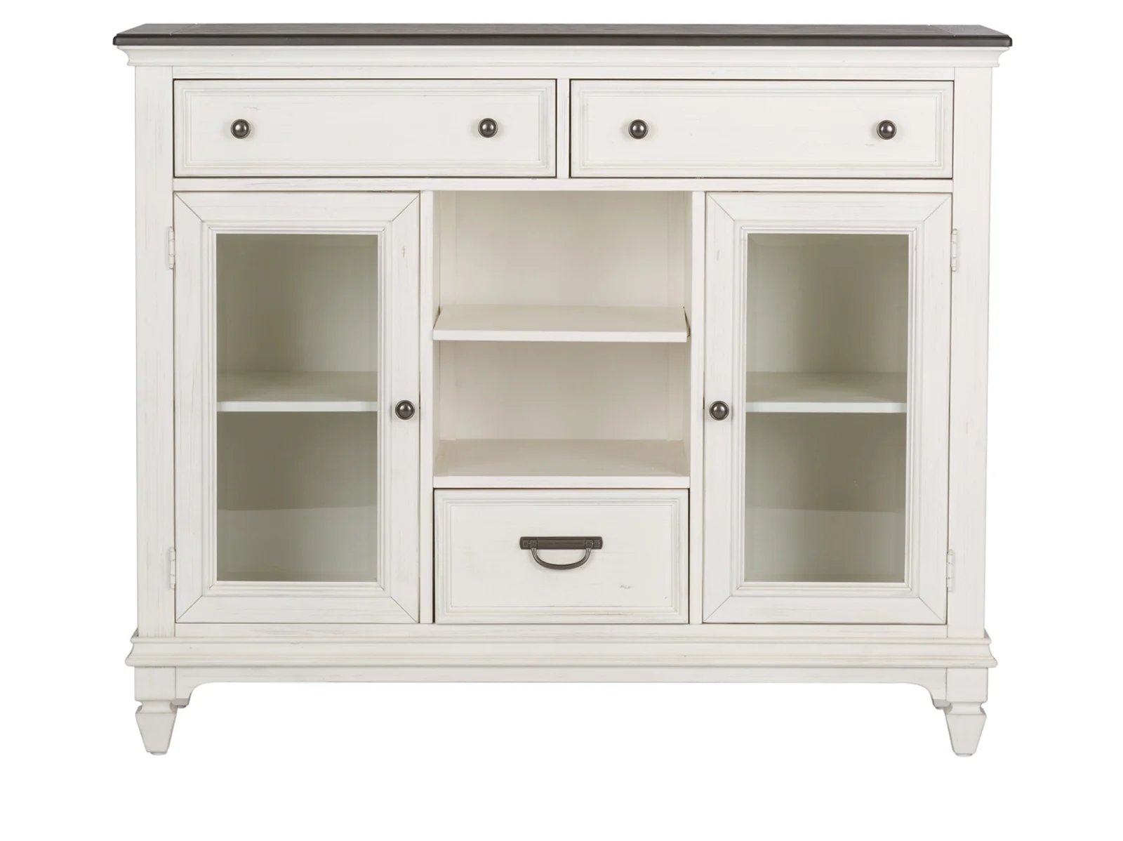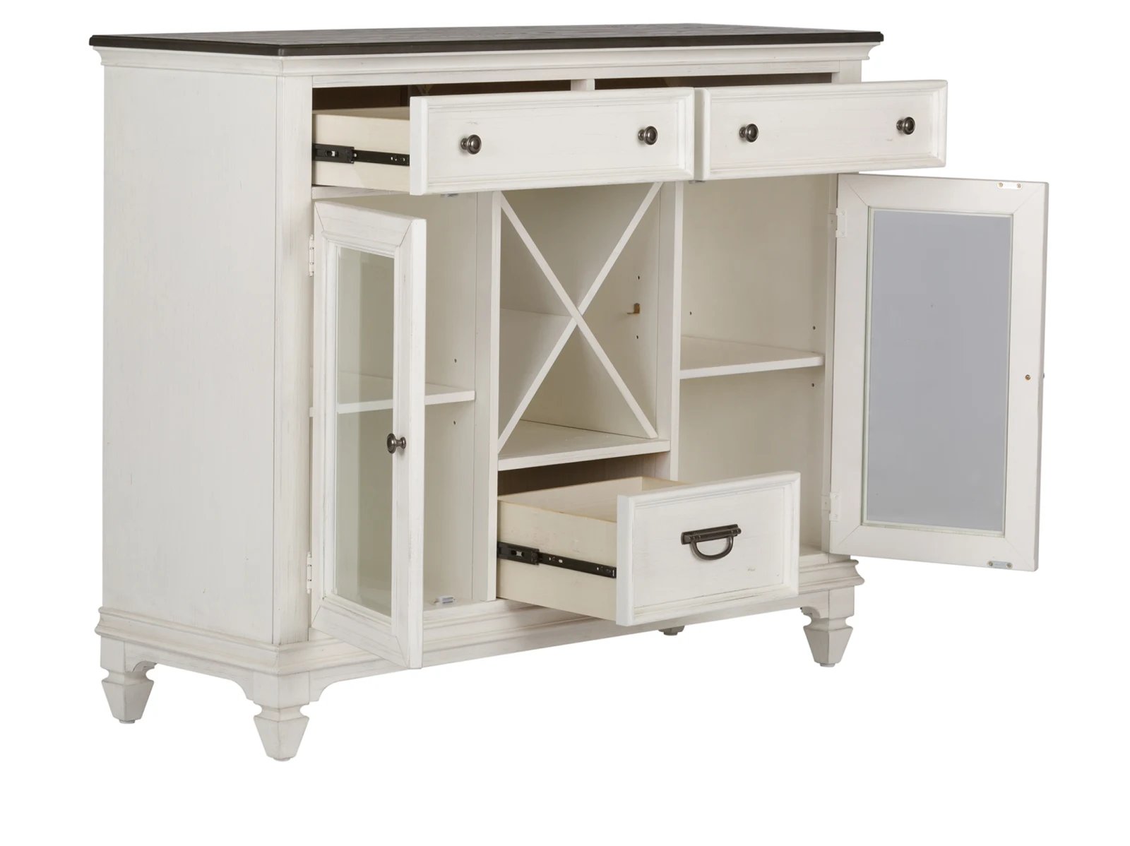 Reinvent your style with a memorable piece. The Calument Server is crafted of poplar and rubberwood solids with cathedral white oak tops and features a wire brushed charcoal planked top with a wire brushed white base that has brown undertones, all accented with antique pewter knob and drop bail hardware. This Server has an open center shelf with wine storage flanked between two wood framed glass doors. Behind each door is one adjustable shelf. Three wood framed full extension drawers round out this piece, with the top two drawers being lined with felt. The Calument Server offers cottage styles you love that will work from the beach to the mountains to an industrial loft.