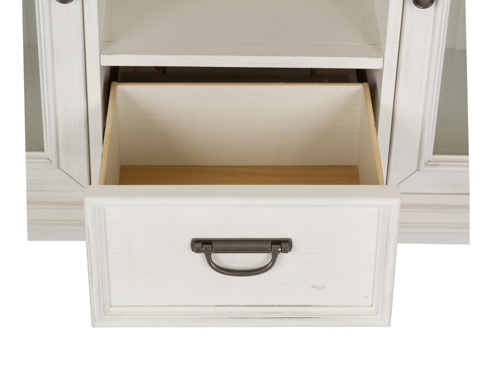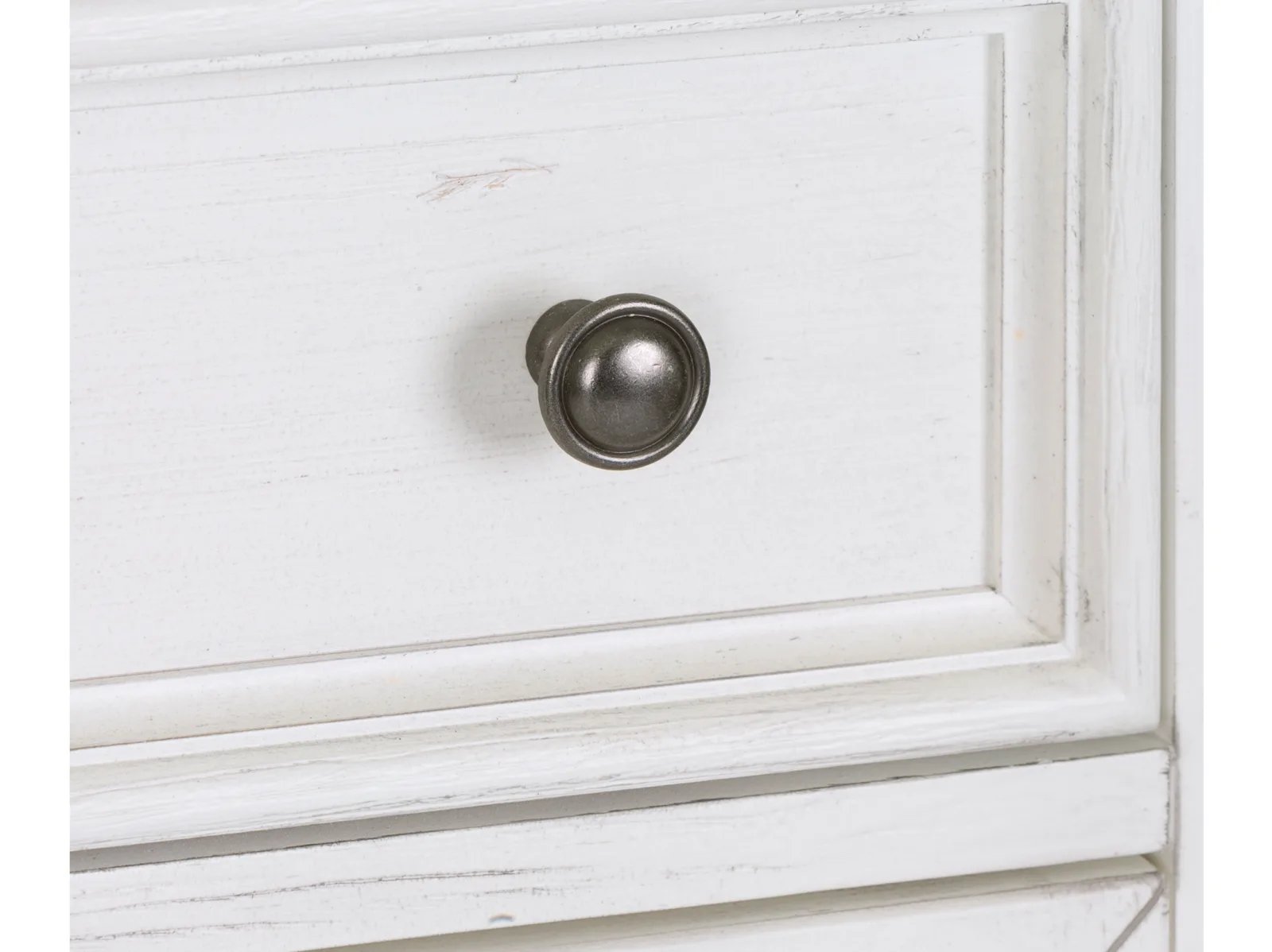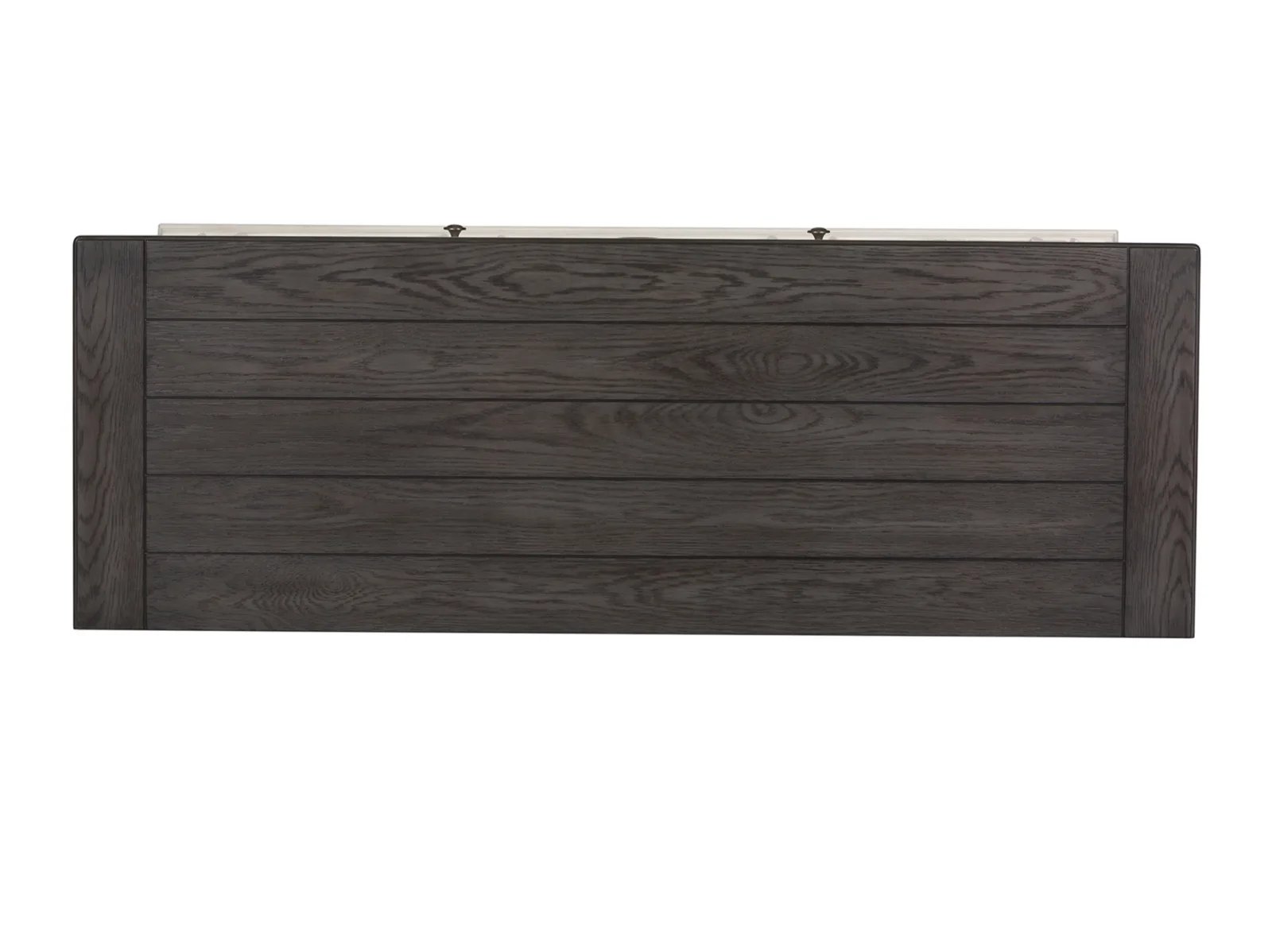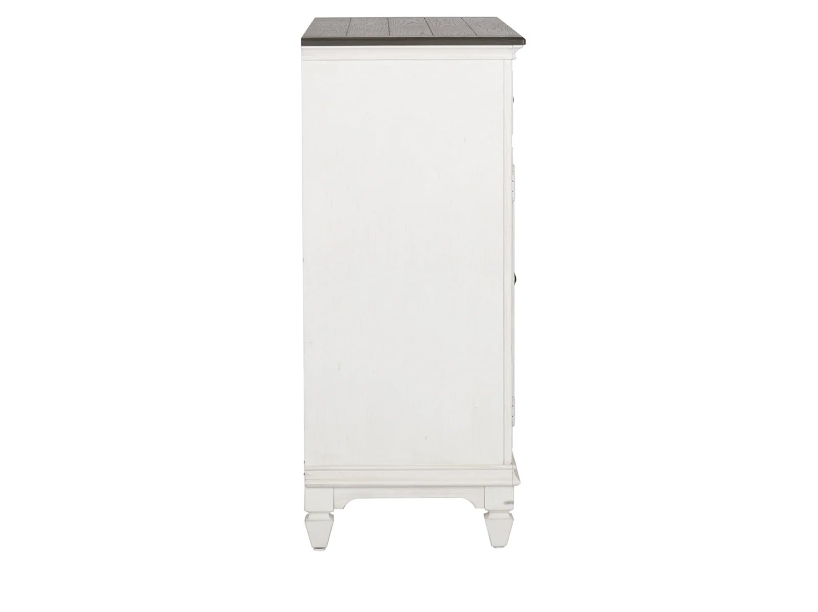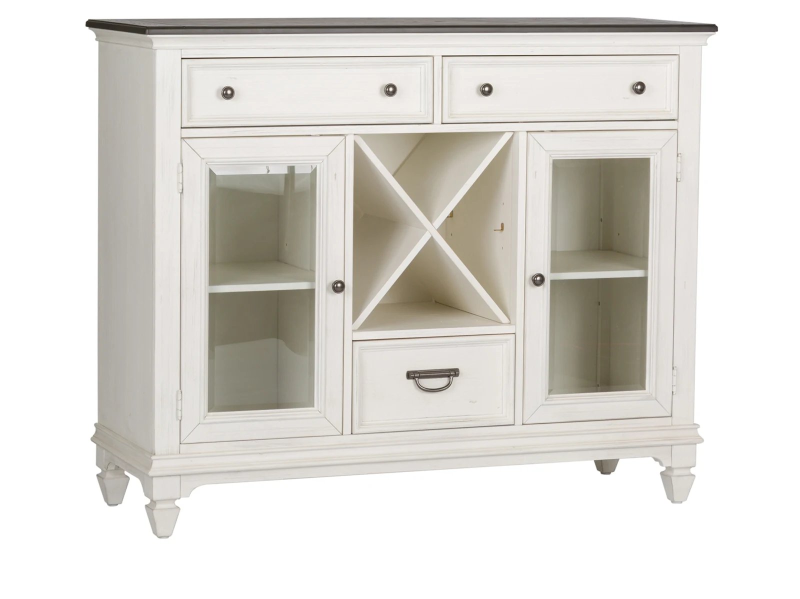 Reinvent your style with a memorable piece. The Calument Server is crafted of poplar and rubberwood solids with cathedral white oak tops and features a wire brushed charcoal planked top with a wire brushed white base that has brown undertones, all accented with antique pewter knob and drop bail hardware. This Server has an open center shelf with wine storage flanked between two wood framed glass doors. Behind each door is one adjustable shelf. Three wood framed full extension drawers round out this piece, with the top two drawers being lined with felt. The Calument Server offers cottage styles you love that will work from the beach to the mountains to an industrial loft.