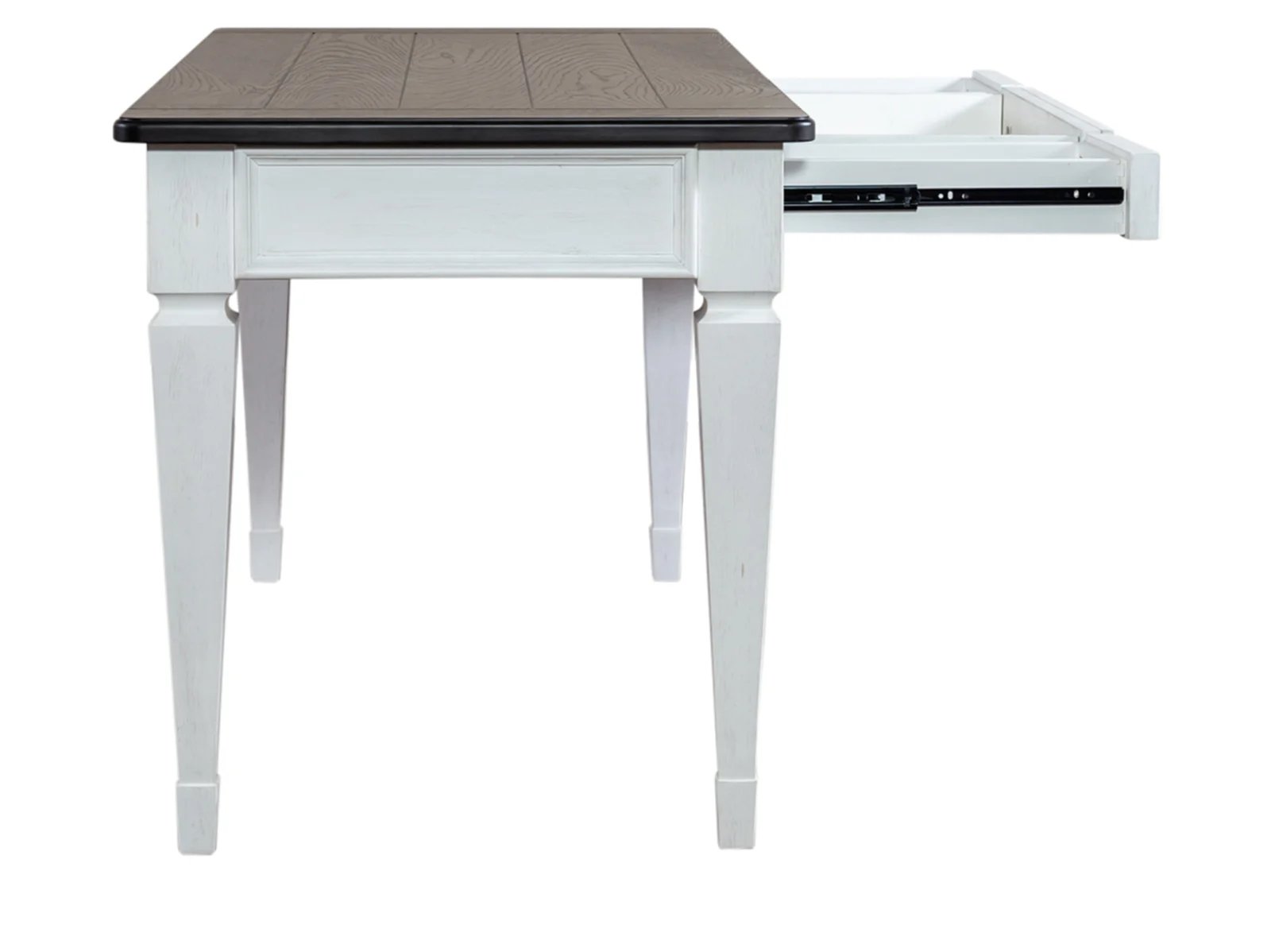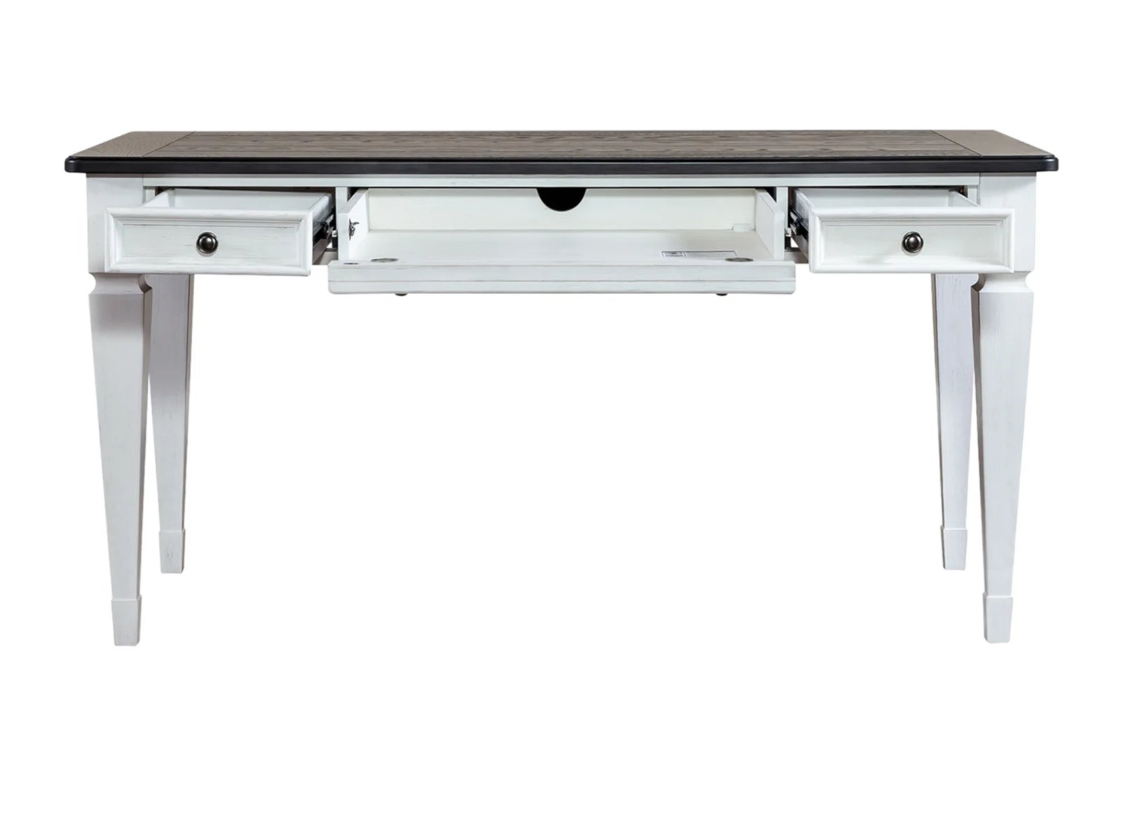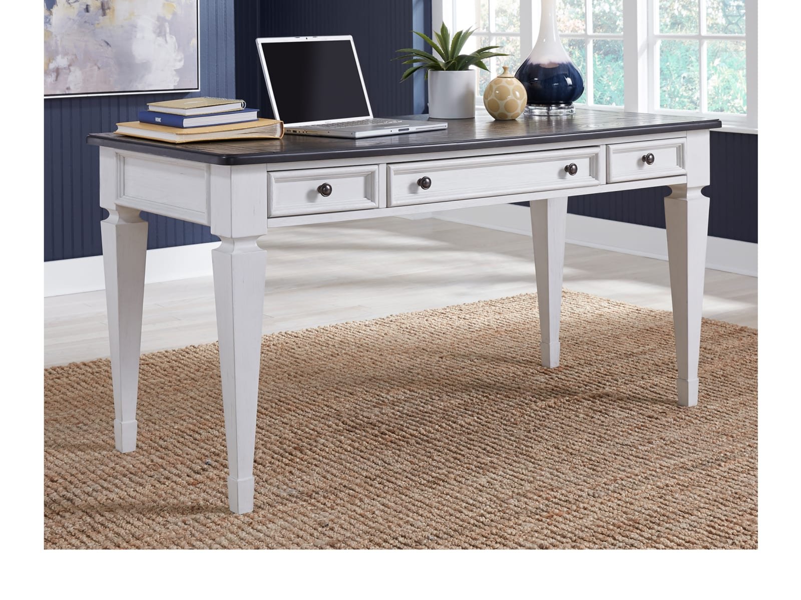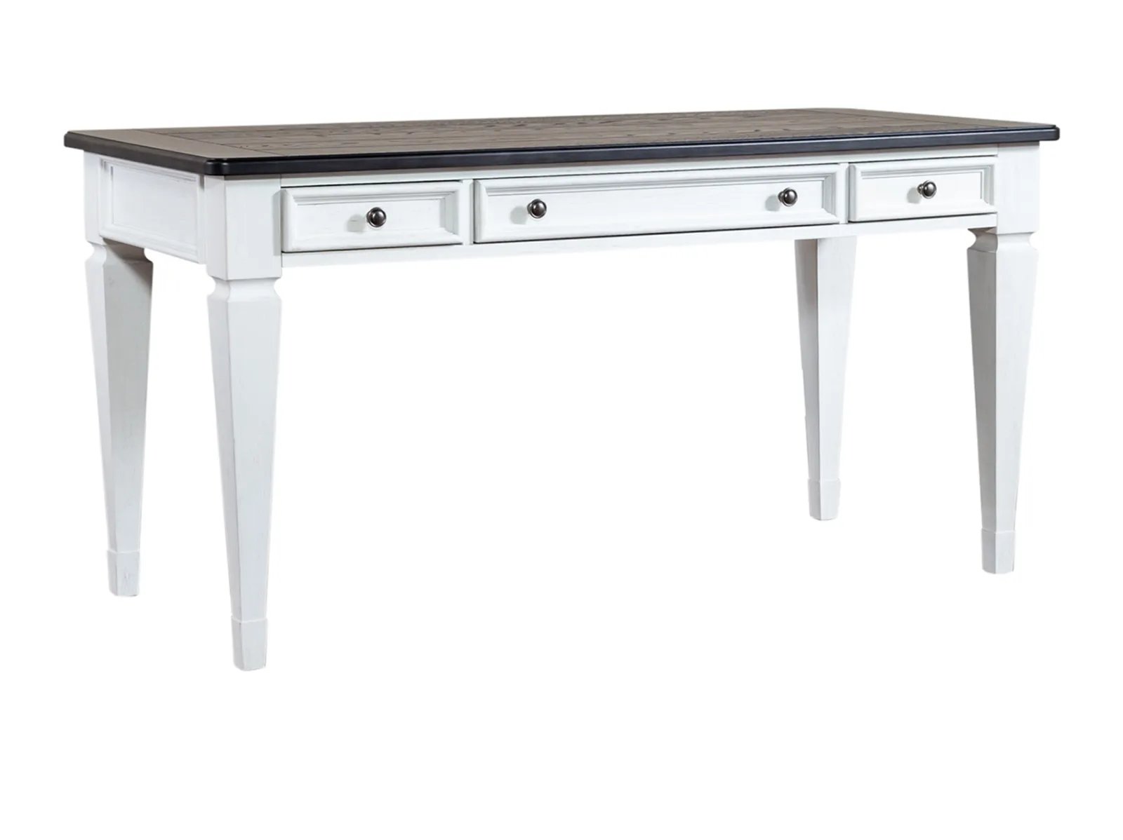 & Free ShippingReinvent your style with a memorable piece. The Calument Writing Desk is crafted of pine solids with cathedral white oak tops and pine veneer fronts. This piece features a wire brushed white finish with a charcoal planked top. There are three full extension wood framed drawers including a center flip down keyboard tray, anchored by square tapered legs. Create a classic look with a casual feel with the Calument writing desk.