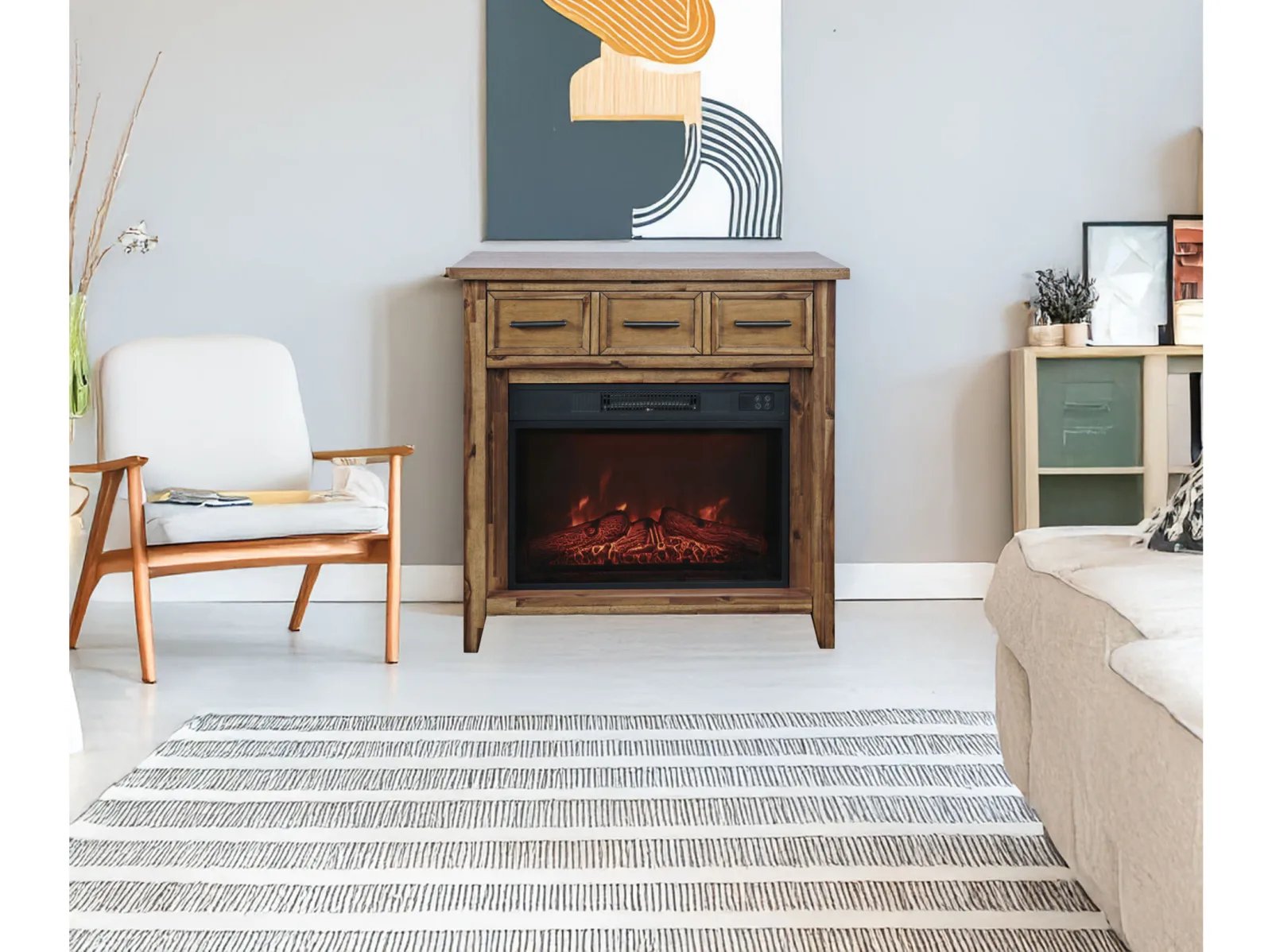 The Cambridge Transitional Rustic 32″ Electric Fireplace Wire Brushed Console TV Stand seamlessly blends rustic style with modern convenience. Made from solid Acacia and veneer, it features a distressed wire-brushed medium brown finish, adding warmth and character to any room. The built-in storage drawer, accented with vintage bar-style hardware, provides a functional space for storing media accessories or other essentials. The 1500W LED fireplace insert at the heart of the Cambridge console offers up to 5000 BTUs of heat, making it a cozy addition to your living space. The fireplace can also be enjoyed without heat, offering year-round ambiance with or without warmth. Cable management holes are thoughtfully incorporated into the design, ensuring that cords stay neat and organized when used as a TV stand or for housing electronics. With its transitional rustic charm and practical features, the Cambridge Electric Fireplace TV Stand adds both style and comfort to your home, making it an inviting focal point in any living room or media area.