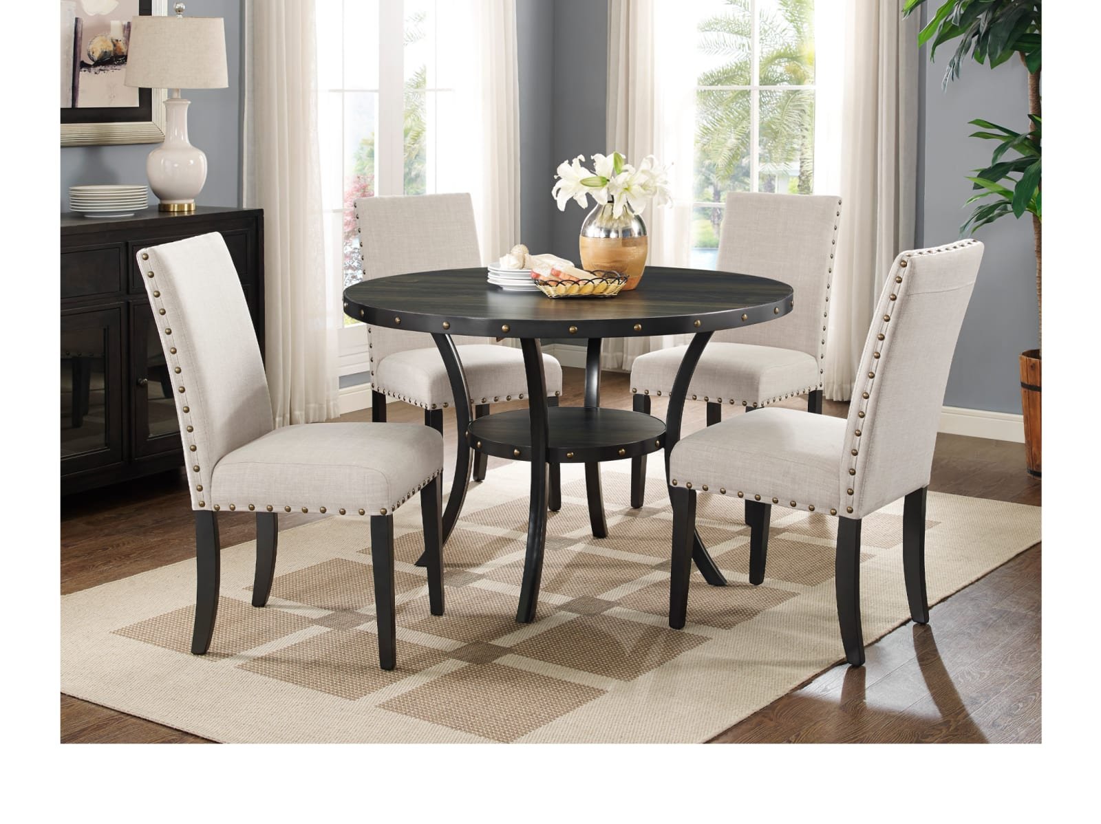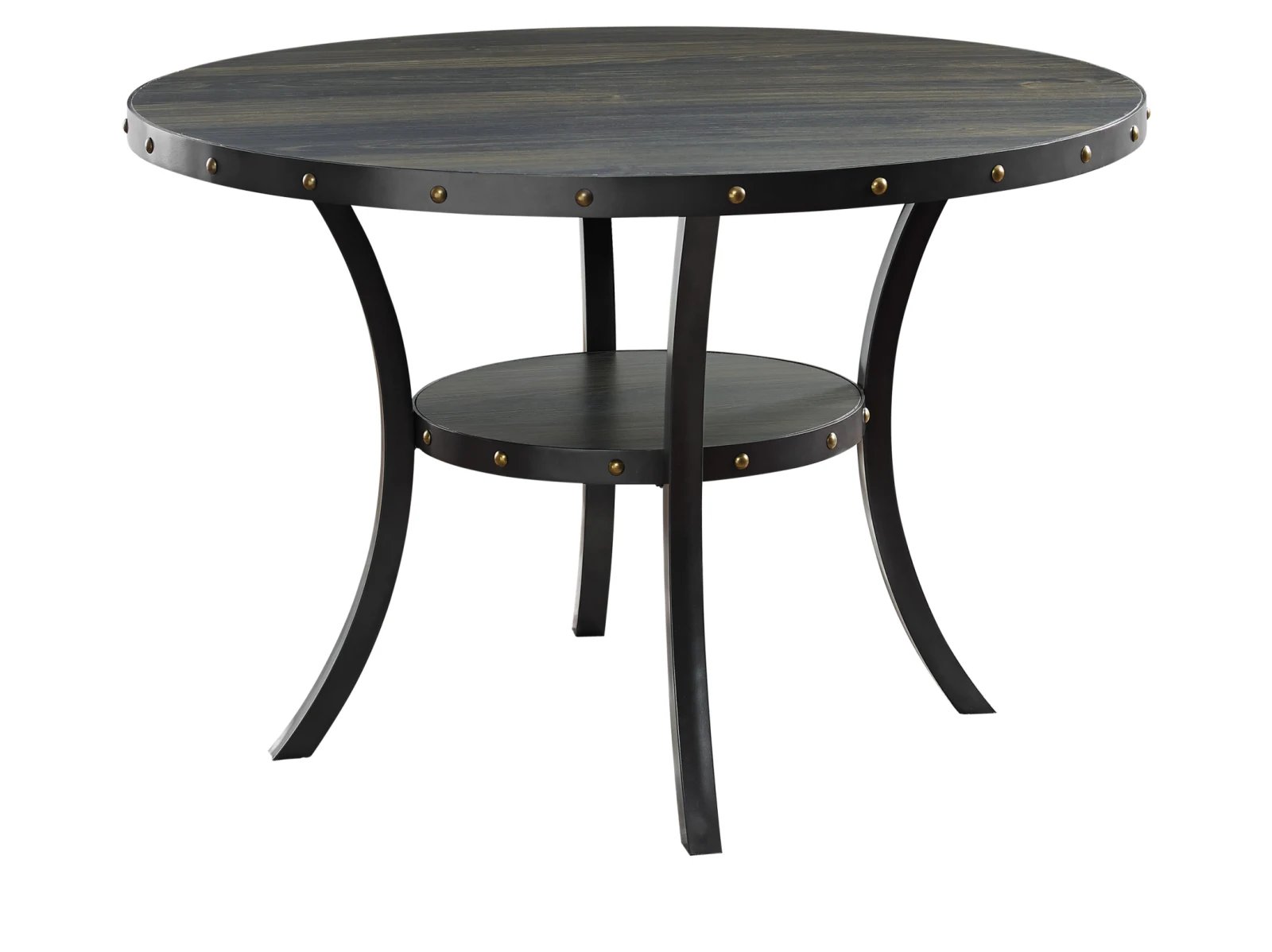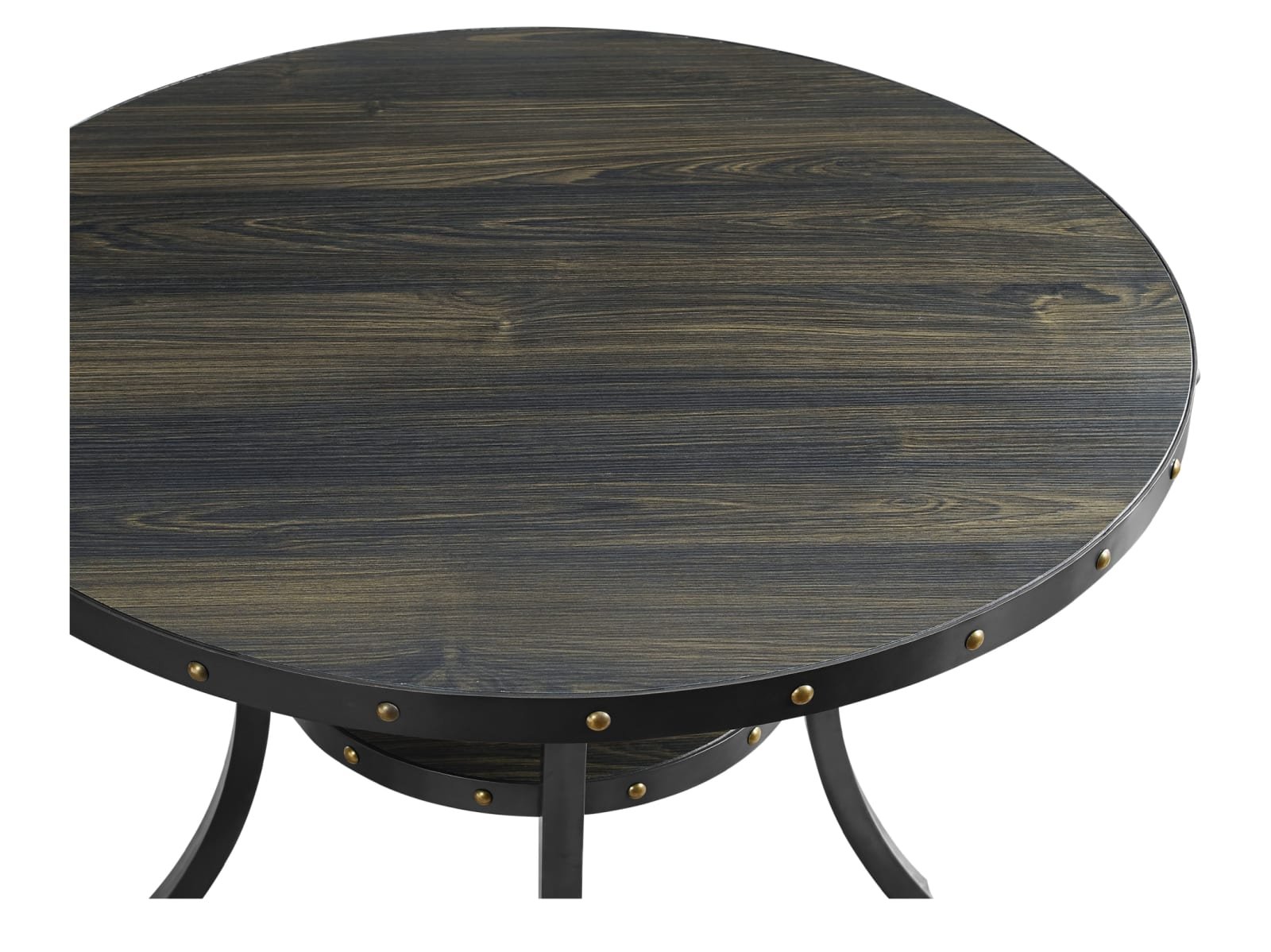 - nailhead trim around edge of table and middle shelf