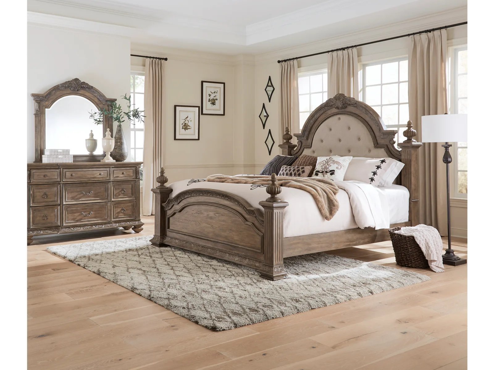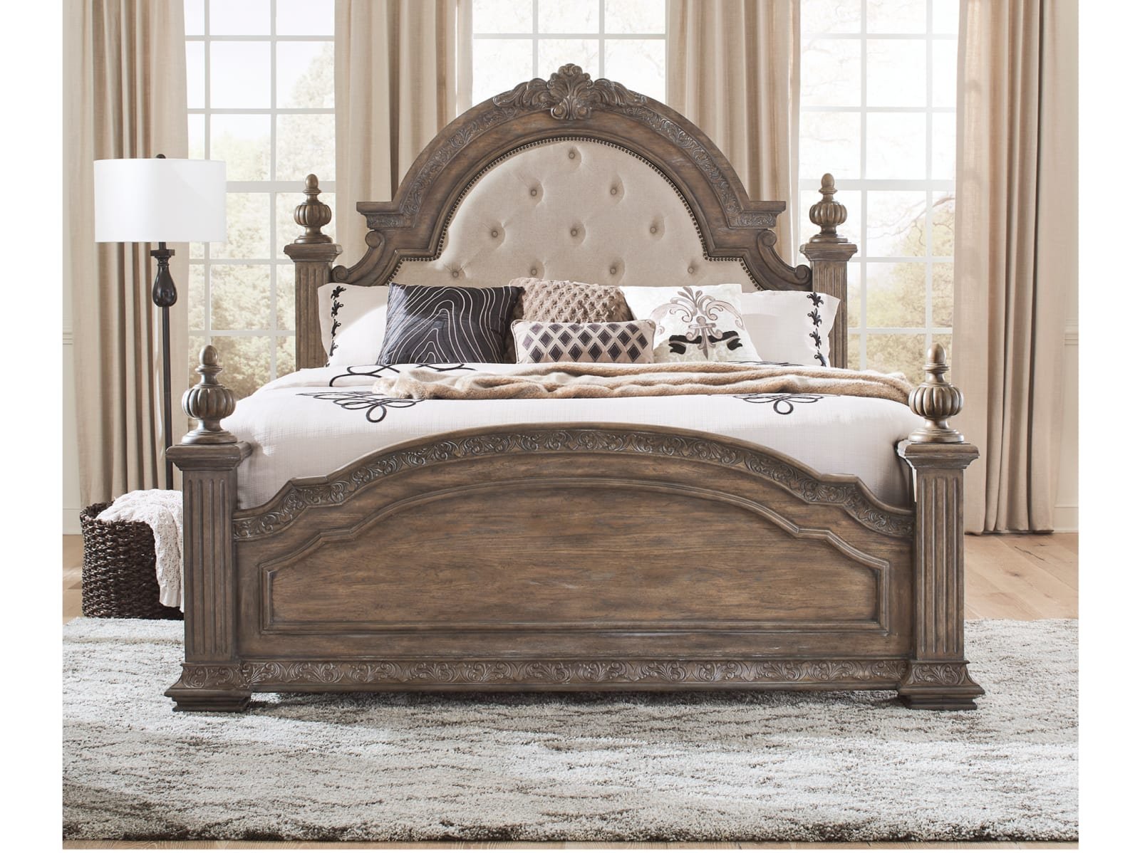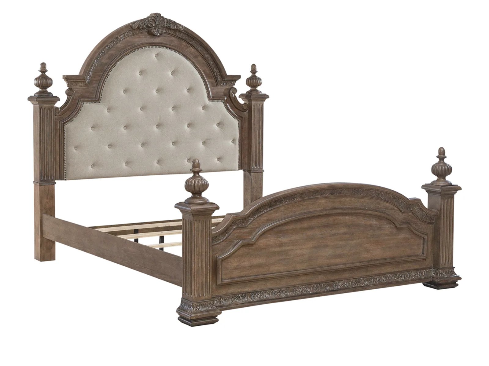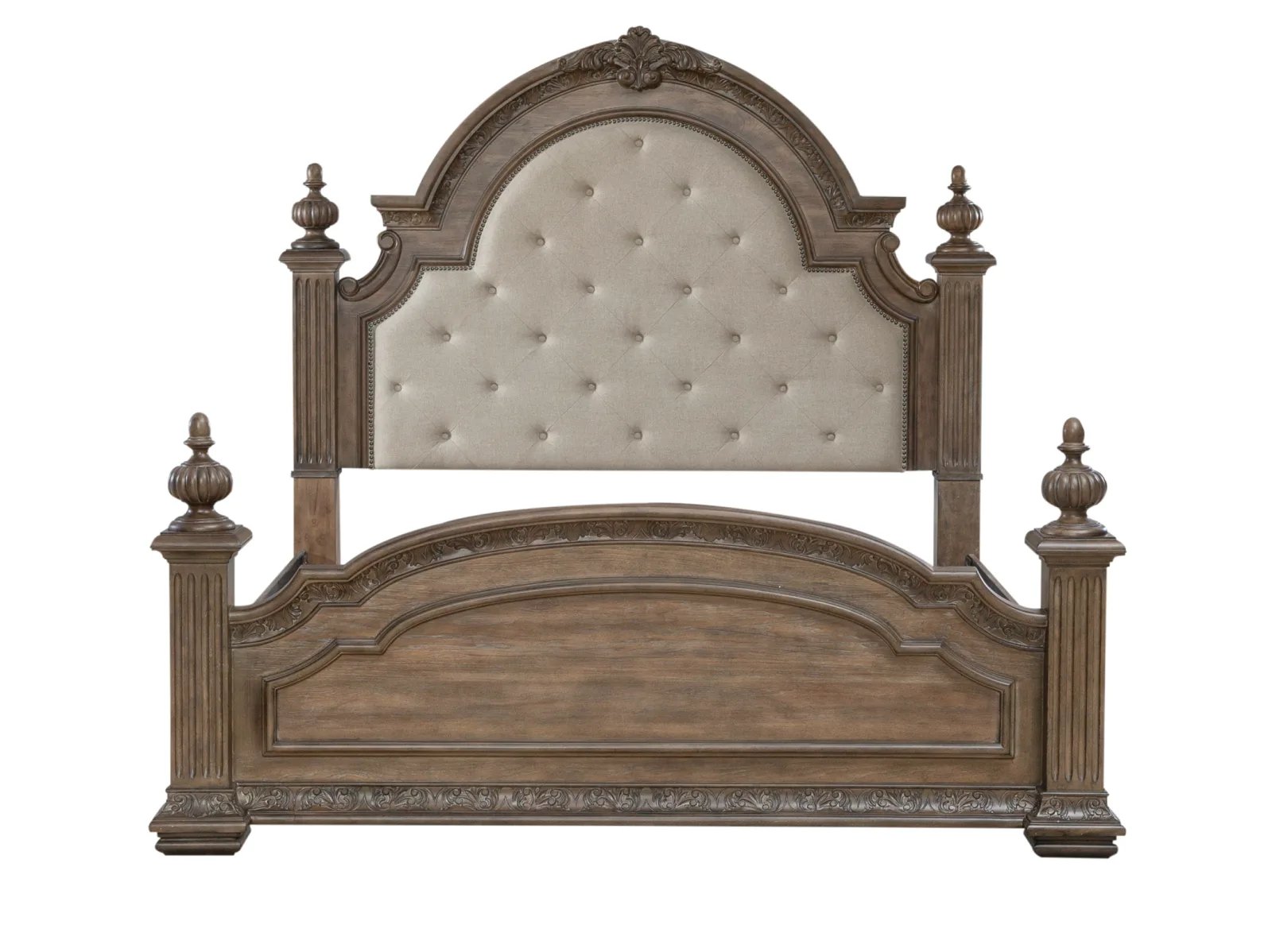 & Free ShippingIndulge in luxury with the Capitola Poster Bed. Crafted with excellence using rubberwood solids and rustic hickory veneers, this bed features a Chestnut with Gray Dusty Wax finish. Fluted square turned posts are framed with acanthus leaf carved accents along with decorative top finials. The headboard has an arched crown and is upholstered in a button tufted Sand Linen chenille fabric with a nail head trim. The top center crown is highlighted with a carved pediment. The poster footboard is arched and features bead molding and carved acanthus leaves. Use the poster bed rails which feature bolt-on support to complete the bed. Combine the grand feel of the past with today’s luxurious lifestyle with the Capitola Poster Bed.