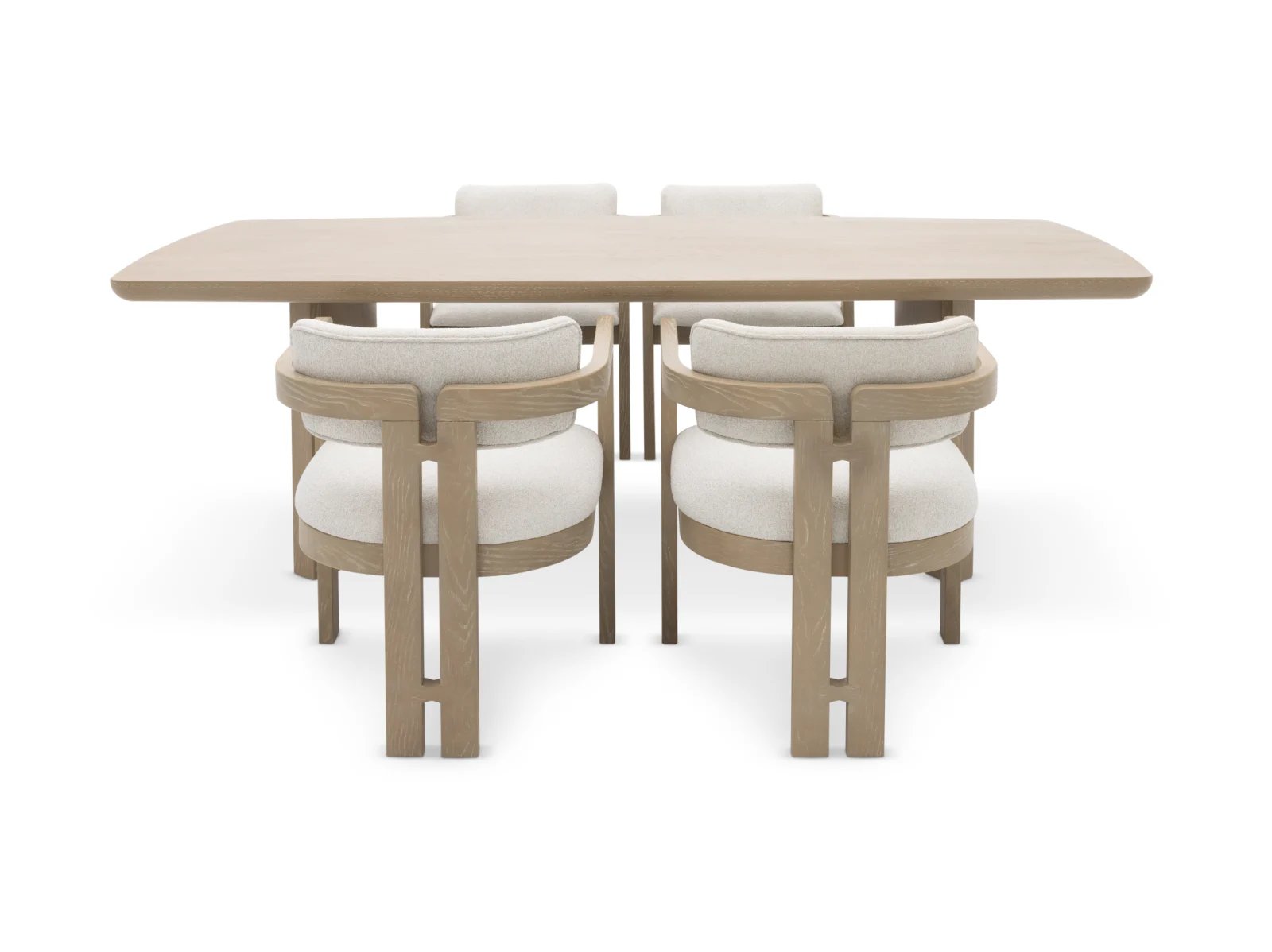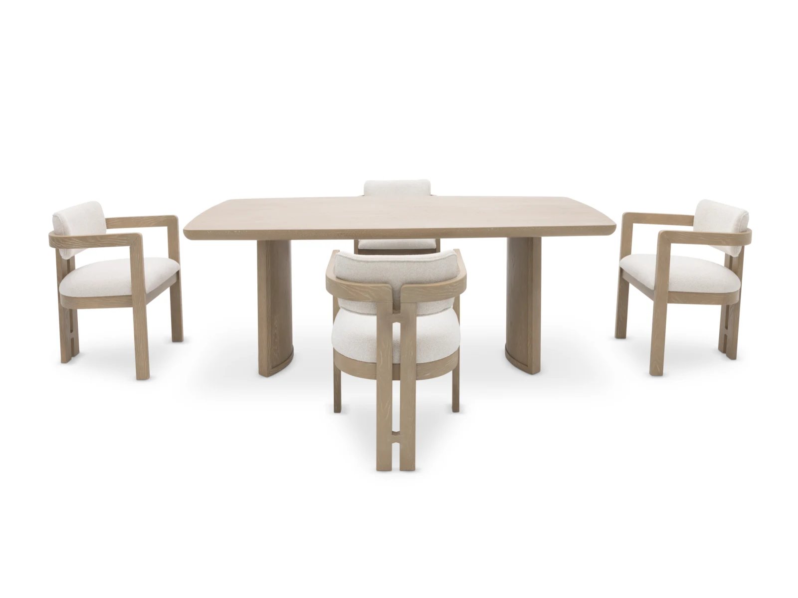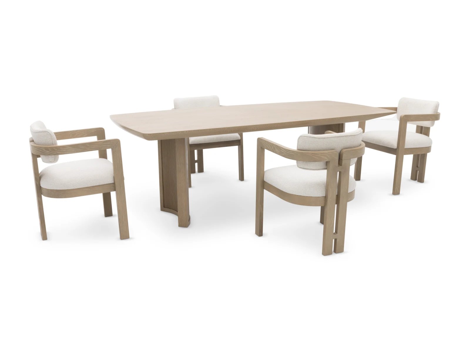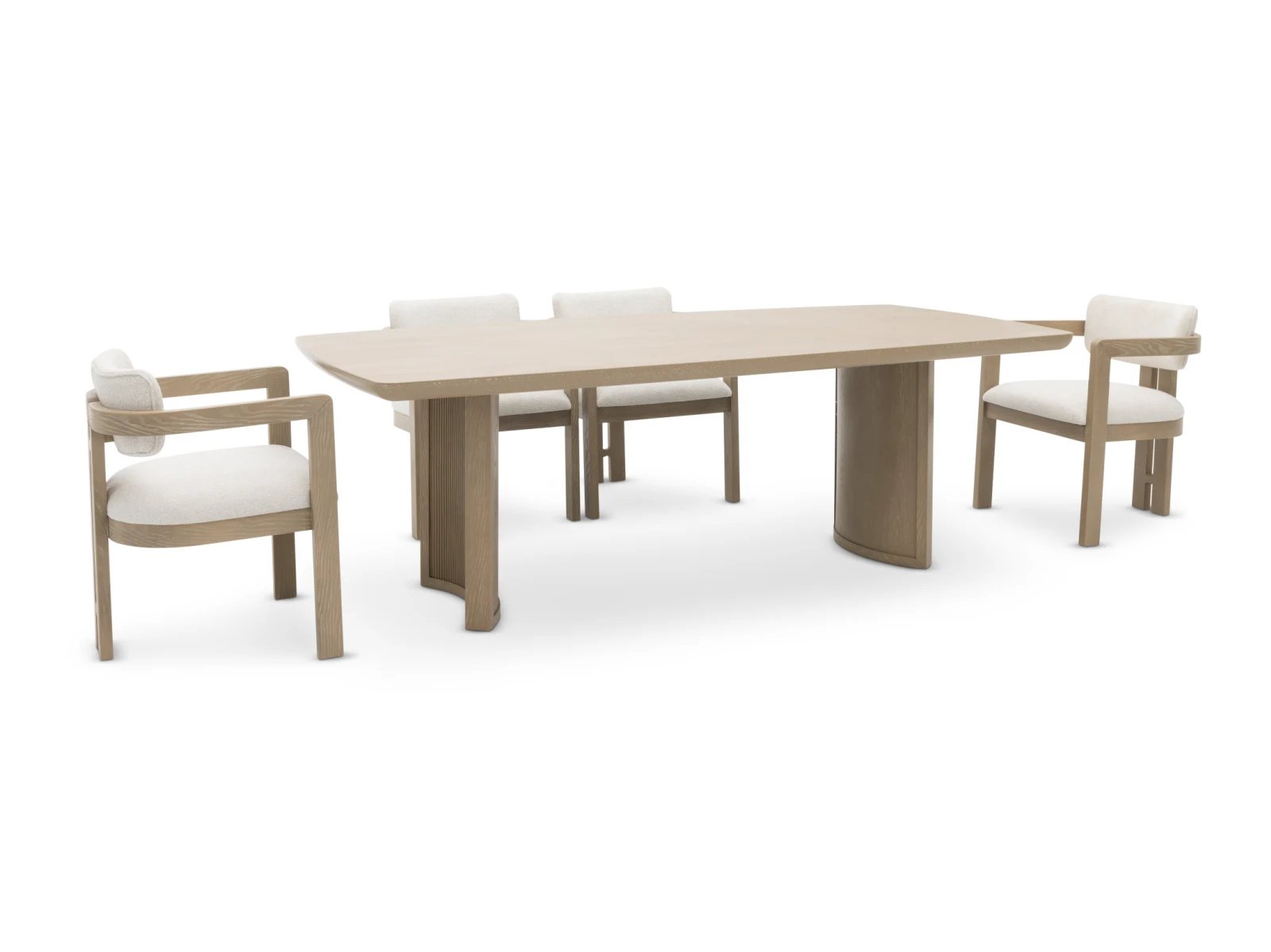 & Free ShippingThe Capri 5 Pc. Dining Set combines natural tones and textures with contemporary style elements to redefine your dining space. This set features a stunning rectangular dining table crafted from solid poplar wood and oak veneers in a natural finish, resting on a distinctive double pedestal base with reeded texture. The table is complemented by four low-profile, round dining chairs that showcase wrap-around armrests and comfy seats upholstered in an off-white fabric. For a winning combination of sophistication and versatility, you can’t go wrong with the Capri 5 Pc. Dining Set.