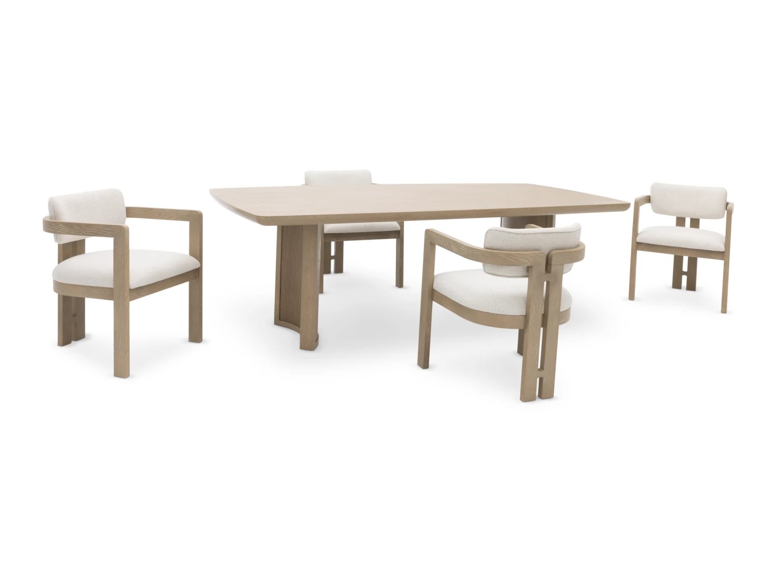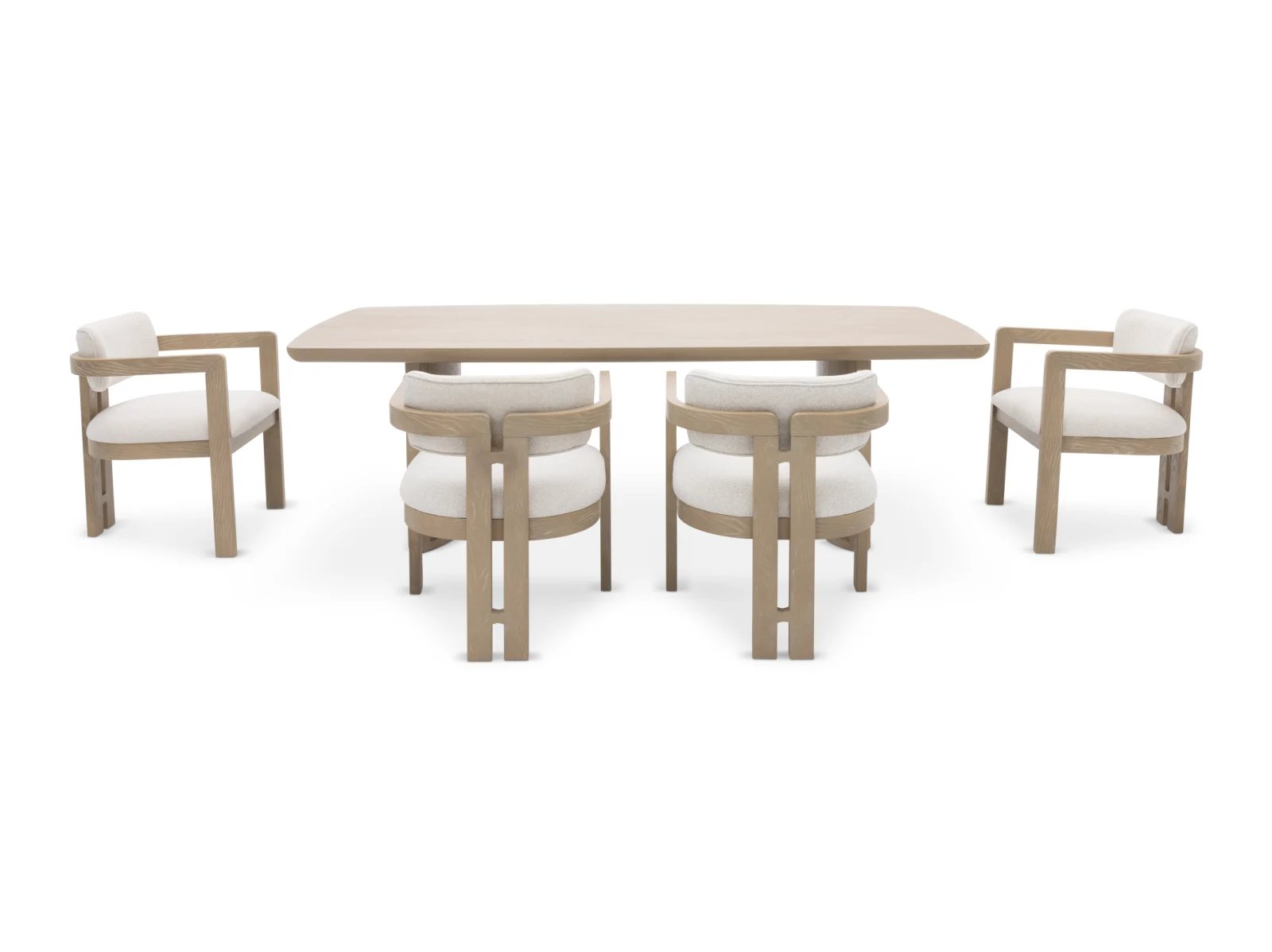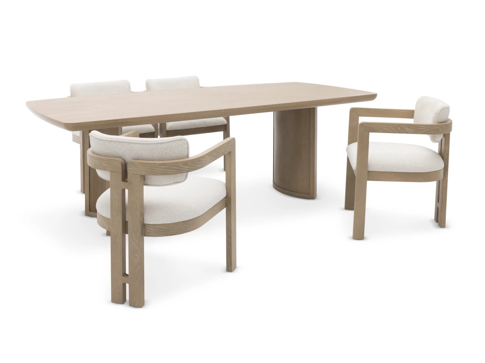& Free ShippingThe Capri 5 Pc. Dining Set combines natural tones and textures with contemporary style elements to redefine your dining space. This set features a stunning rectangular dining table crafted from solid poplar wood and oak veneers in a natural finish, resting on a distinctive double pedestal base with reeded texture. The table is complemented by four low-profile, round dining chairs that showcase wrap-around armrests and comfy seats upholstered in an off-white fabric. For a winning combination of sophistication and versatility, you can’t go wrong with the Capri 5 Pc. Dining Set.