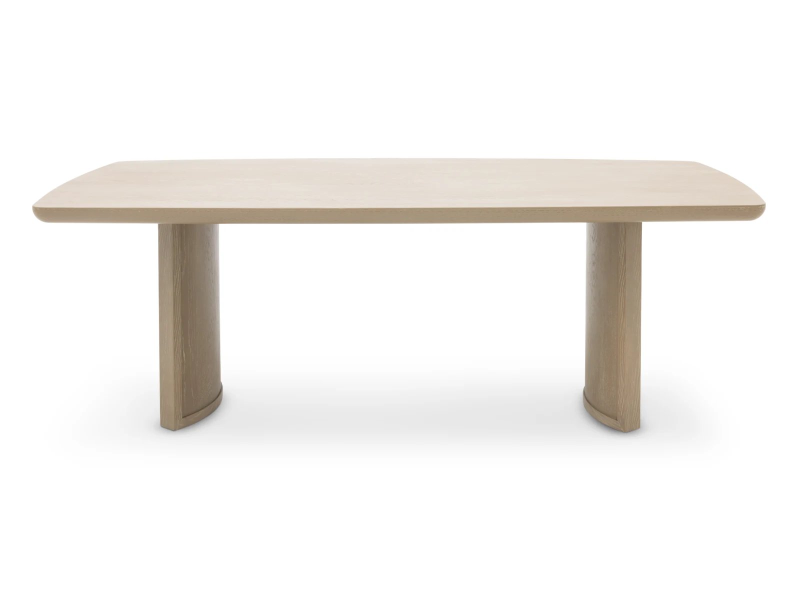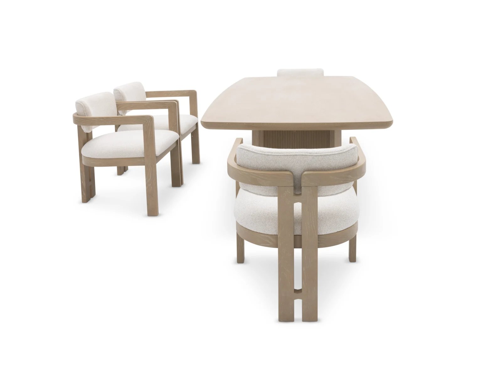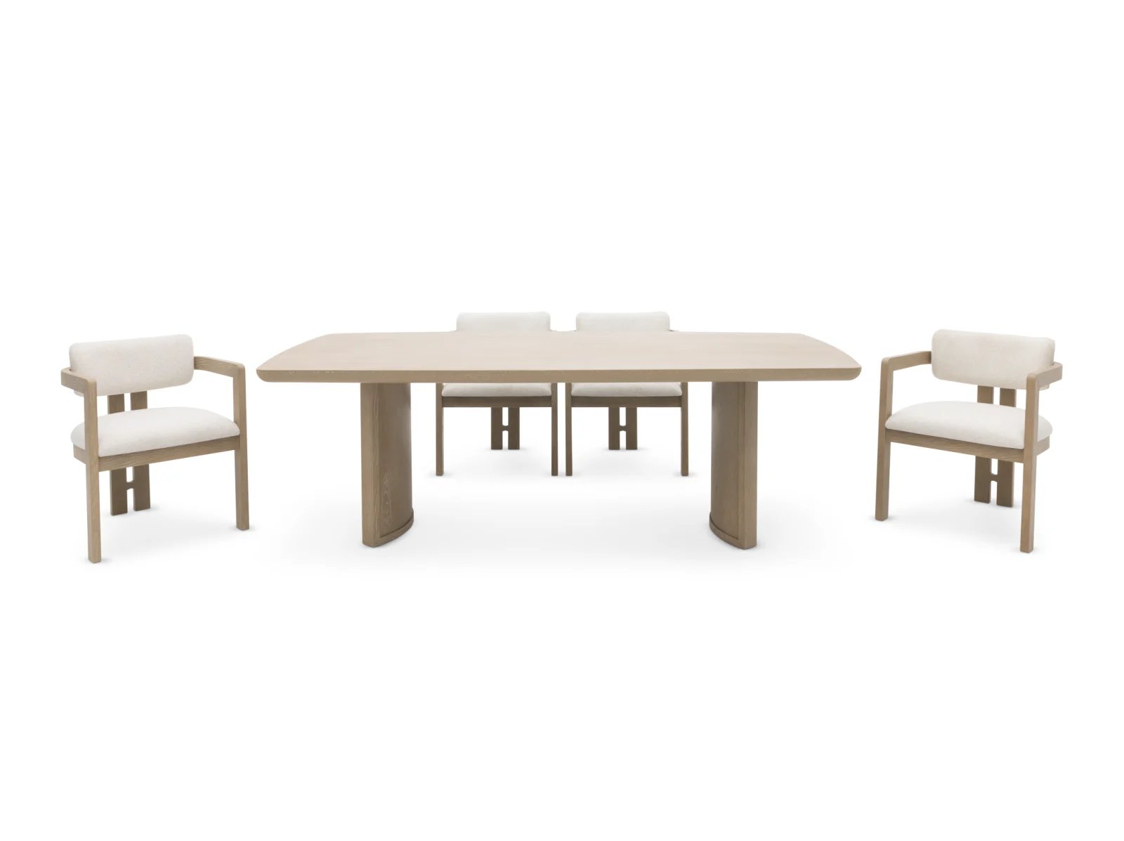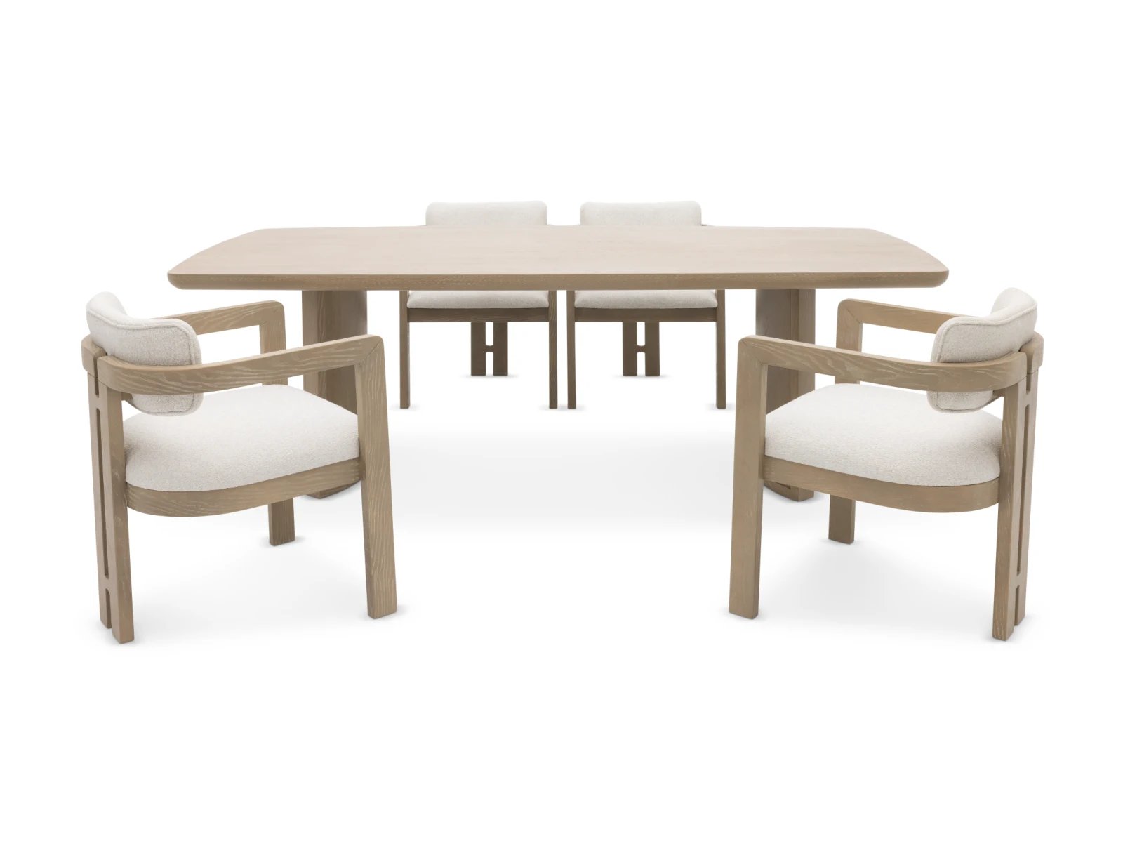 & Free ShippingThe Capri 5 Pc. Dining Set combines natural tones and textures with contemporary style elements to redefine your dining space. This set features a stunning rectangular dining table crafted from solid poplar wood and oak veneers in a natural finish, resting on a distinctive double pedestal base with reeded texture. The table is complemented by four low-profile, round dining chairs that showcase wrap-around armrests and comfy seats upholstered in an off-white fabric. For a winning combination of sophistication and versatility, you can’t go wrong with the Capri 5 Pc. Dining Set.
