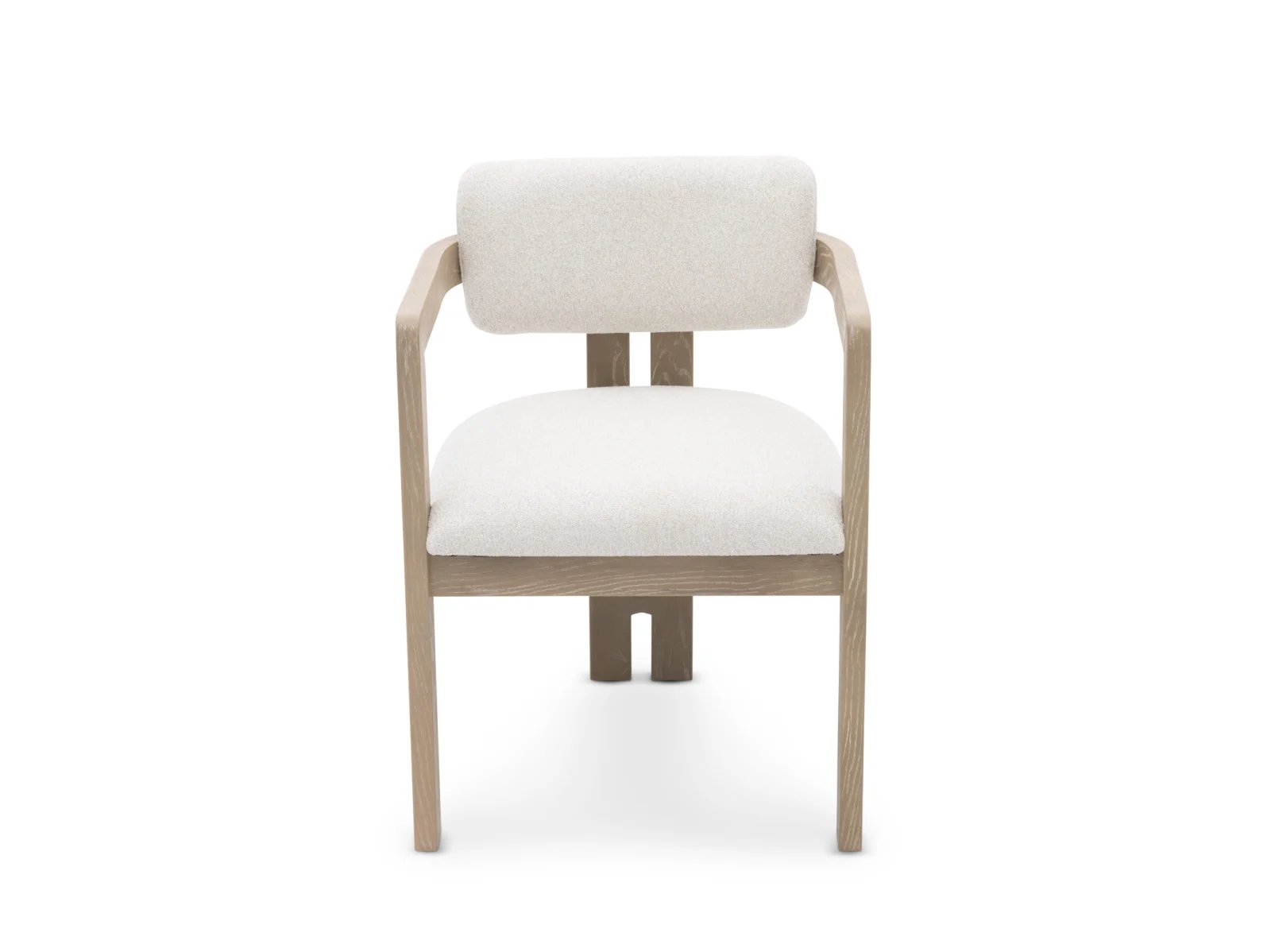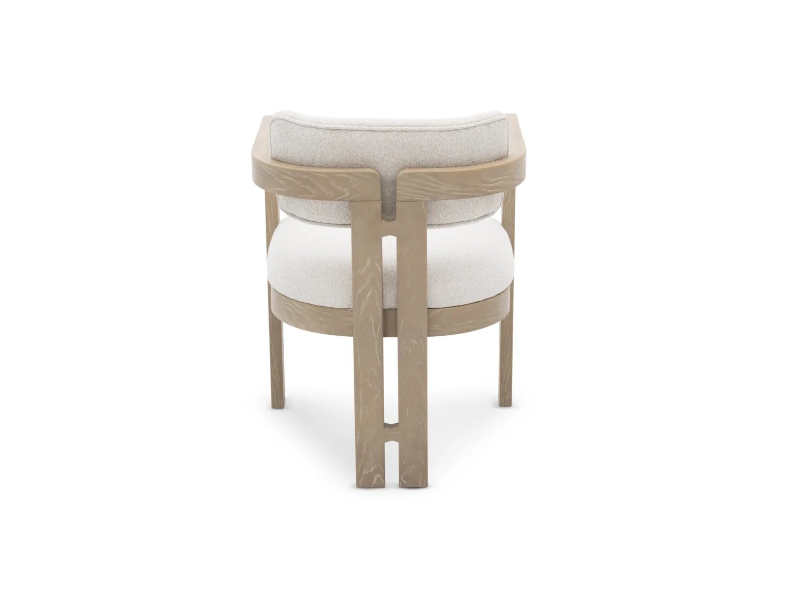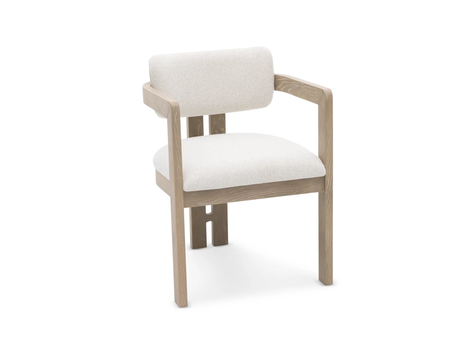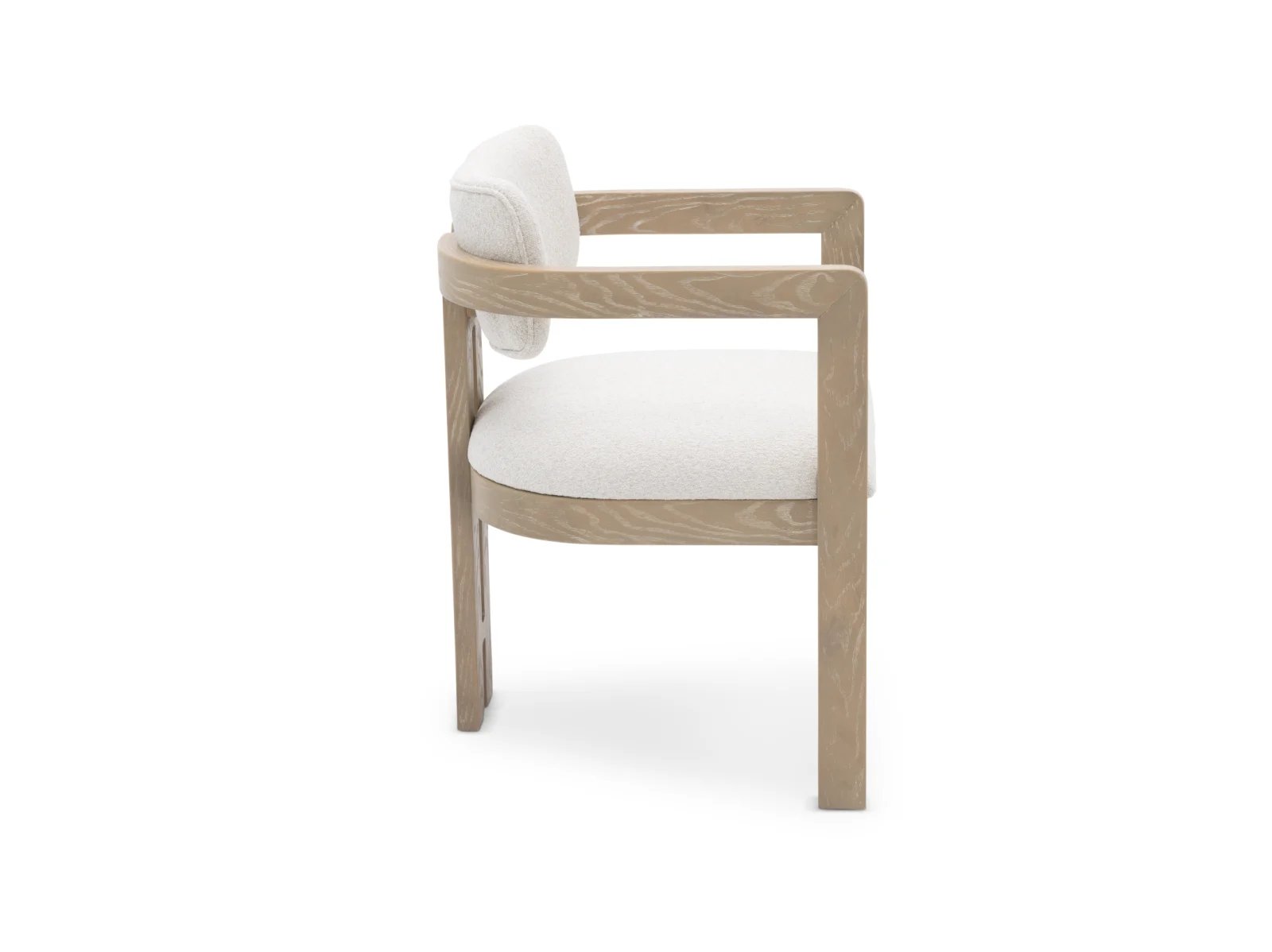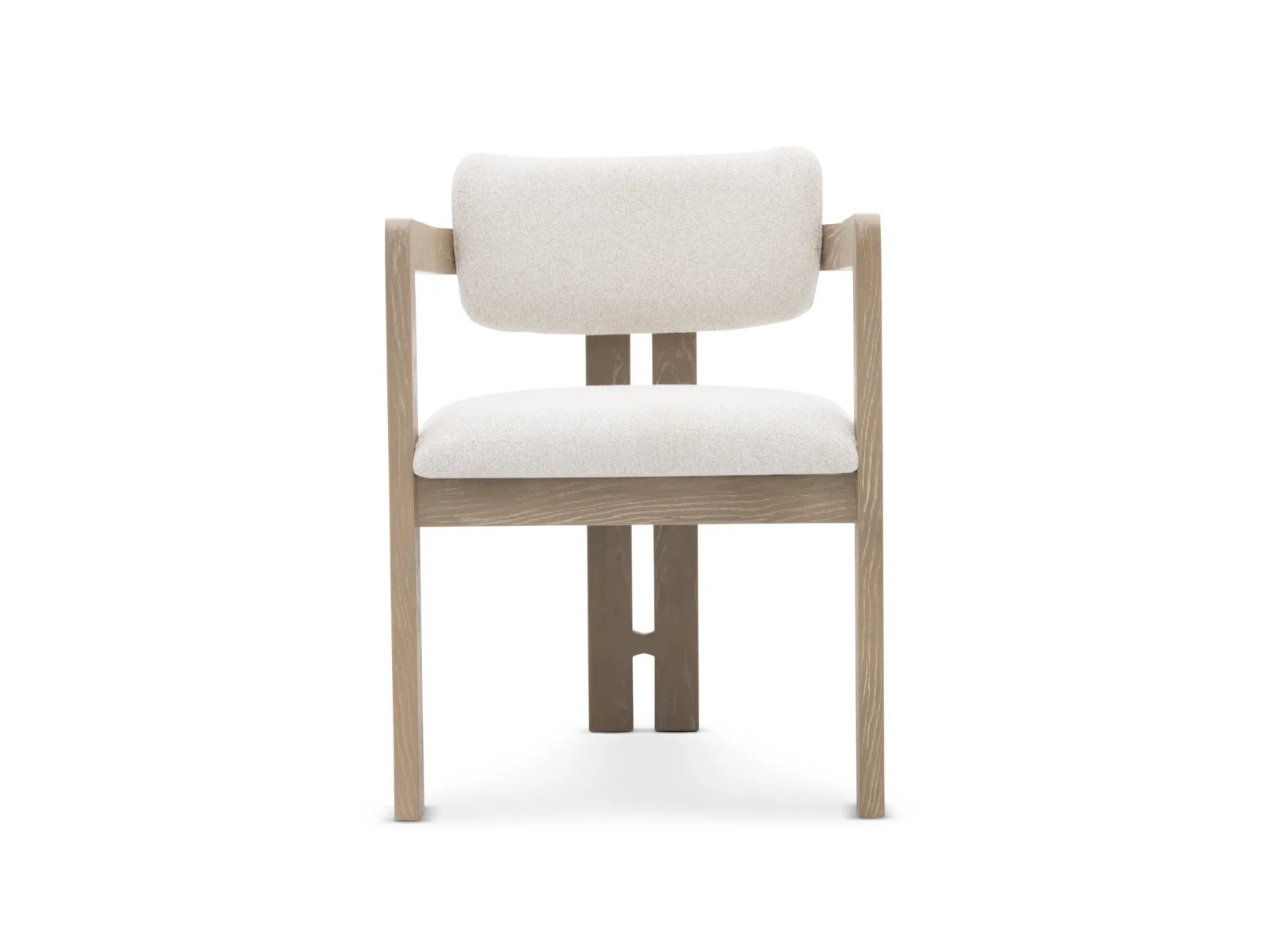 The Capri Dining Chair exudes comfort and sophistication with its perfect balance of laid-back yet elegant style. This chair is composed of solid poplar wood and oak veneers, boasting an airy wooden texture that complements contemporary and transitional interiors alike. Designed with a continuous arm that gracefully wraps around the backrest, it creates a seamless blend of curvaceous style and effortless support. The off-white upholstery on the seat and back complements the natural wood finish, emphasizing its organic charm. Perfect for relaxed dining experiences, the Capri Dining Chair brings an easygoing opulence to your table.