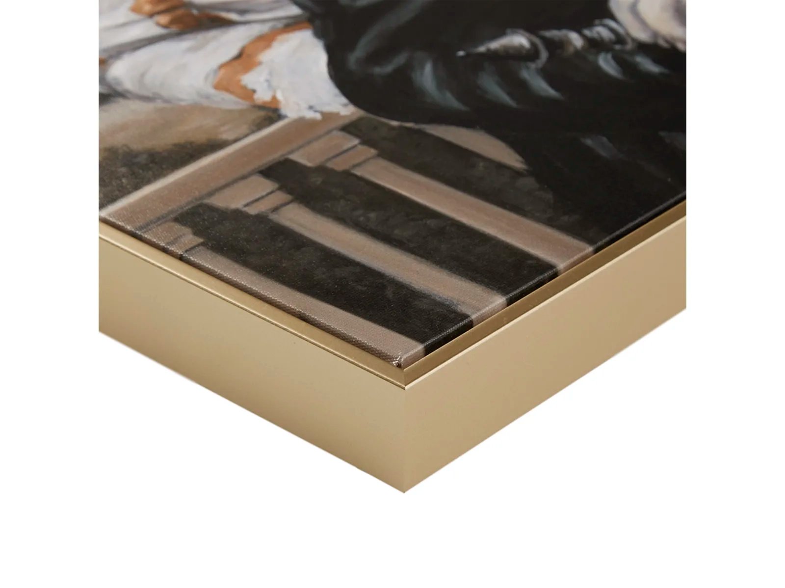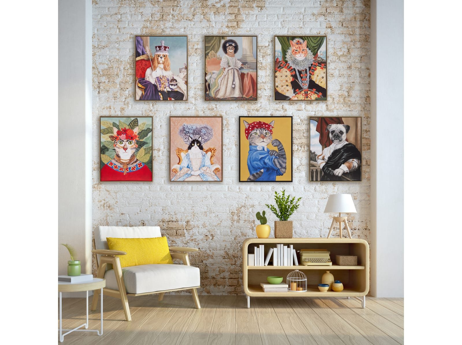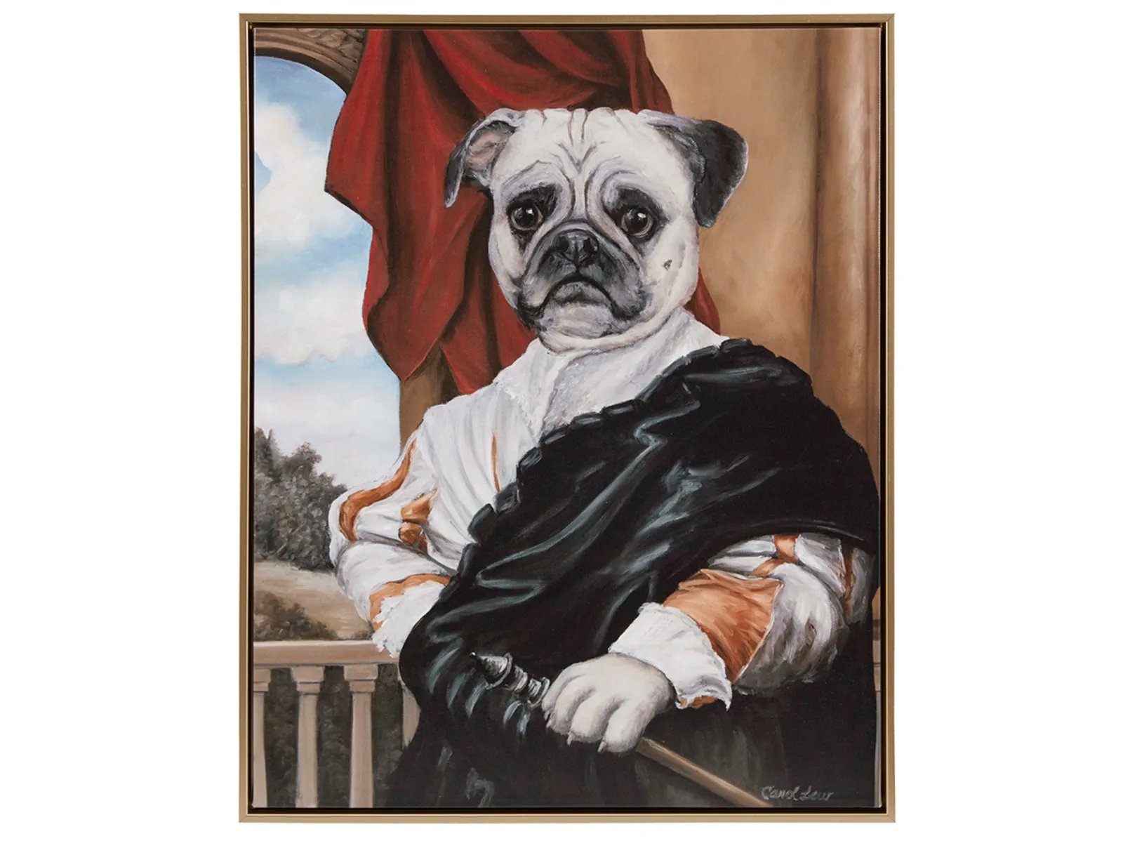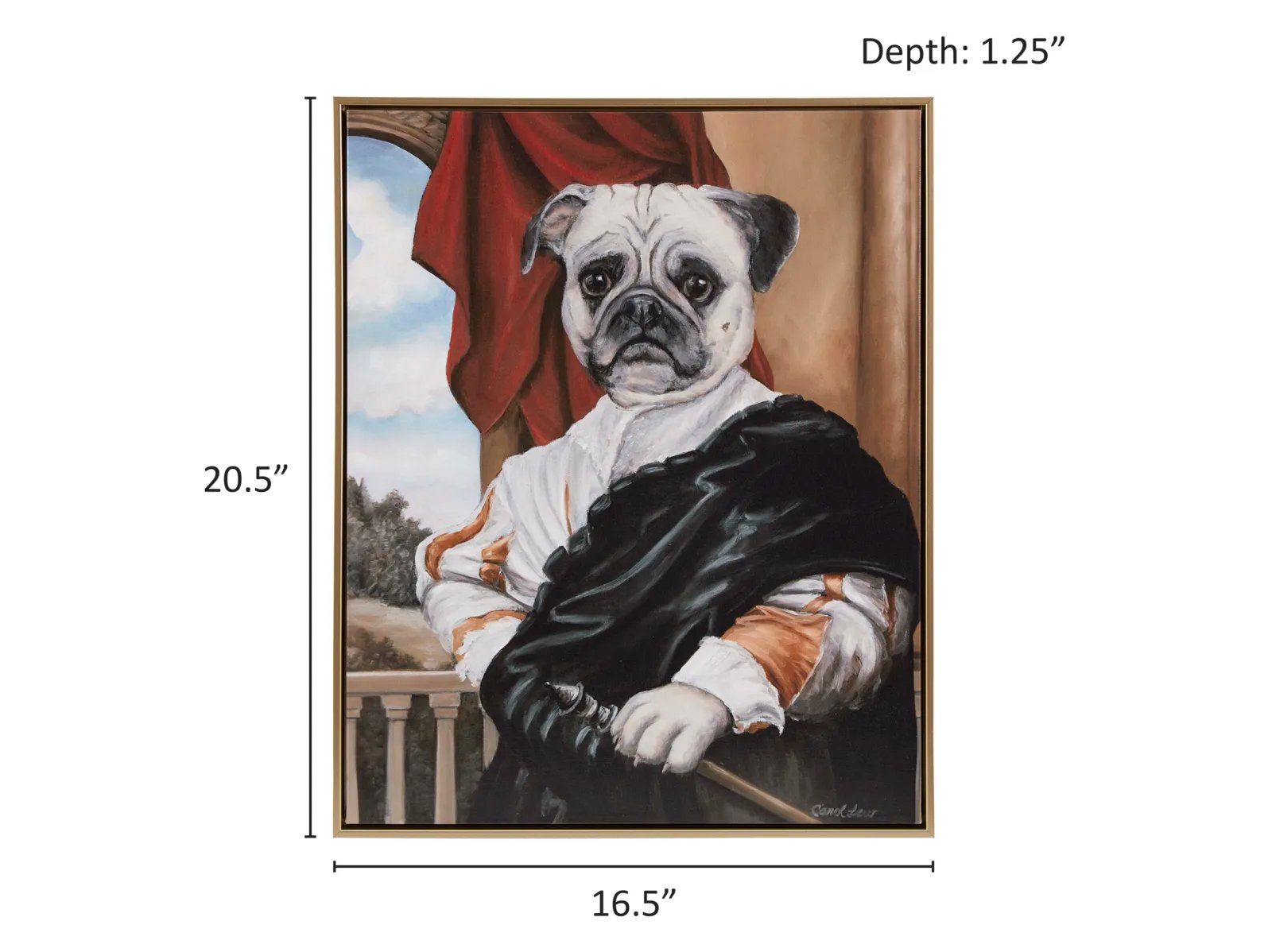 Add a touch of whimsical charm and regal elegance to your home with the Captain Pug Pet Portrait Framed Canvas Wall Art. This captivating 16.5″W x 20.5″H portrait features a charming pug dressed in a stately, imperial-style toga, bringing a unique blend of classical grandeur and canine charm to any room. The artwork is printed on high-quality canvas and framed in a sophisticated gold frame with a refined micro-texture embossing, adding a touch of luxury to your décor. Easy to hang with pre-installed D-ring hangers, this delightful piece is perfect for adding personality and a touch of humor to your bedroom, living room, or study. For indoor use only.