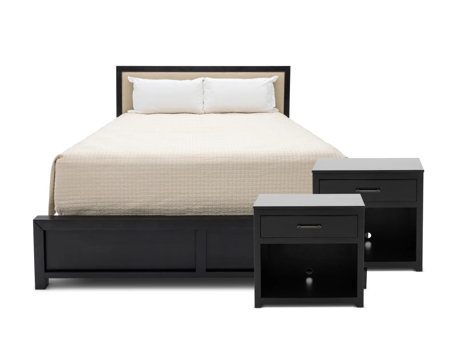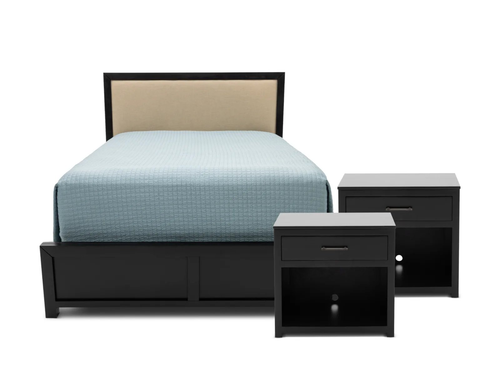 & Free ShippingRestyle your bedroom with the Carbon 3 Pc. Bedroom Set, featuring an upholstered panel bed and two nightstands. With its pine wood construction, this bold bedroom set boasts longevity and durability for years of loving use. The panel bed boasts a panel headboard with a beige upholstered insert for added comfort and style. Both nightstands include ample storage with smooth drawers and open shelving. It all comes together in an intense black finish with antique brass hardware that balances the Carbon’s contemporary aesthetic. For a set that’s versatile and striking, choose the Carbon 3 Pc. Bedroom Set.