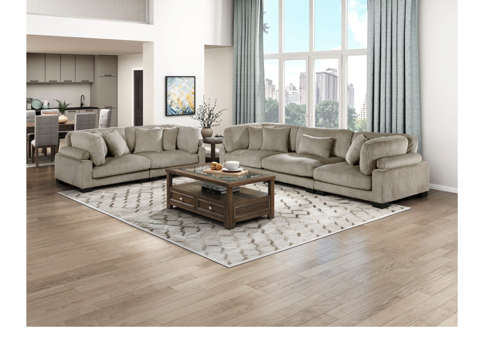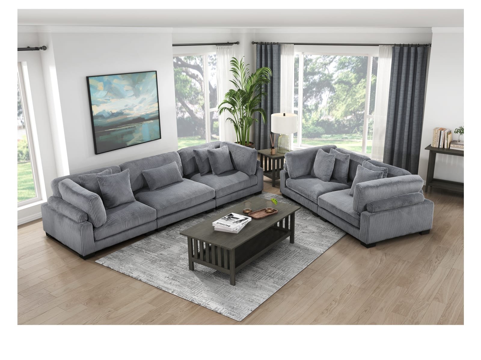 Configurable to your available space, the Cedric Collection allows for the addition and detachment of pieces for a customized seating experience. The sofa configuration consists of two corner units paired with a centrally placed armless chair. The gray corduroy fabric upholstery creates a plush expanse for a soft touch experience. The corner seat features two toss pillows, adjustable back and arm rest, and reversible cushions. The armless chair features a lumbar pillow, and reversible cushions.