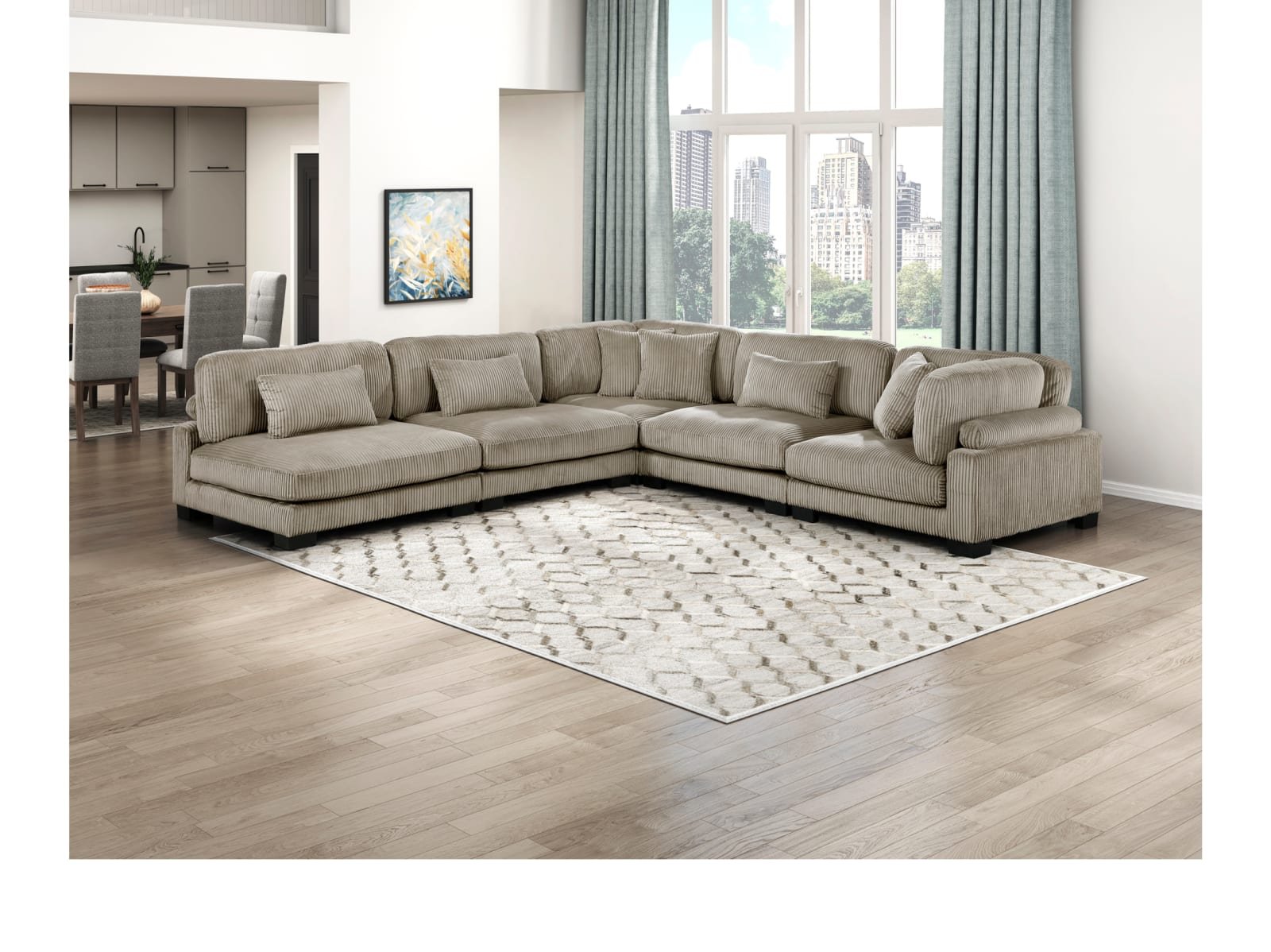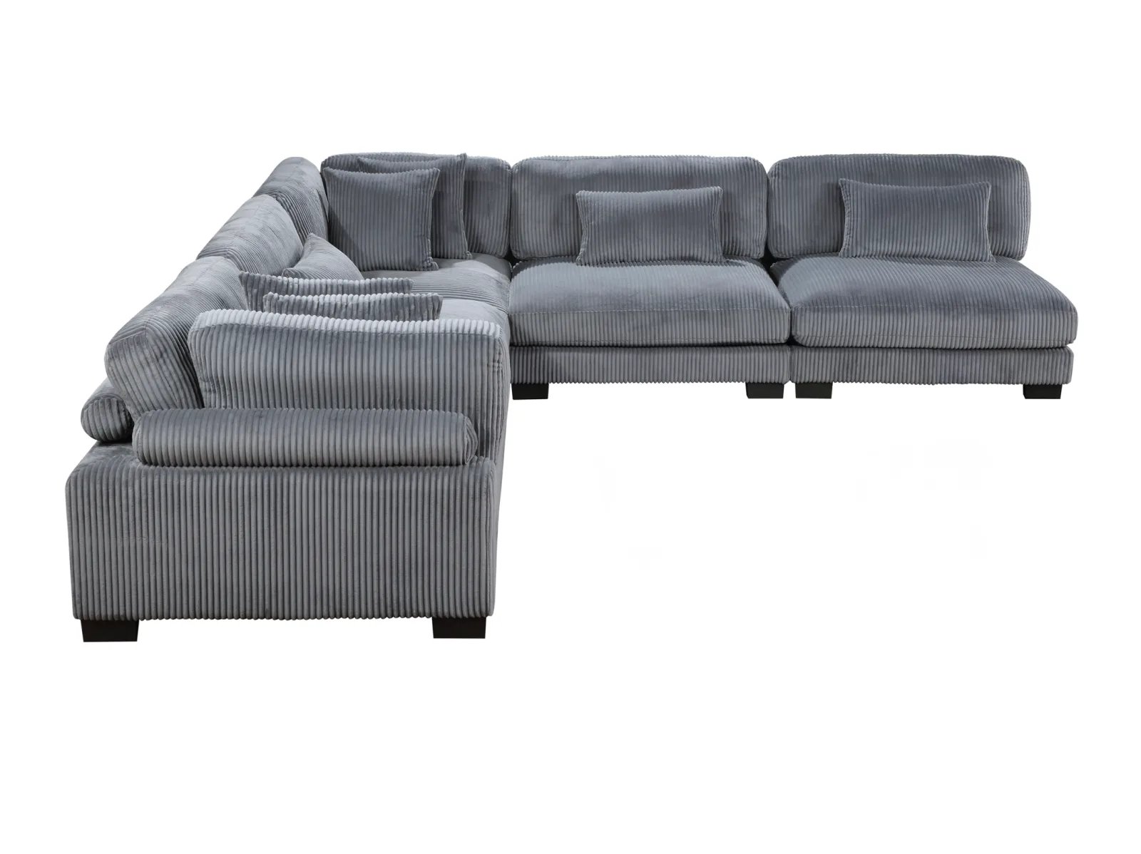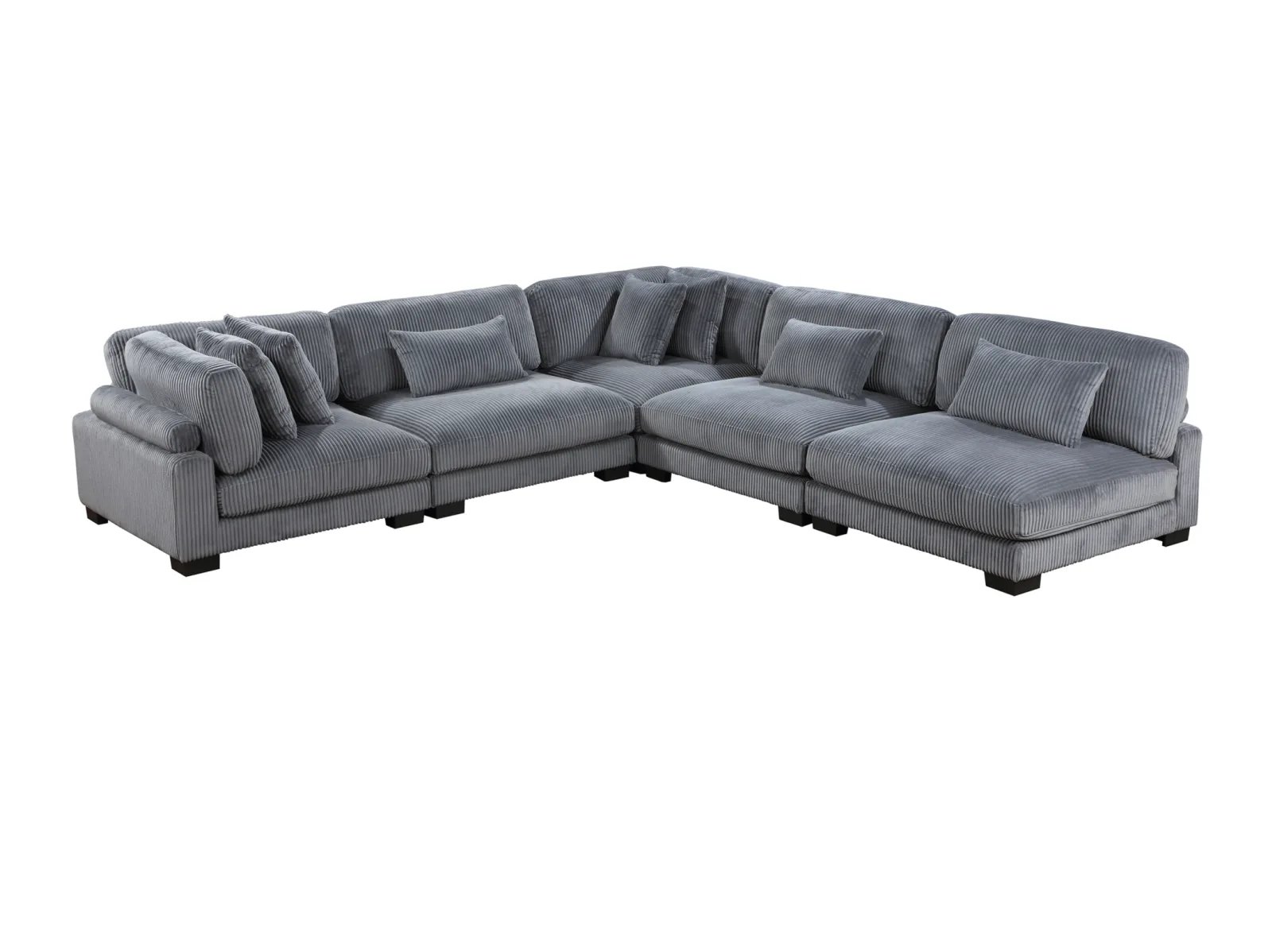 Configurable to your available space, the Cedric Collection allows for the addition and detachment of pieces for a customized seating experience. The 5-piece sectional configuration consists of two corner units paired with three armless chairs. The gray corduroy fabric upholstery creates a plush expanse for a soft touch experience. The corner seat features two toss pillows, adjustable back and arm rest, and reversible cushions. The armless chair features a lumbar pillow, and reversible cushions.