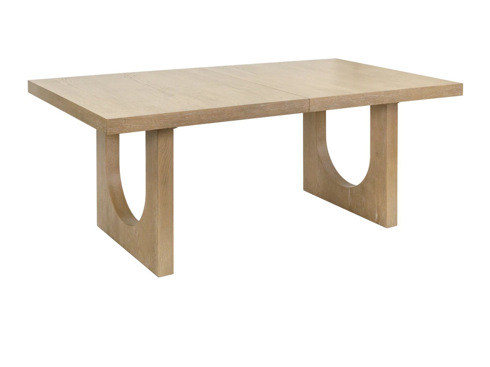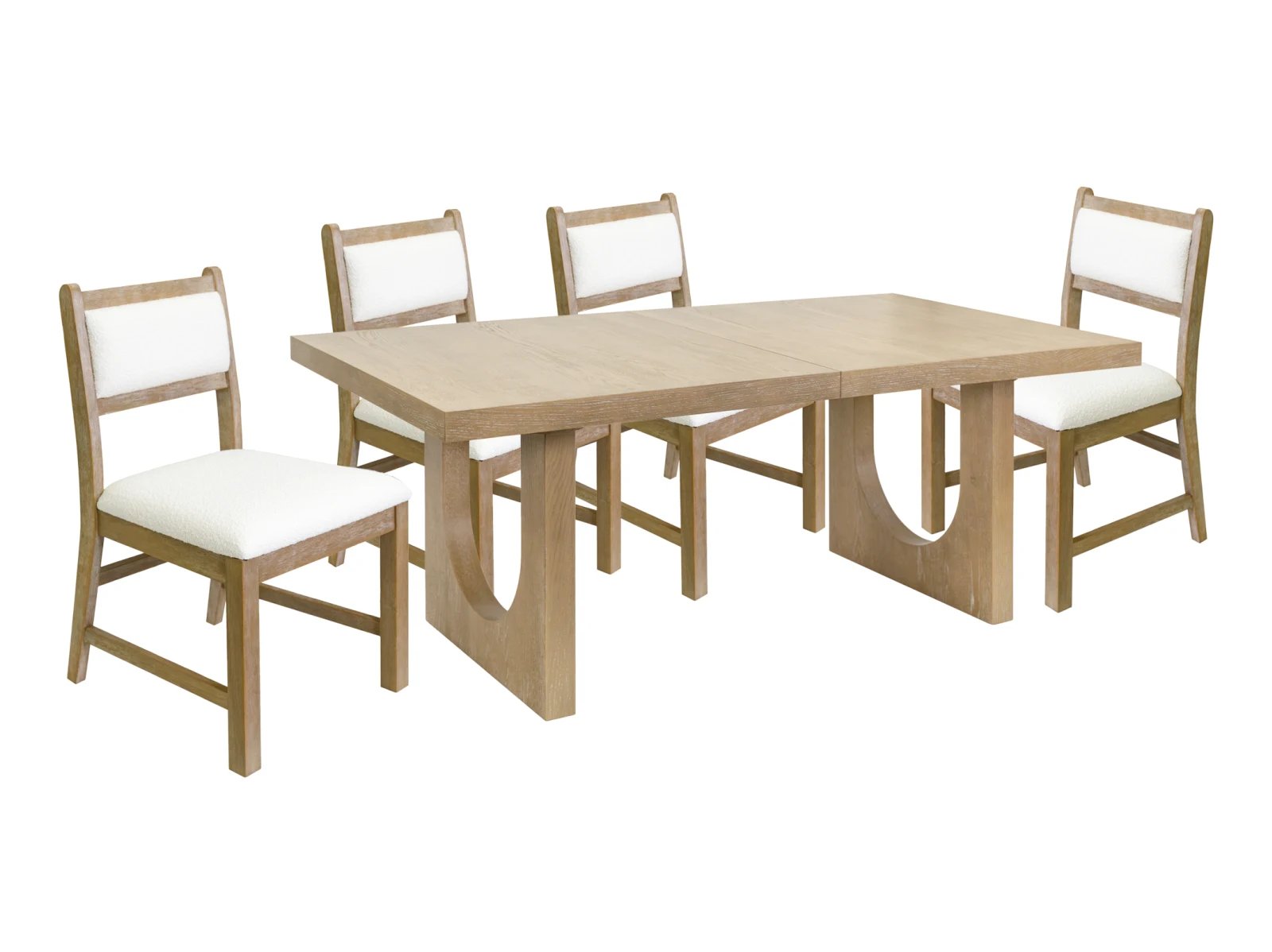 Blending modern sophistication with natural beauty, the Chaplin 5 Pc. Dining Set makes every gathering feel effortlessly elegant. This striking set includes a spacious rectangular dining table, crafted with a bold U-shaped base and extendable table top, and four matching upholstered dining chairs. A light cerusing technique enhances the natural grain of the wood, bringing out its organic character, while the cream boucle fabric upholstery on the chairs adds a subtle, designer-inspired touch. Whether you’re enjoying a casual breakfast or hosting dinner for six, the Chaplin 5 Pc. Dining Set offers the perfect blend of style, comfort, and functionality.