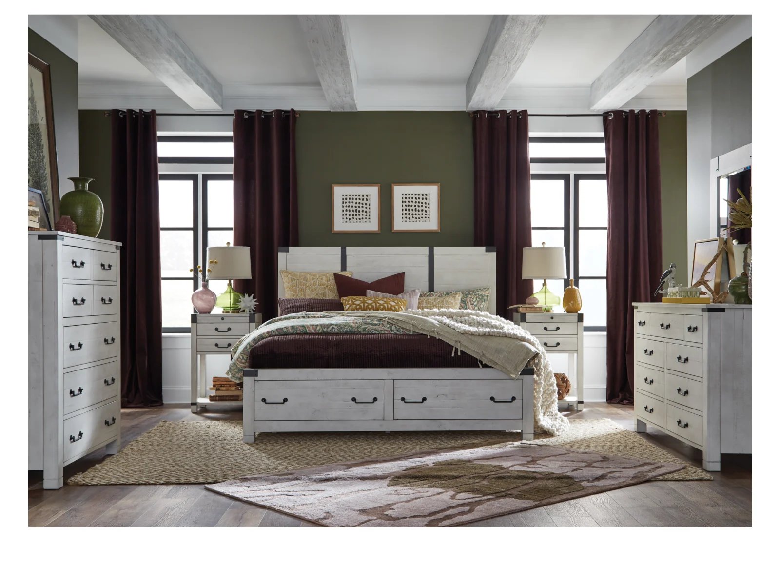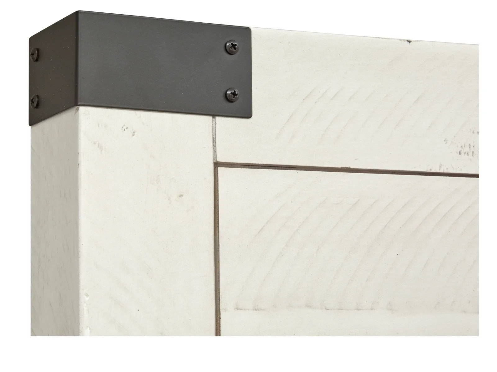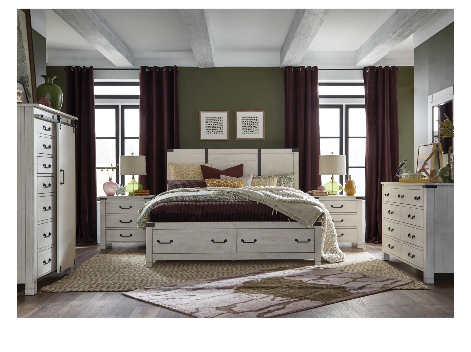 Rustic industrial sophistication makes Colorado the perfect bedroom for any setting, from loft to mountain retreat to suburban residence with an antique white finish on pine solids and veneers, offset by metal Aged Iron hardware. Bed options include a knockout poster bed with open canopy, featuring hand-crafted design elements in a fresh form as well as a handsome panel bed showcasing a plank headboard, and optional storage footboard. Case pieces echo the Industrial design with fresh forms highlighted with large Aged Iron bale pulls, and include a unique media Chest with sliding door, reminiscent of an old warehouse or barn, complete with 2 shelves, six drawers and wire management capabilities. The collection is rounded with a sliding door tall chest, an open and closed nightstand option as well as a portrait oval mirror and landscape mirror.