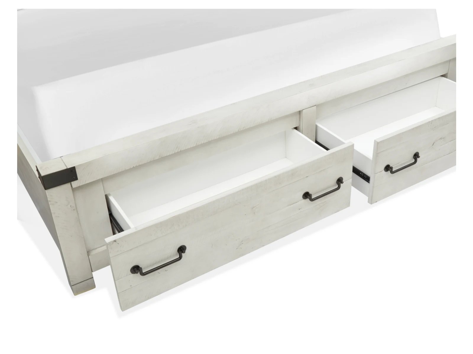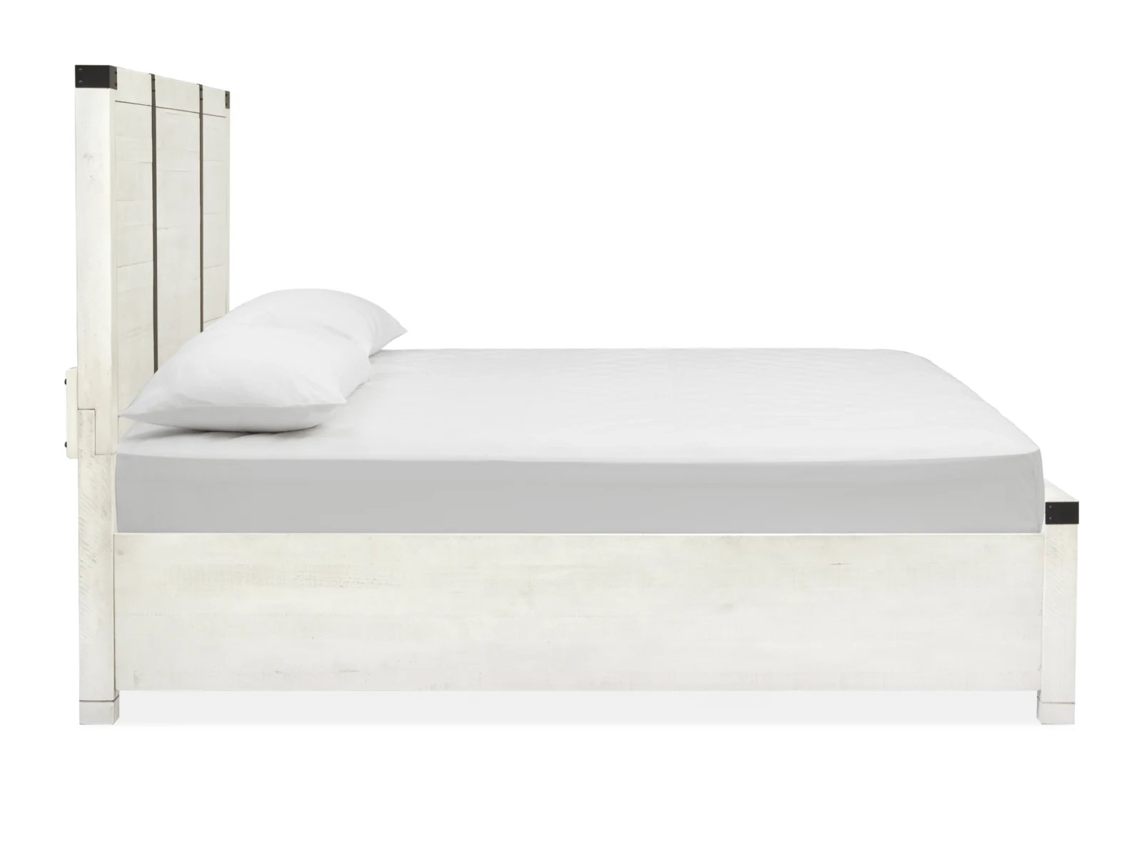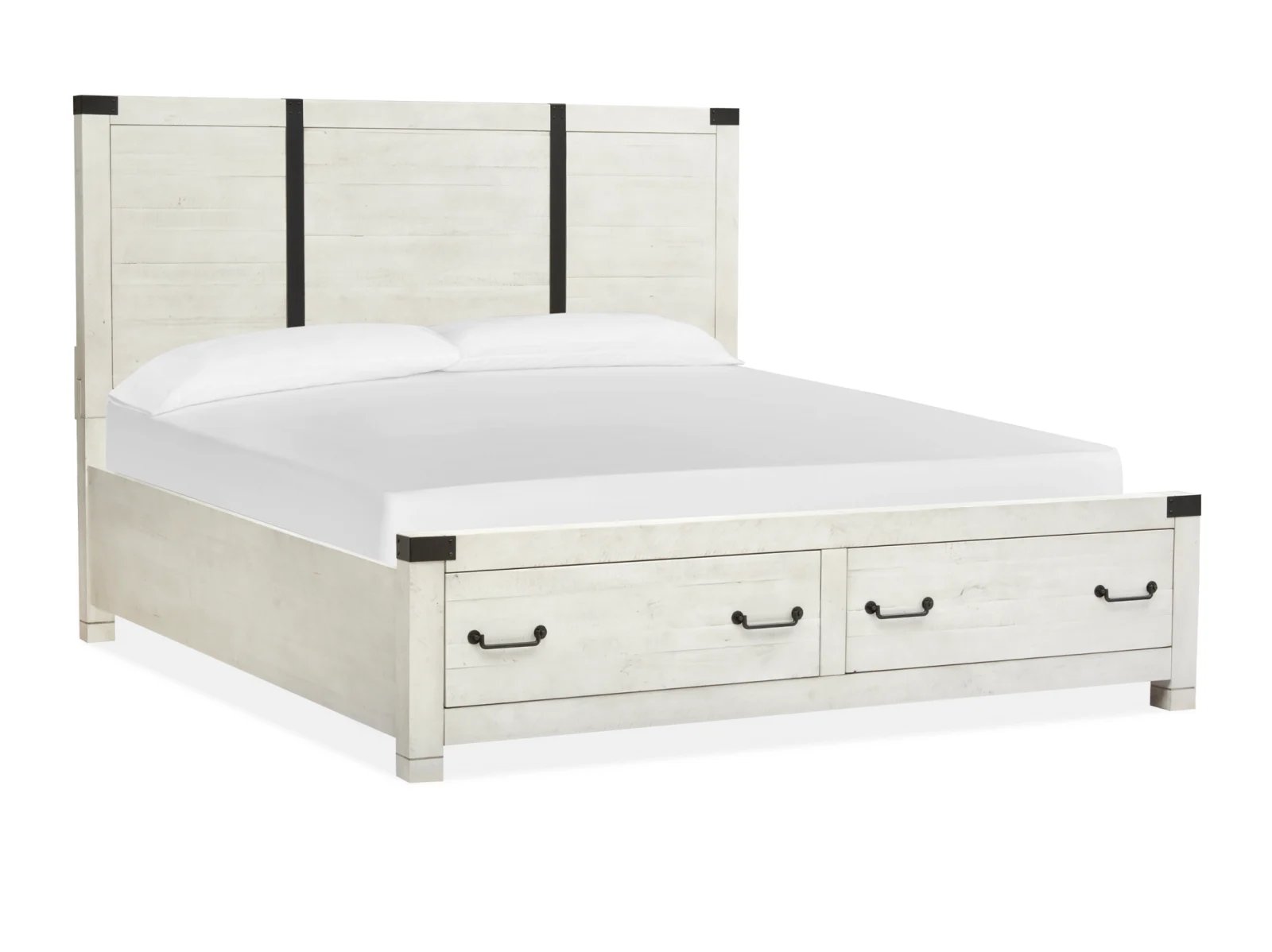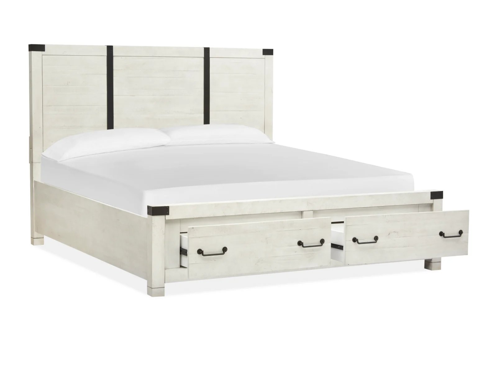 Rustic industrial sophistication makes Colorado the perfect bedroom for any setting, from loft to mountain retreat to suburban residence with an antique white finish on pine solids and veneers, offset by metal Aged Iron hardware. Bed options include a knockout poster bed with open canopy, featuring hand-crafted design elements in a fresh form as well as a handsome panel bed showcasing a plank headboard, and optional storage footboard. Case pieces echo the Industrial design with fresh forms highlighted with large Aged Iron bale pulls, and include a unique media Chest with sliding door, reminiscent of an old warehouse or barn, complete with 2 shelves, six drawers and wire management capabilities. The collection is rounded with a sliding door tall chest, an open and closed nightstand option as well as a portrait oval mirror and landscape mirror.