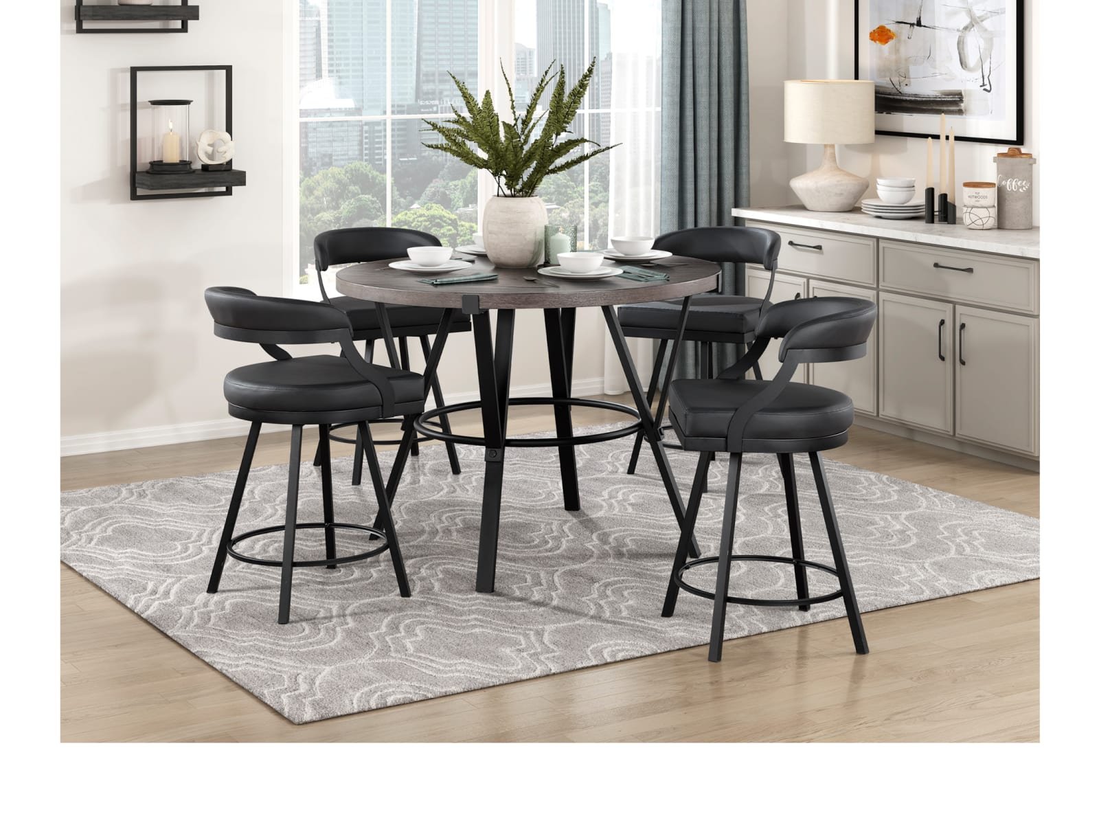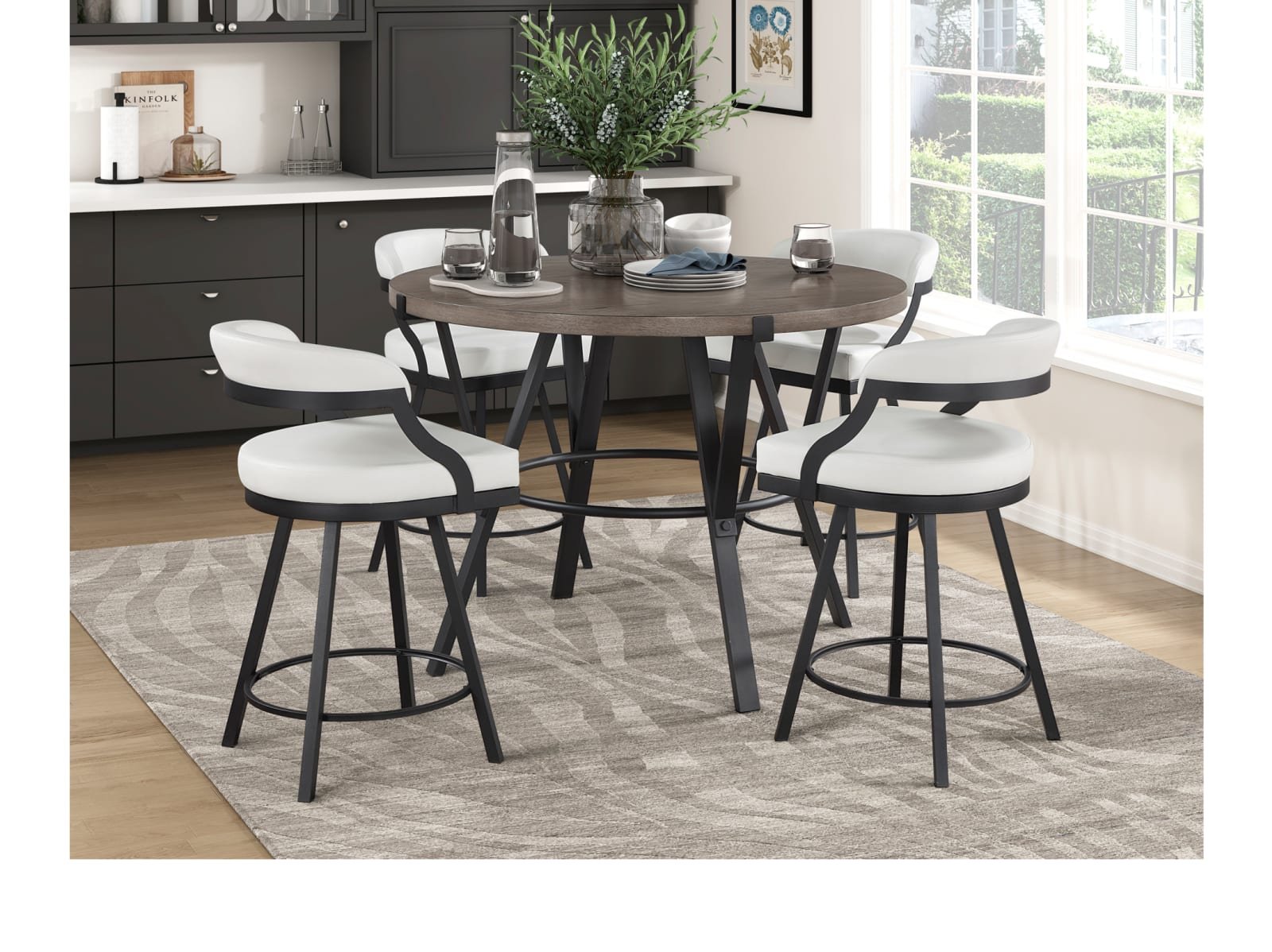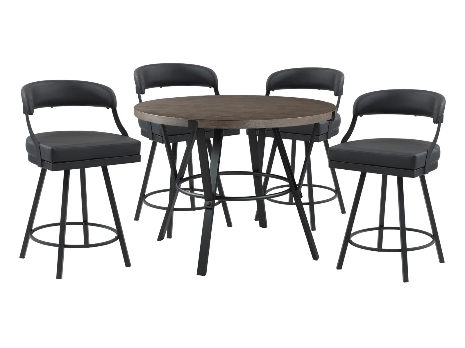 Elevate your dining experience with the Cortone 5-Piece Counter Height Dining Set. Designed with a rustic aesthetic, this set features a round, oak veneer table top supported by a sleek black metal base. Perfect for mealtime and social gatherings, the Cortone Collection seamlessly blends style and function, making it a stunning addition to any home.