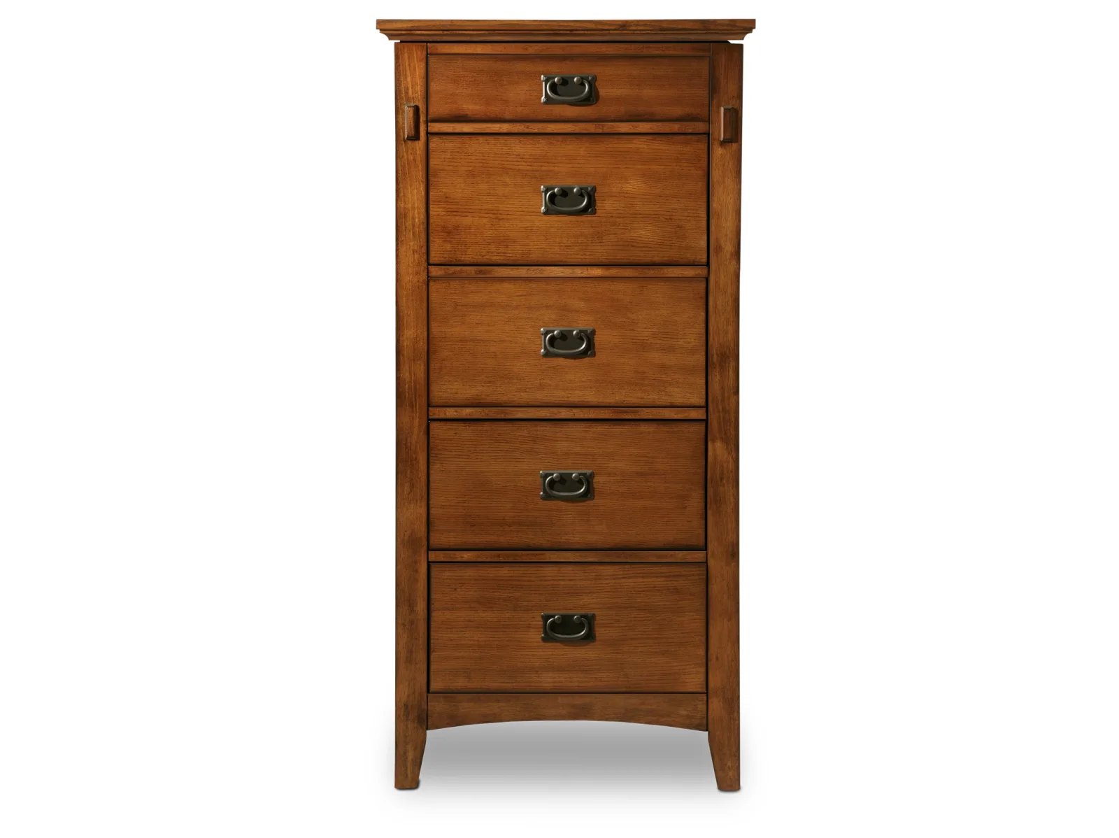Restore your home back to the era of traditional refinement with the fine-crafted Cristo Lingerie Chest. Made of solid rubberwood and ash veneers with a rich, hand-applied lacquer oak finish, the lovely Cristo highlights the best features of mission styling with its detailed side inset panels and simple, clean design. Dark nickel hardware adds a historical antique touch, using classic arts and crafts appeal with modern techniques for sturdy handles. Built durably to last, each of the four bottom drawers are fitted with Kenlin glides for an easy opening process and feature French dovetailed drawer fronts and English dovetailed backs, while the top-drawer face is decorative only. The top panel of the chest opens to reveal a mirror with jewelry storage, so that mornings spent getting ready are always organized. The Cristo Lingerie Chest is the perfect piece for all your dressing needs!
