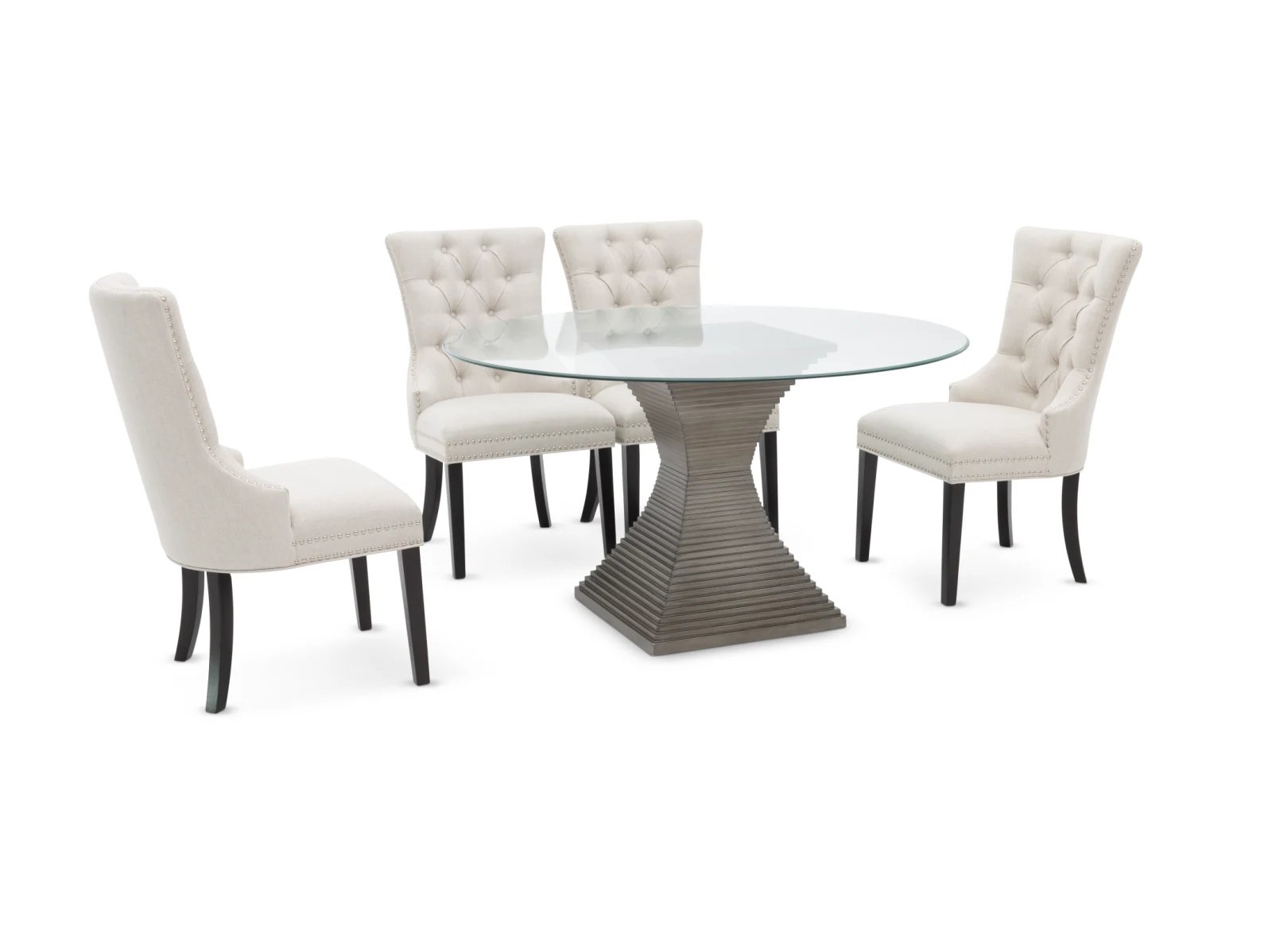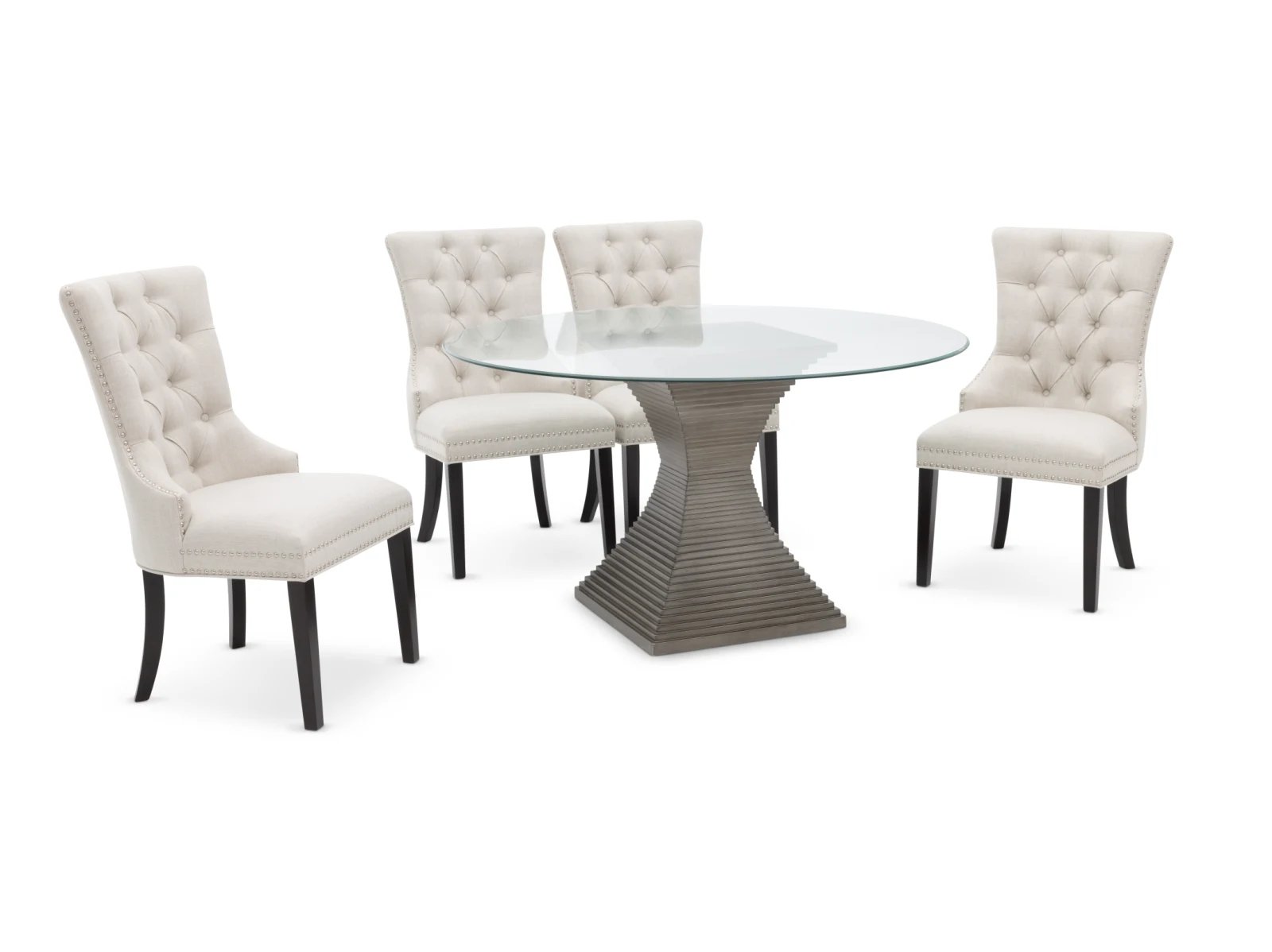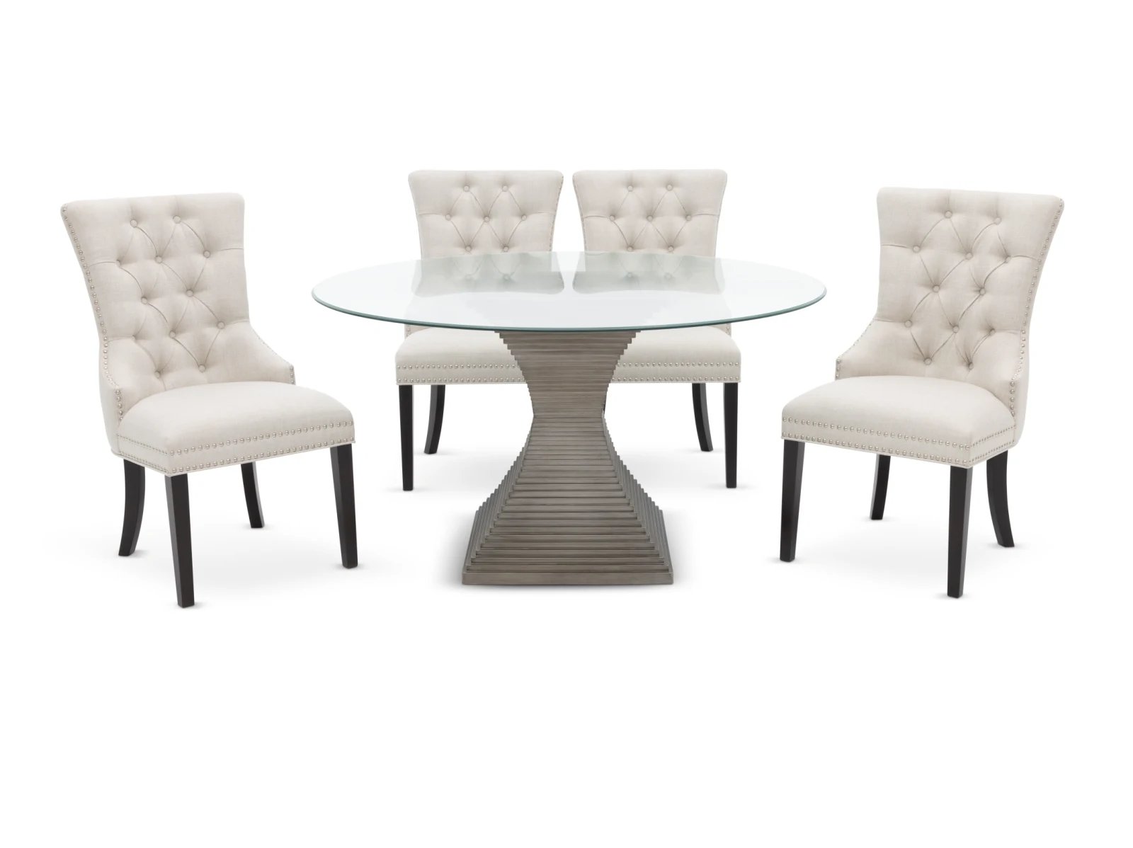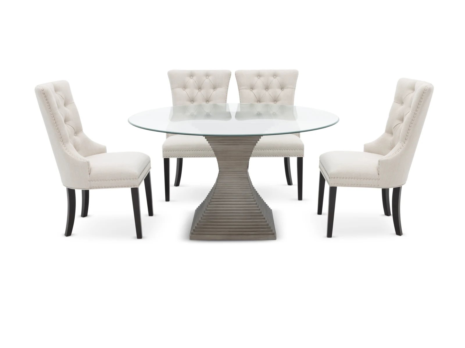 & Free ShippingWith its stylish modern design and practical functionality, the Dakota 5 Pc. Dining Room Set is the perfect addition to any home. This dining set showcases a sophisticated glass top table supported by a striking grey sauvage pedestal base. Complemented by four chairs featuring elegant tufted backrests, the ensemble creates a cohesive and inviting atmosphere for modern dining spaces. The chairs’ easy-to-clean polyester upholstery and nailhead trim provide both elegance and convenience. Whether for everyday meals or special occasions, the Dakota 5 Pc. Dining Room Set offers comfort, durability, and timeless appeal.