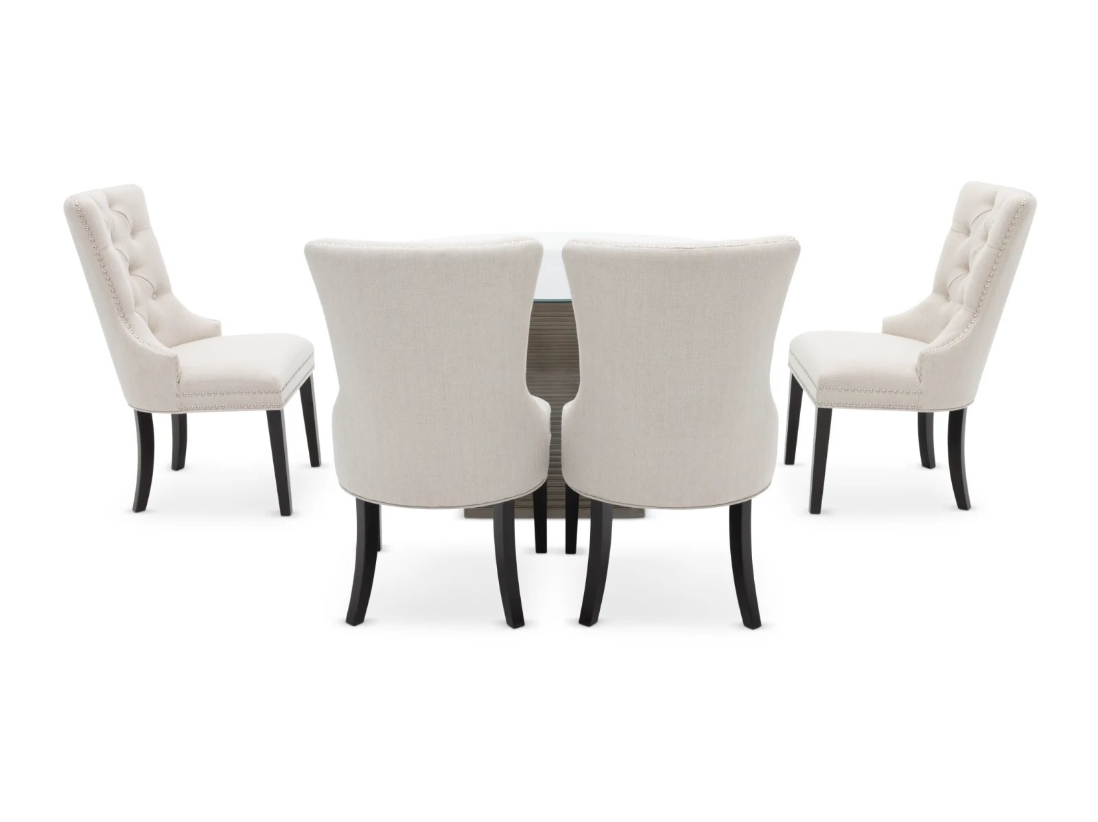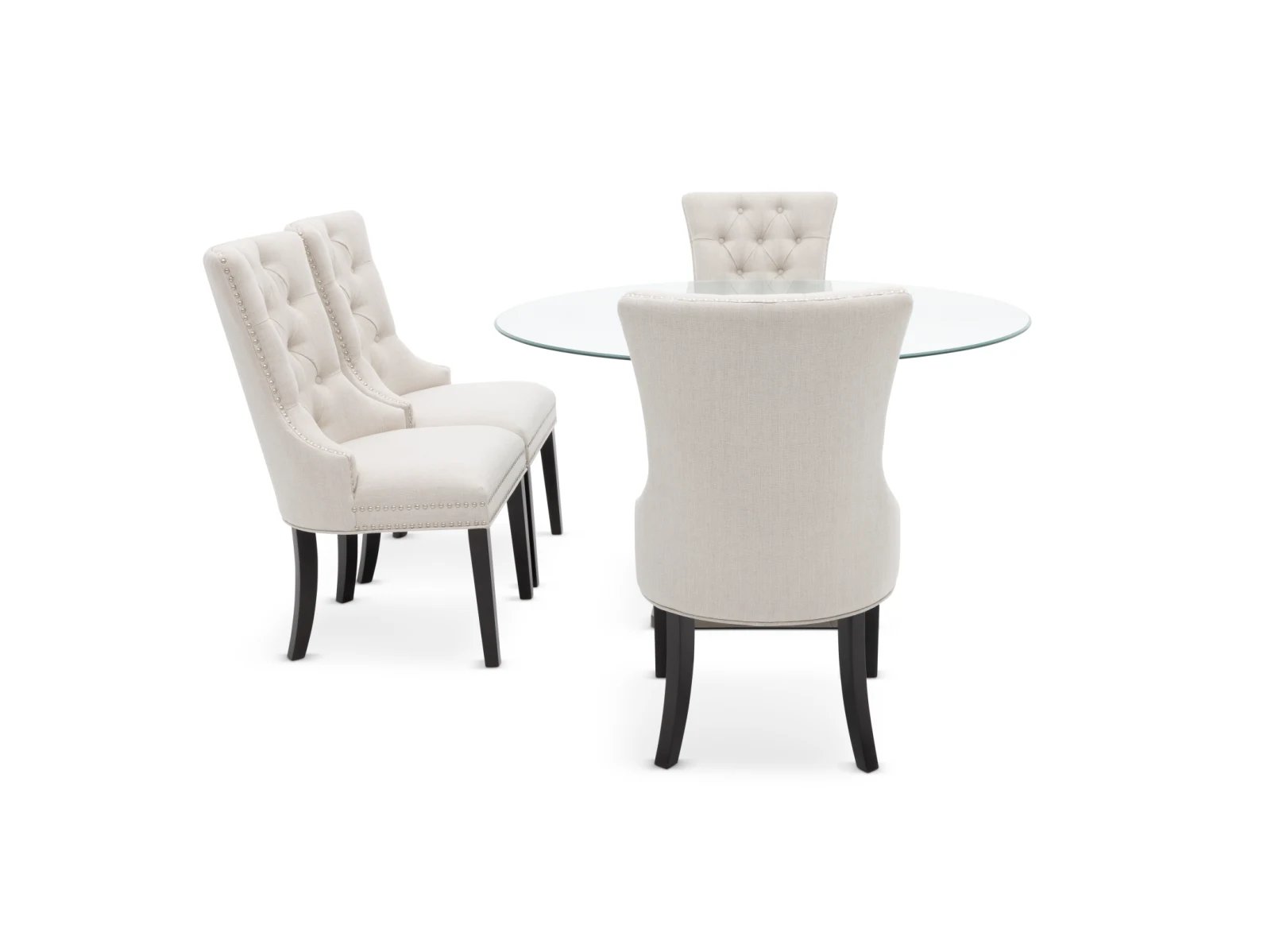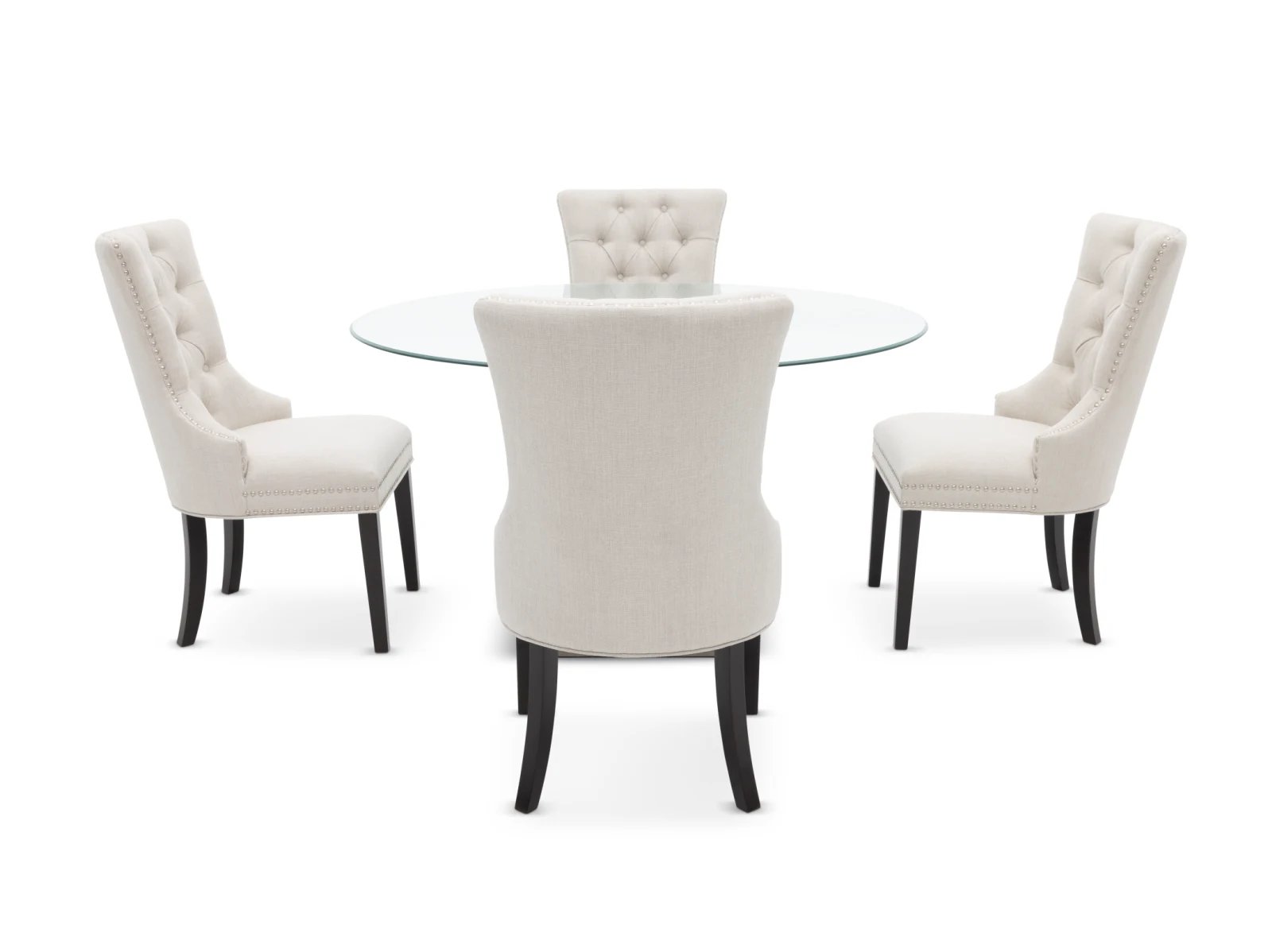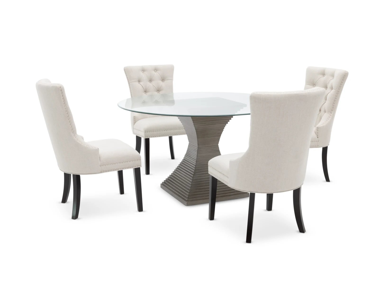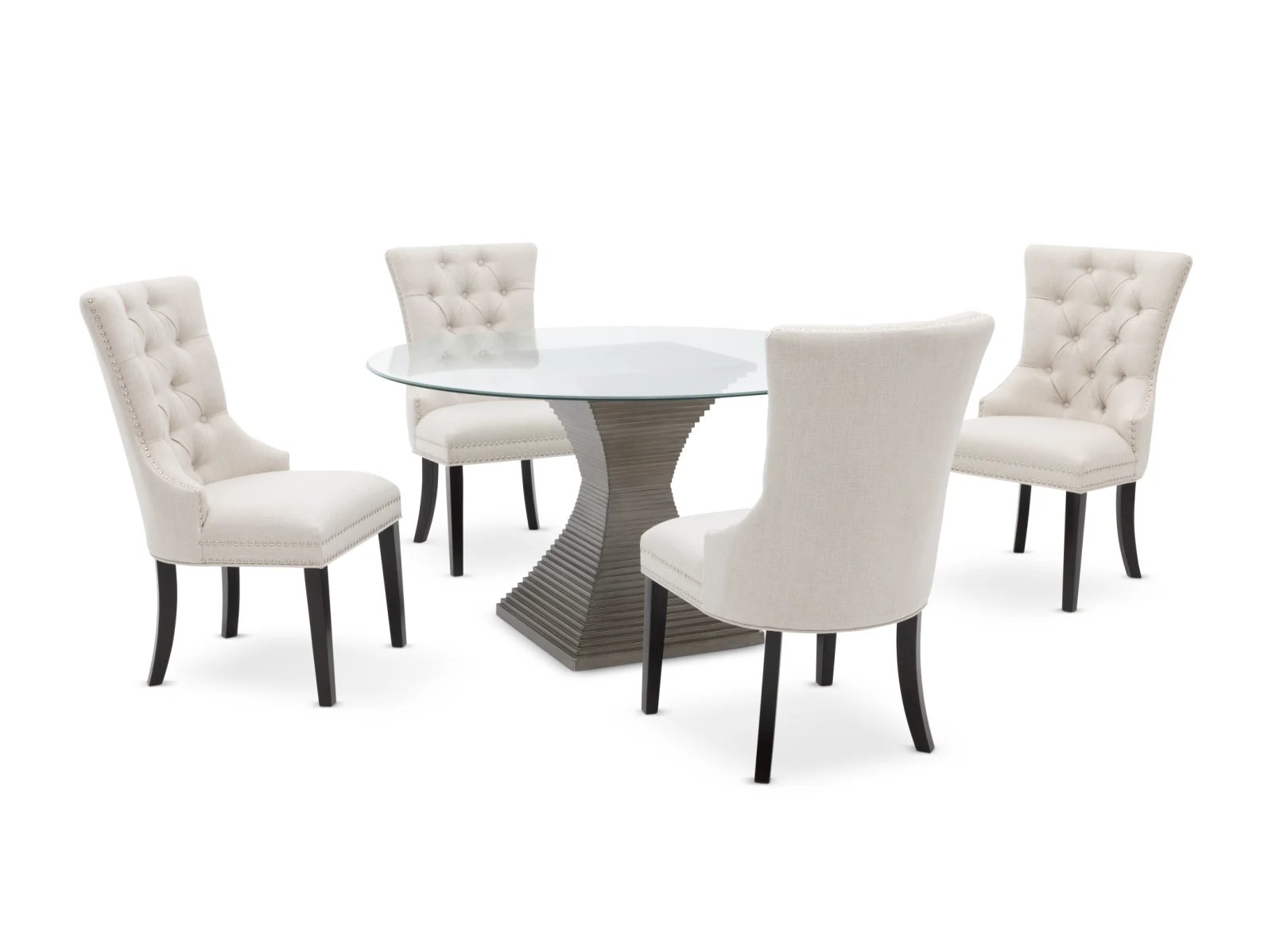 & Free ShippingWith its stylish modern design and practical functionality, the Dakota 5 Pc. Dining Room Set is the perfect addition to any home. This dining set showcases a sophisticated glass top table supported by a striking grey sauvage pedestal base. Complemented by four chairs featuring elegant tufted backrests, the ensemble creates a cohesive and inviting atmosphere for modern dining spaces. The chairs’ easy-to-clean polyester upholstery and nailhead trim provide both elegance and convenience. Whether for everyday meals or special occasions, the Dakota 5 Pc. Dining Room Set offers comfort, durability, and timeless appeal.