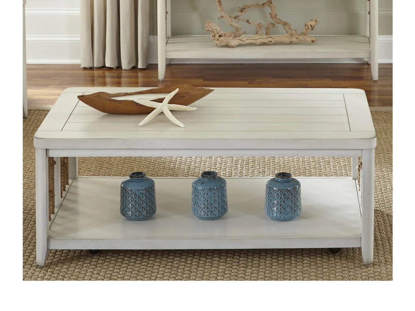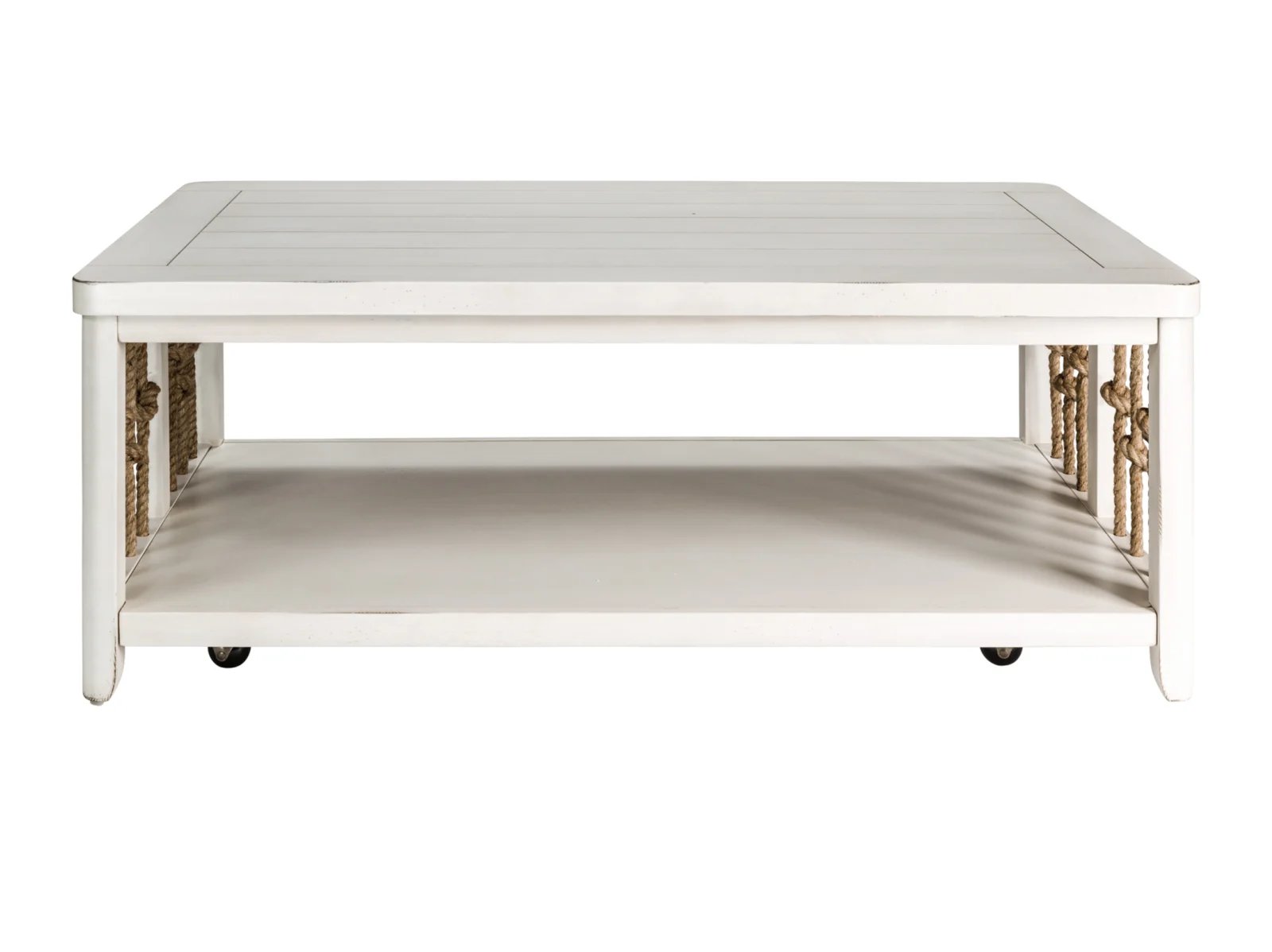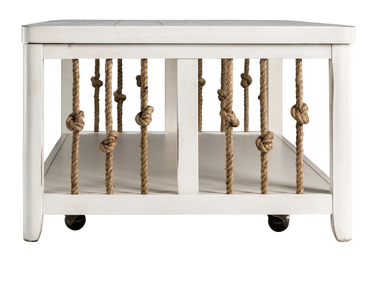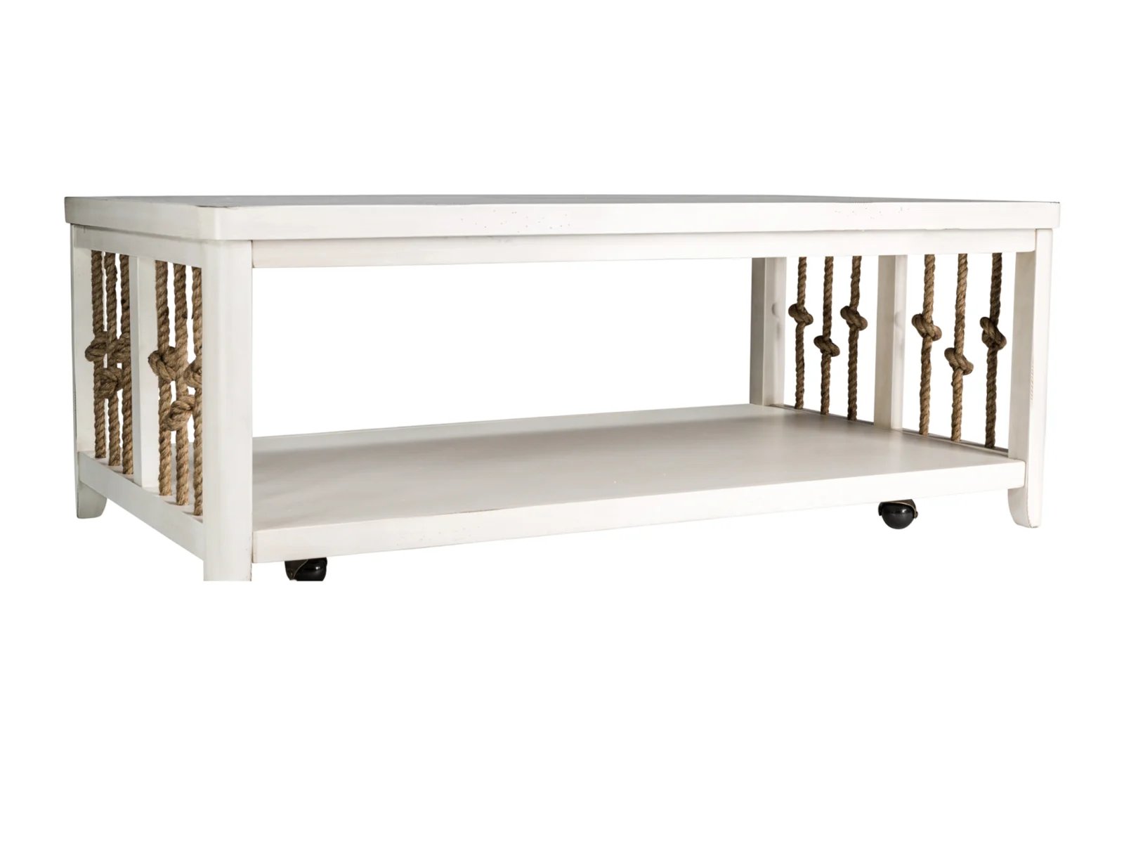 & Free ShippingEnjoy family game night around the Dania Beach Coffee Table in your coastal style space. Crafted of poplar solids and birch veneers, this piece features a white finish with knotted rope end panels and wormhole distressing, softly rounded pilasters flow into tapered feet, appealing planked top with a bottom shelf for additional storage, anchored by easy to navigate casters. Add this eclectic, one of a kind end table to any casual style space.
