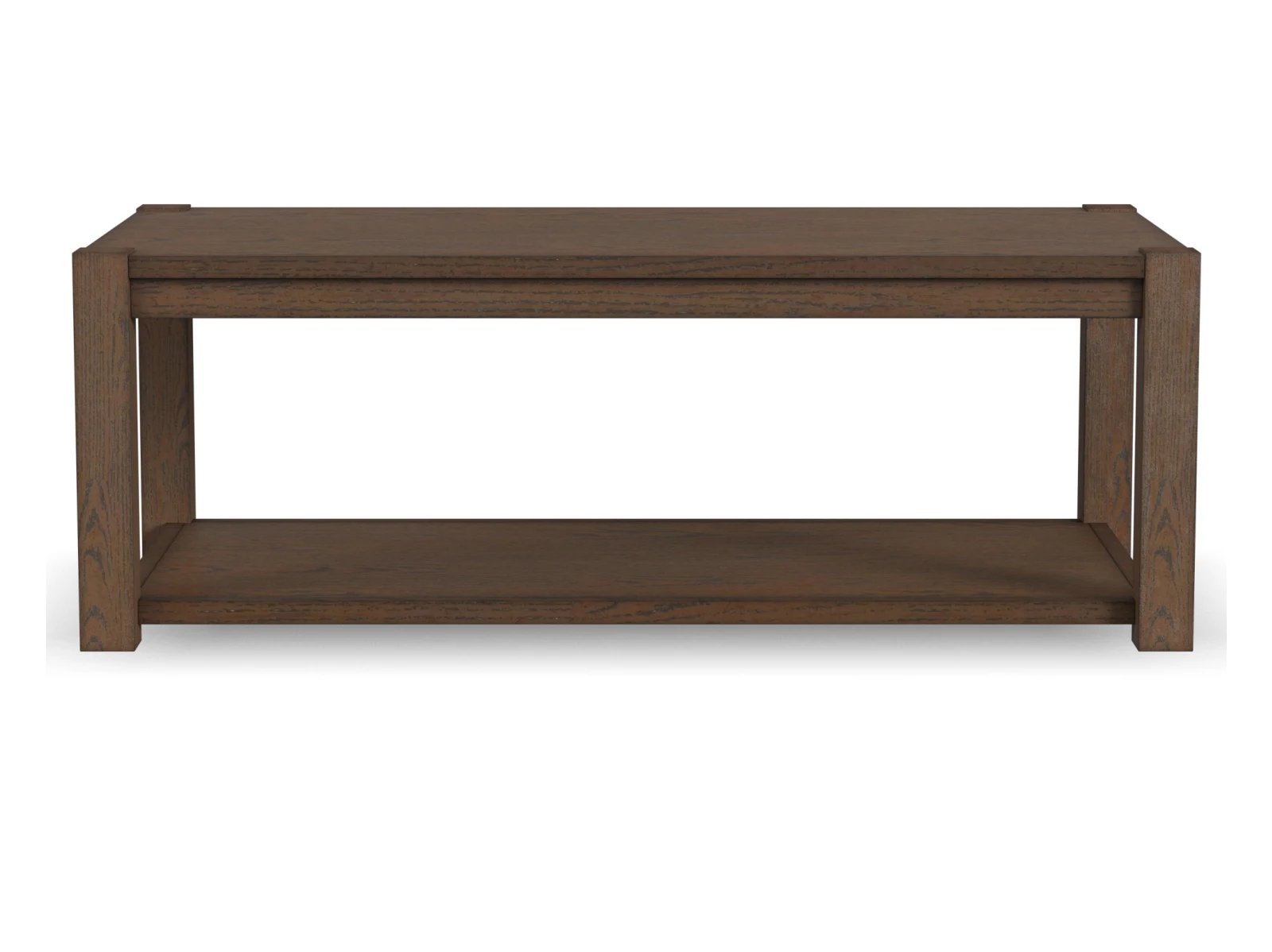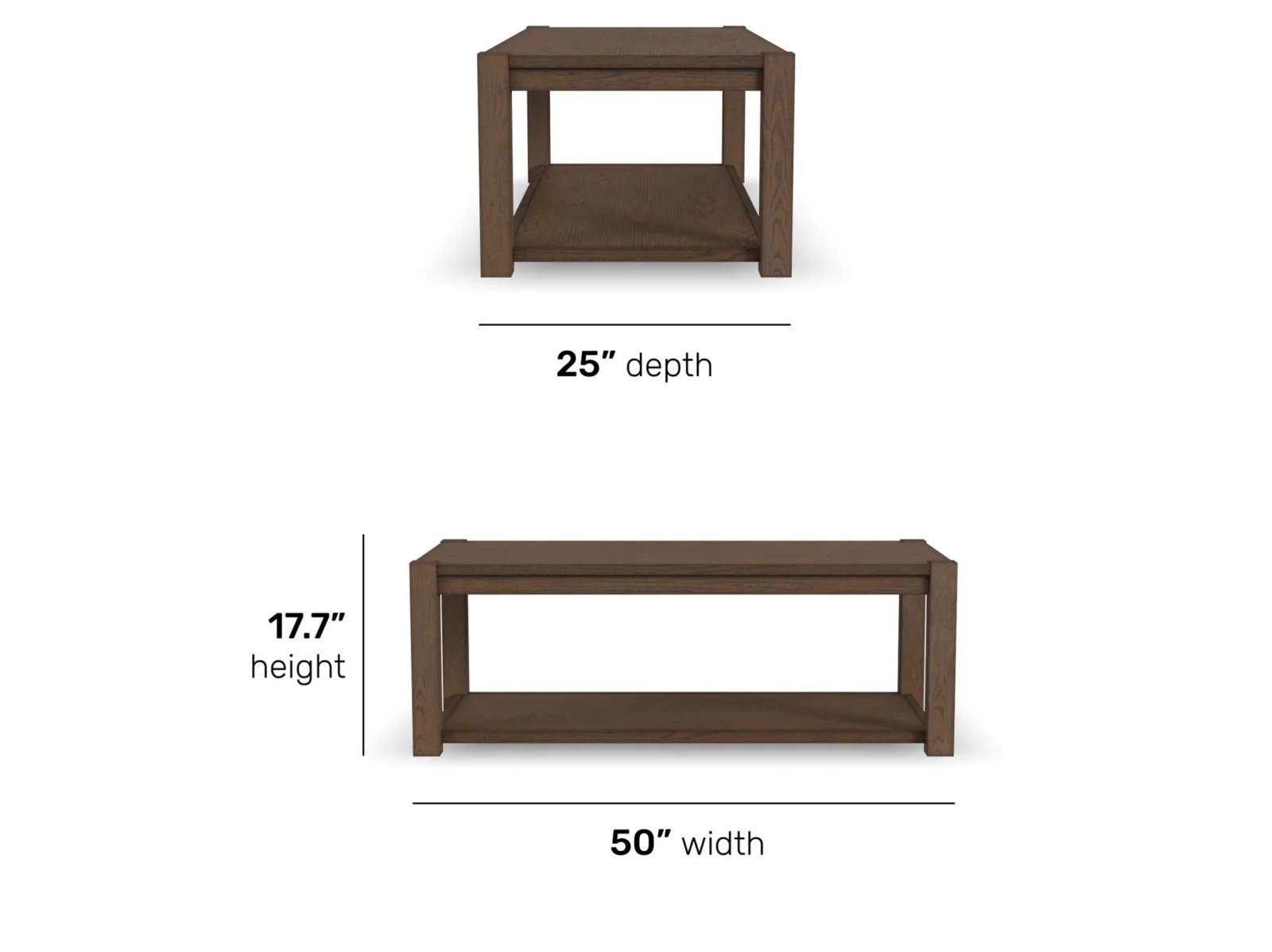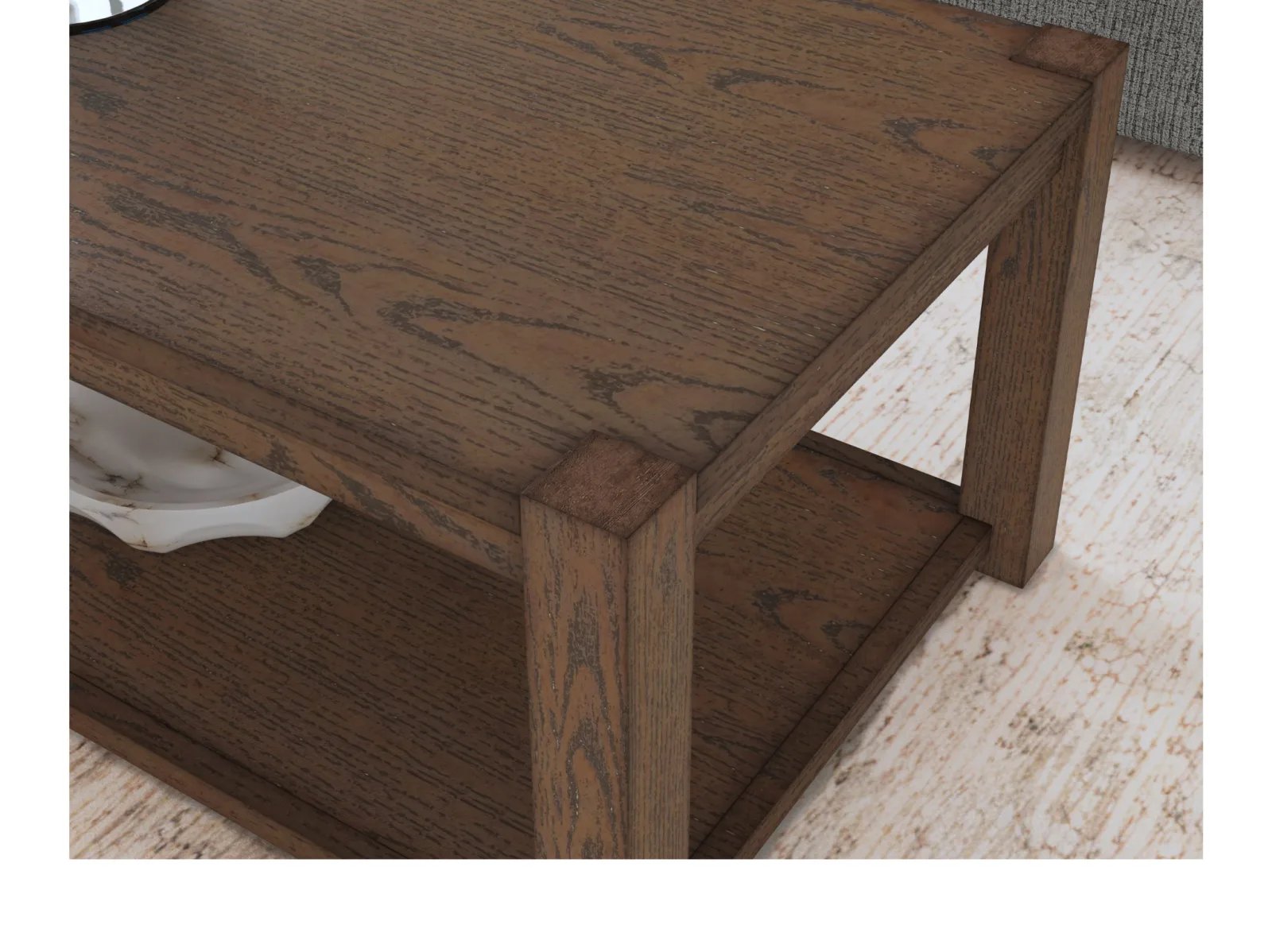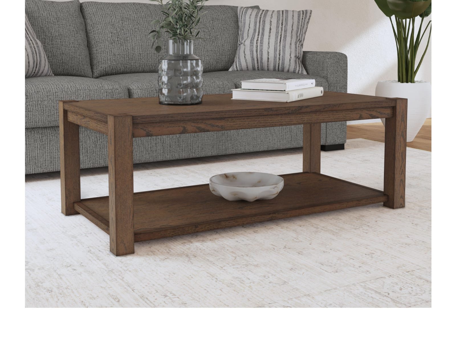 Enliven your living space with warmth and character with the Davis Coffee Table. Crafted from rubberwood solids and oak veneers, this table blends durability with hand-crafted appeal. Its transitional design boasts a rustic faux plank tabletop in a ravishing mid-toned brown finish. Its spacious lower shelving is perfect for decor or additional storage. Distinctive leg posts protrude from each corner, while hidden casters provide easy mobility without compromising style.