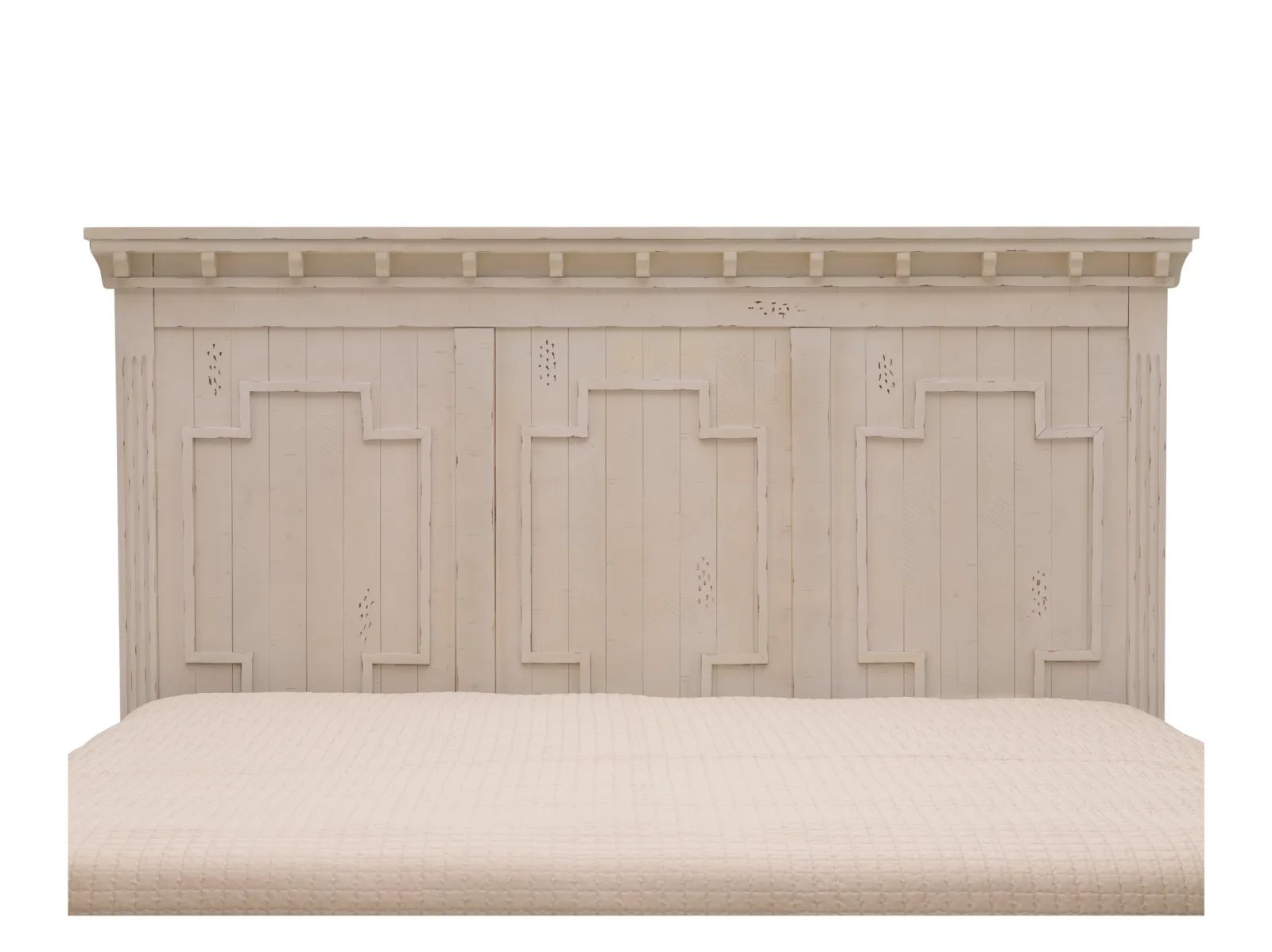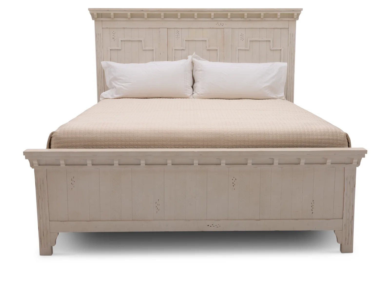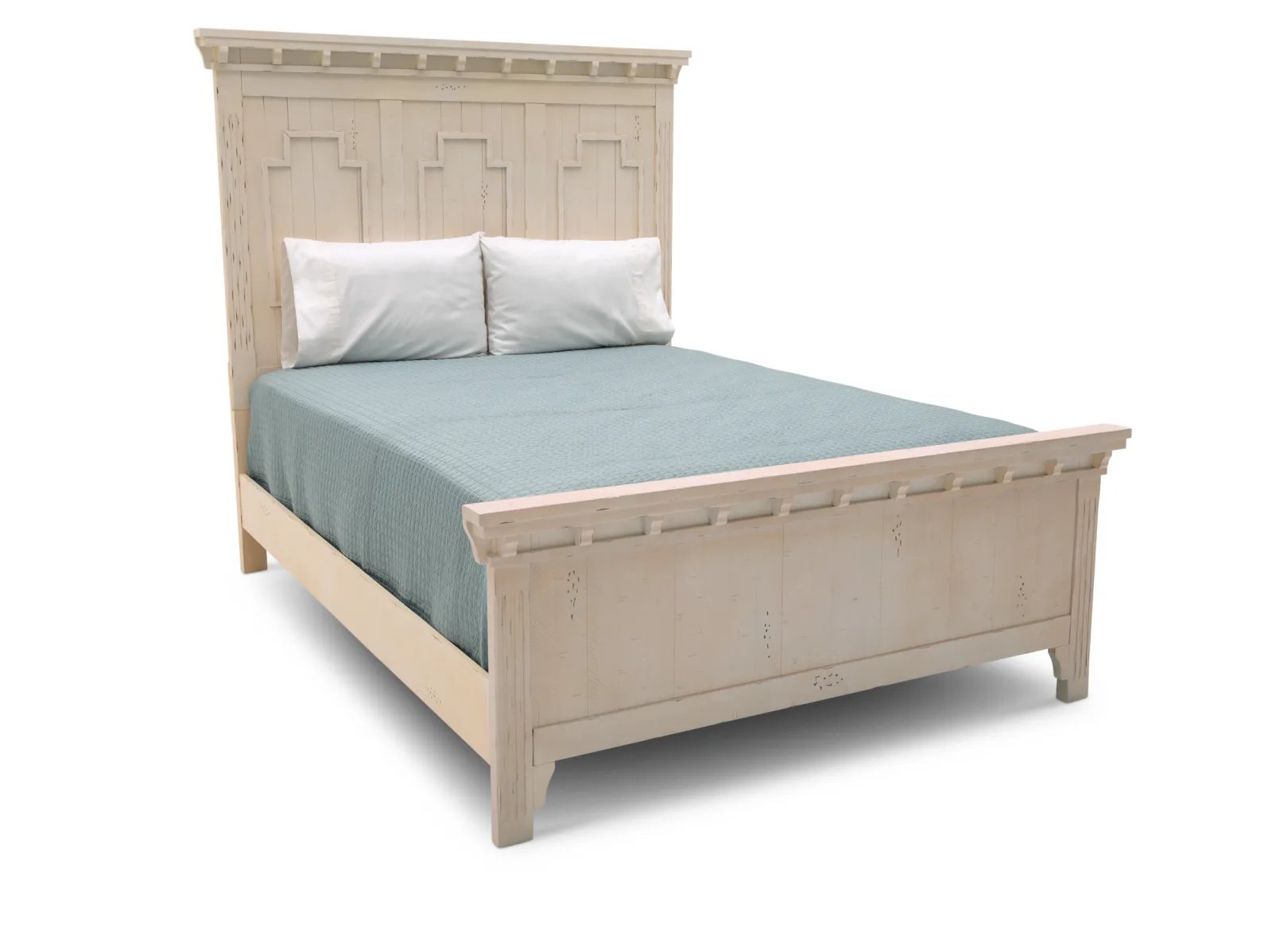 The Desperado Panel Bed brings with it nostalgic woodworking details and a clean, refreshing palette to add a sense of refinement to any bedroom. Crafted from pine solids and MDF substrates, the Desperado receives its fashionably aged look from a distressed white finish atop thick pine veneers. Eyes are quickly drawn to the paneled head and footboards which feature decorative molded details below large buttressed crown moldings – all of which combine with the fluted bed posts to make you feel connected to Old World sophistication. Not to be stuck in the past, the Desperado features hidden USB ports along the headboard to help keep up with modern life. Fall asleep surrounded by timeless elegance with the Desperado Panel Bed.