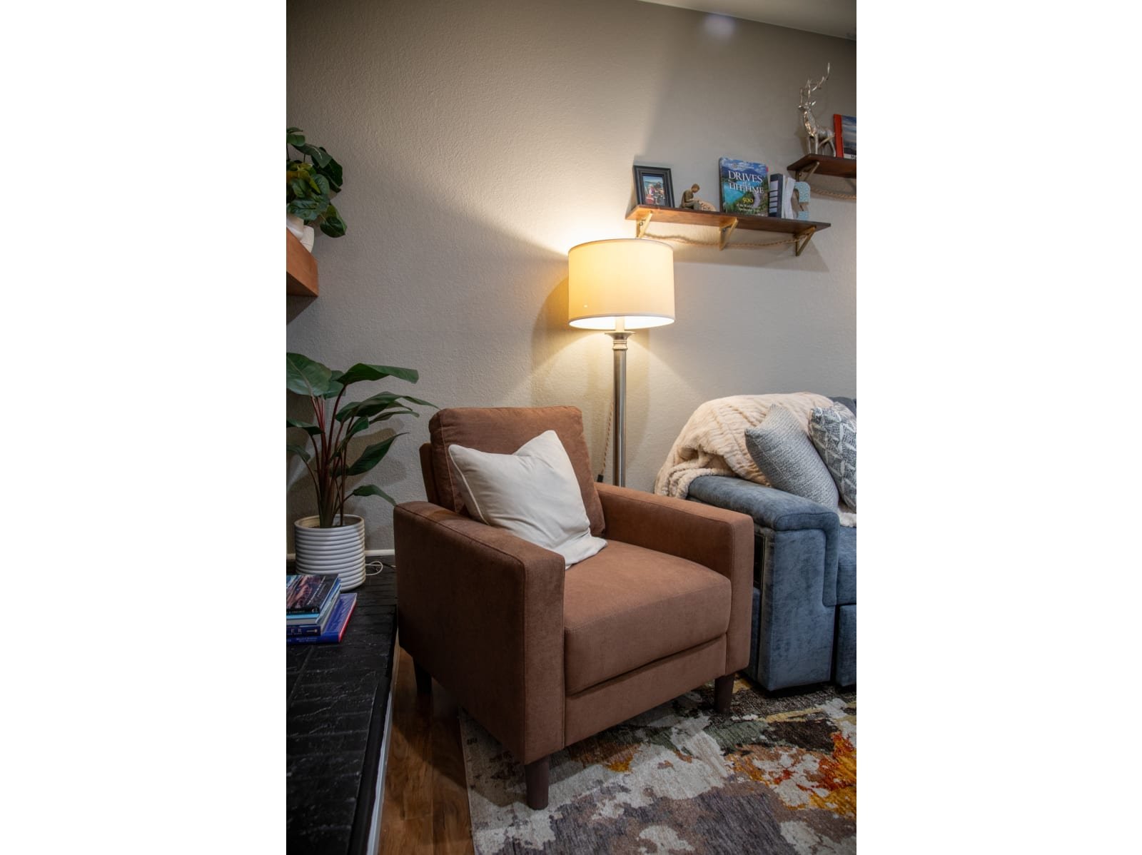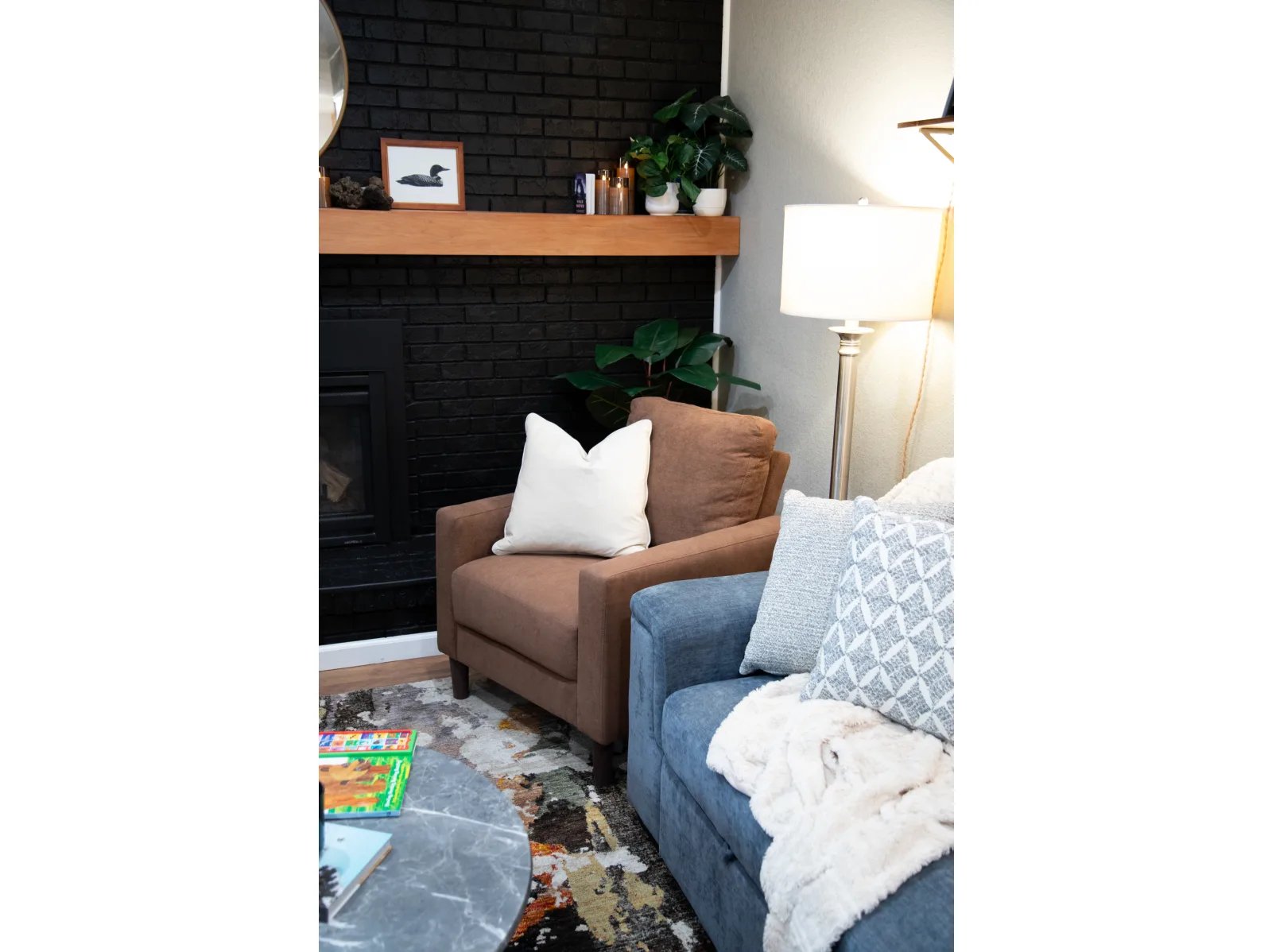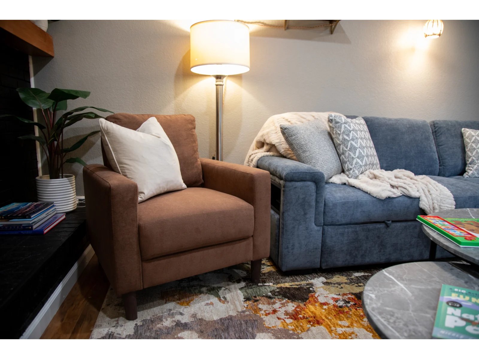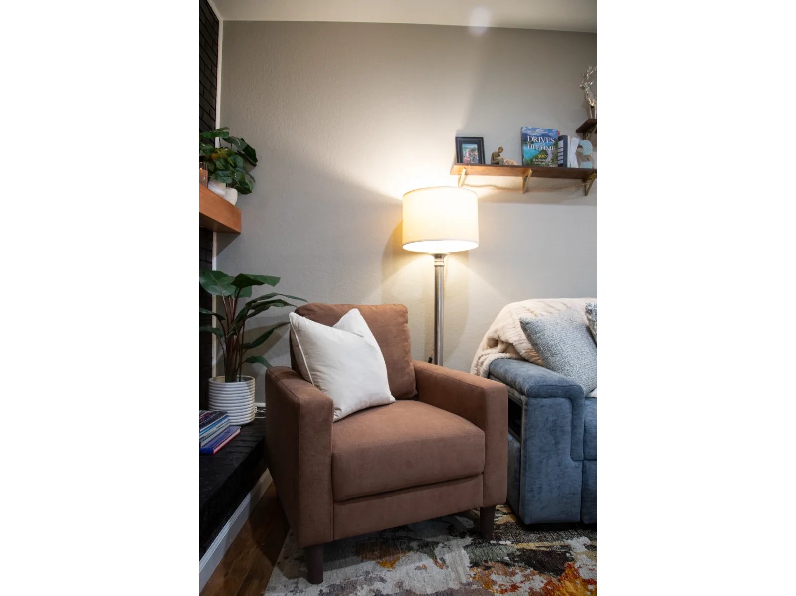 & Free ShippingPerfect for solo lounging or pairing with other living room seating, the Devon Chair boasts a modern silhouette that echoes its trend-forward vibe. Plush cushions and crisp track arms offer supportive yet sleek support, making this chair an ideal reading spot or your favorite chair for move nights. The soft, easy-care polyester fabric and choice of four fashionable hues complement any décor, while the dark faux wood legs add a touch of warmth and sophistication. Compact yet comfortable, the Devon Chair brings tailored charm to every corner.