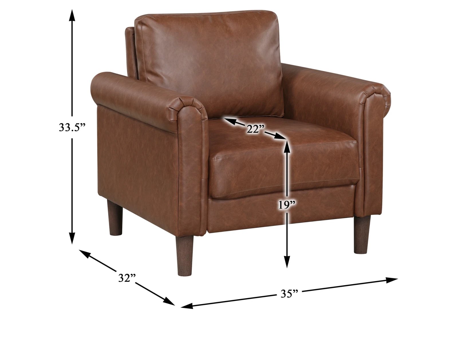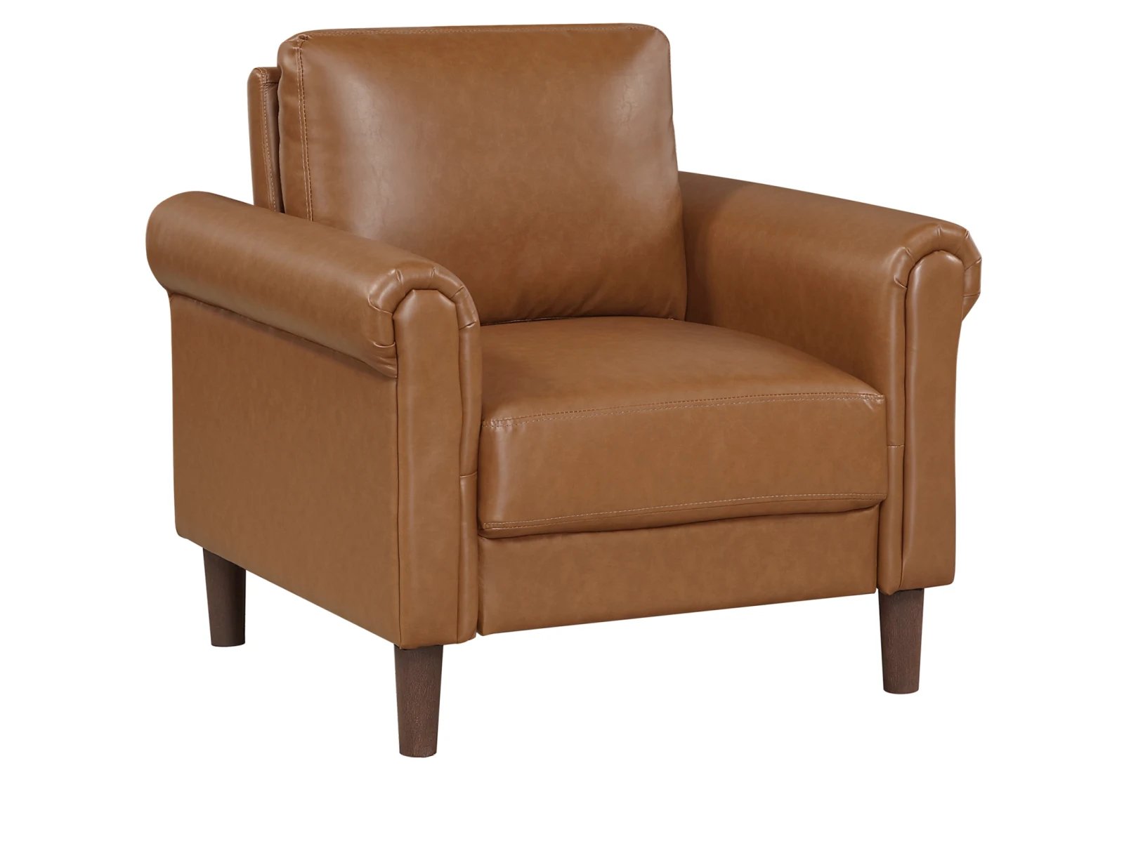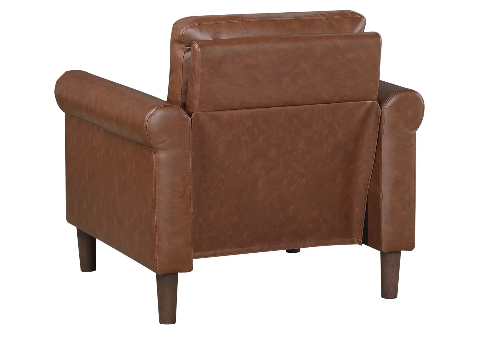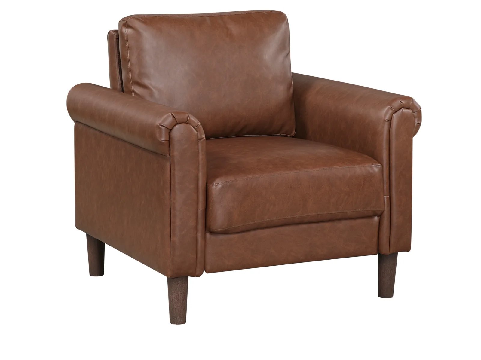 The Distefano Chair blends classic rolled arms with mid-century lines, creating a stylish accent for any living space. Upholstered in smooth faux leather and supported by faux wood legs, this chair offers both comfort and sophistication. Available in blue, chocolate, and gray, it’s the perfect addition to your living room.