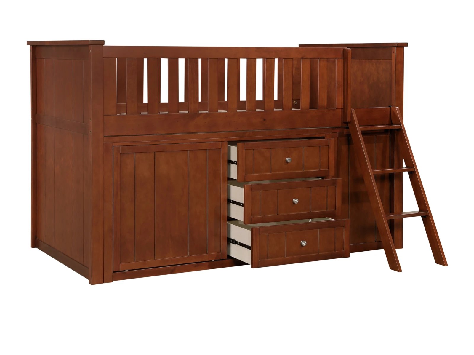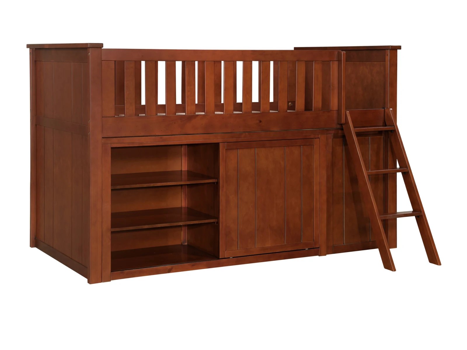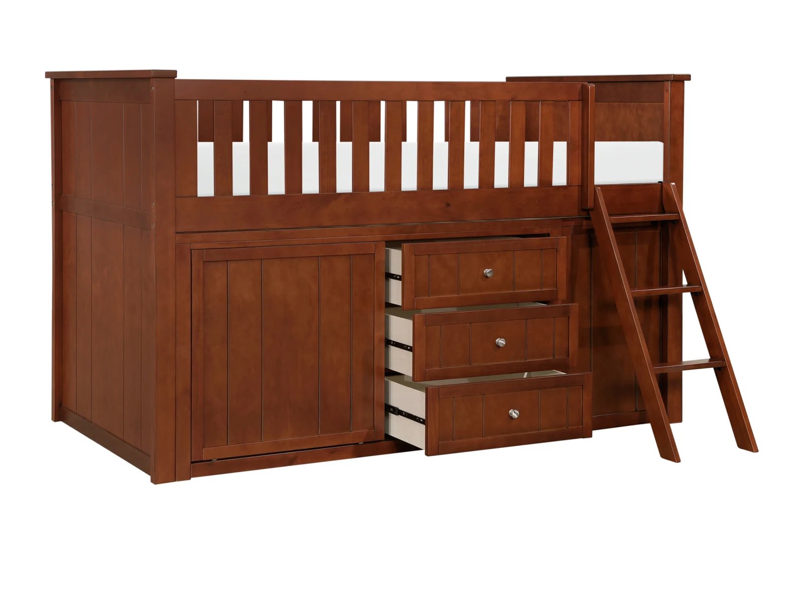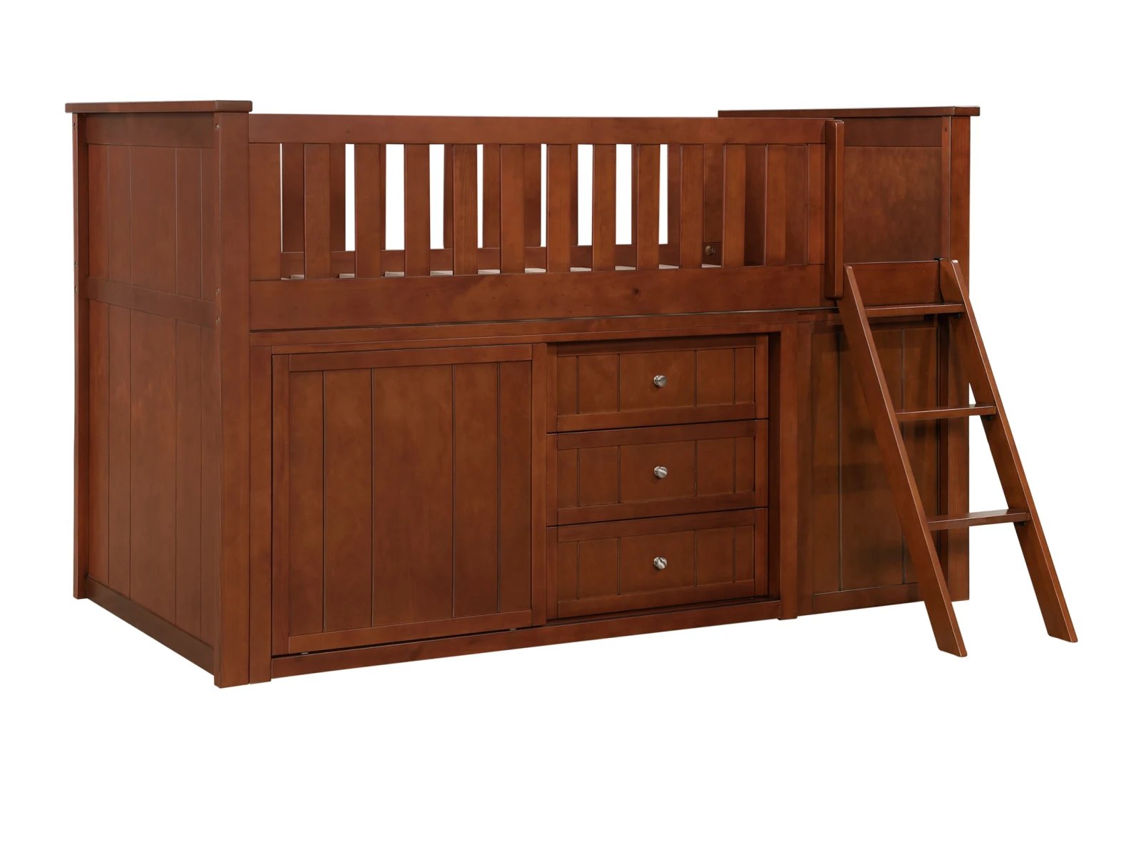 & Free ShippingMaximize your child’s sleep and storage space with the stylish Dogue Low Loft Twin Bed. Finished in a rich dark cherry, this transitional low-loft bunkbed is perfect for any youth bedroom. An angled ladder provides easy and safe access to the loft platform. The included dresser and bookcase are designed to fit perfectly underneath, offering ample shelf, drawer storage, and open display space for books and collectibles. A smart and stylish solution for any kid’s room!