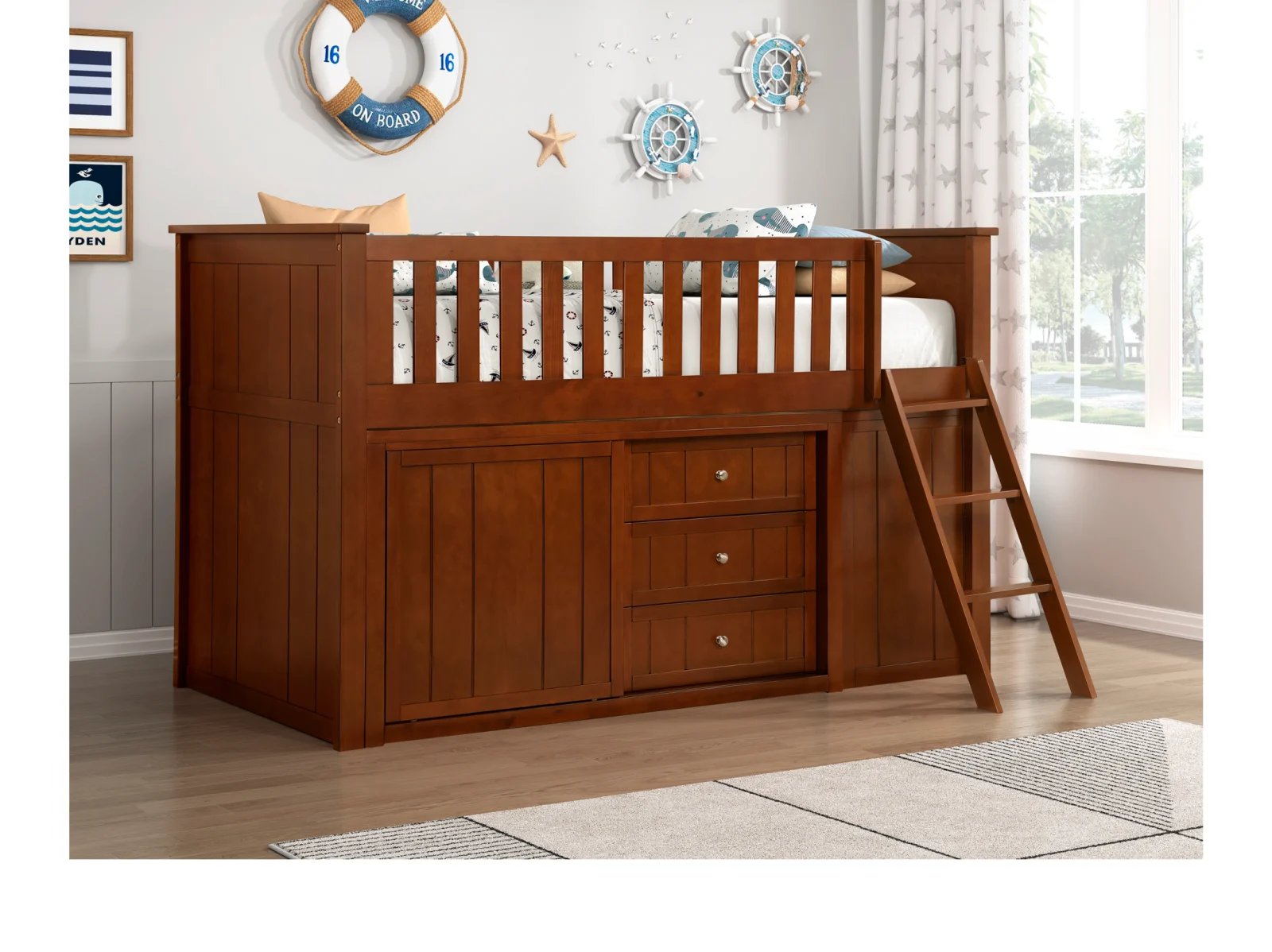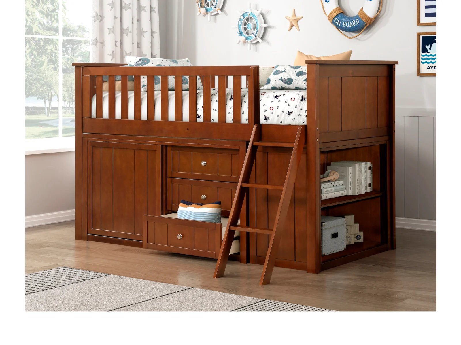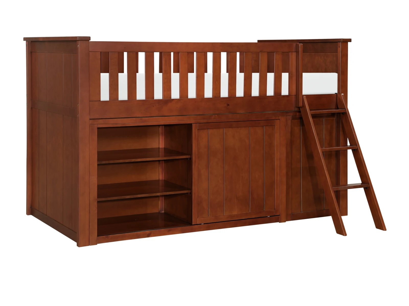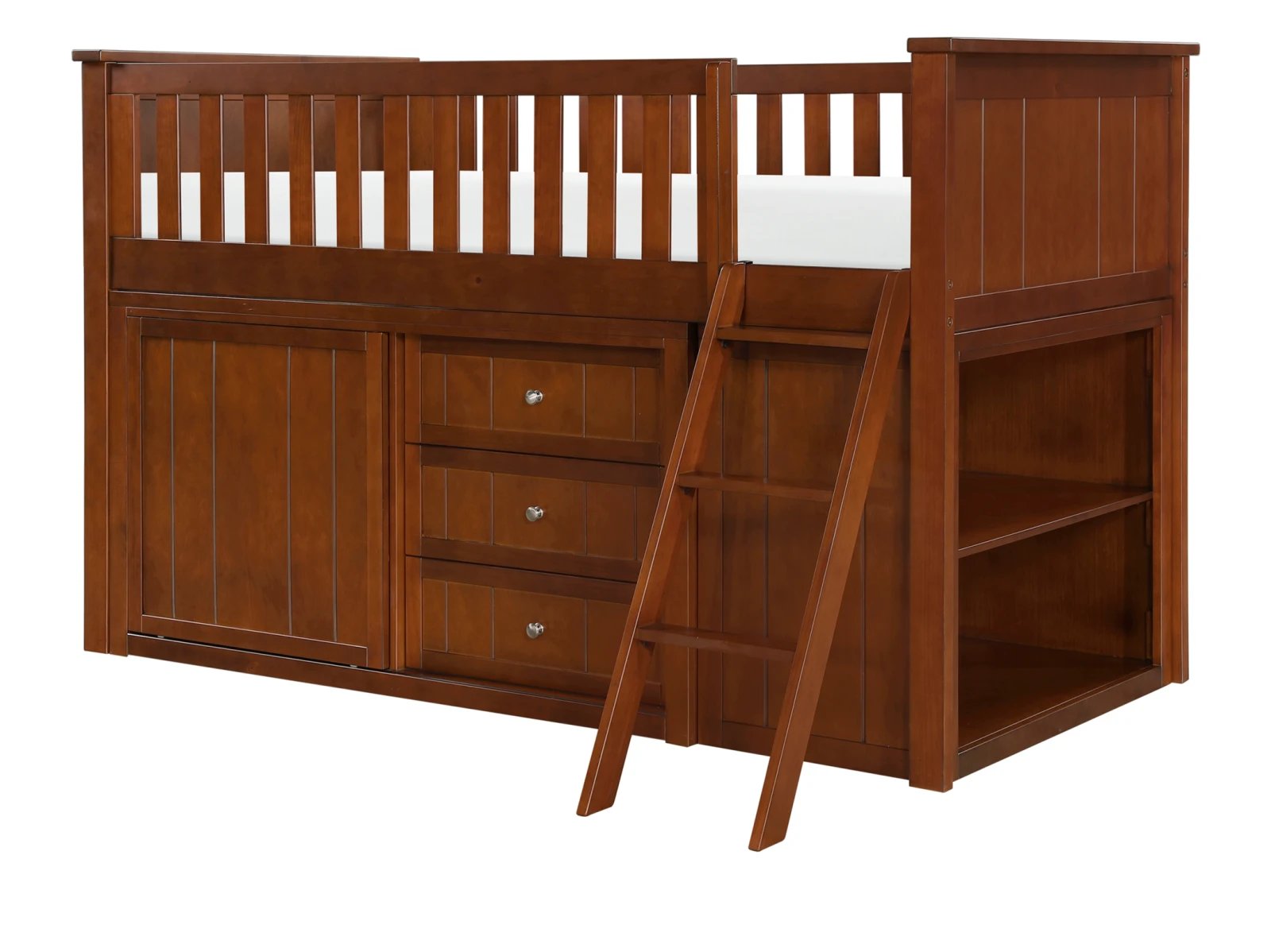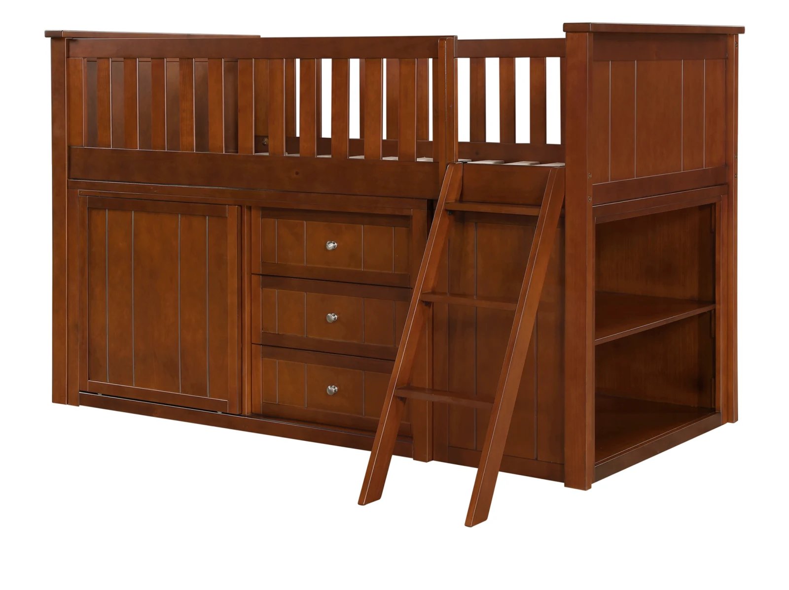 & Free ShippingMaximize your child’s sleep and storage space with the stylish Dogue Low Loft Twin Bed. Finished in a rich dark cherry, this transitional low-loft bunkbed is perfect for any youth bedroom. An angled ladder provides easy and safe access to the loft platform. The included dresser and bookcase are designed to fit perfectly underneath, offering ample shelf, drawer storage, and open display space for books and collectibles. A smart and stylish solution for any kid’s room!