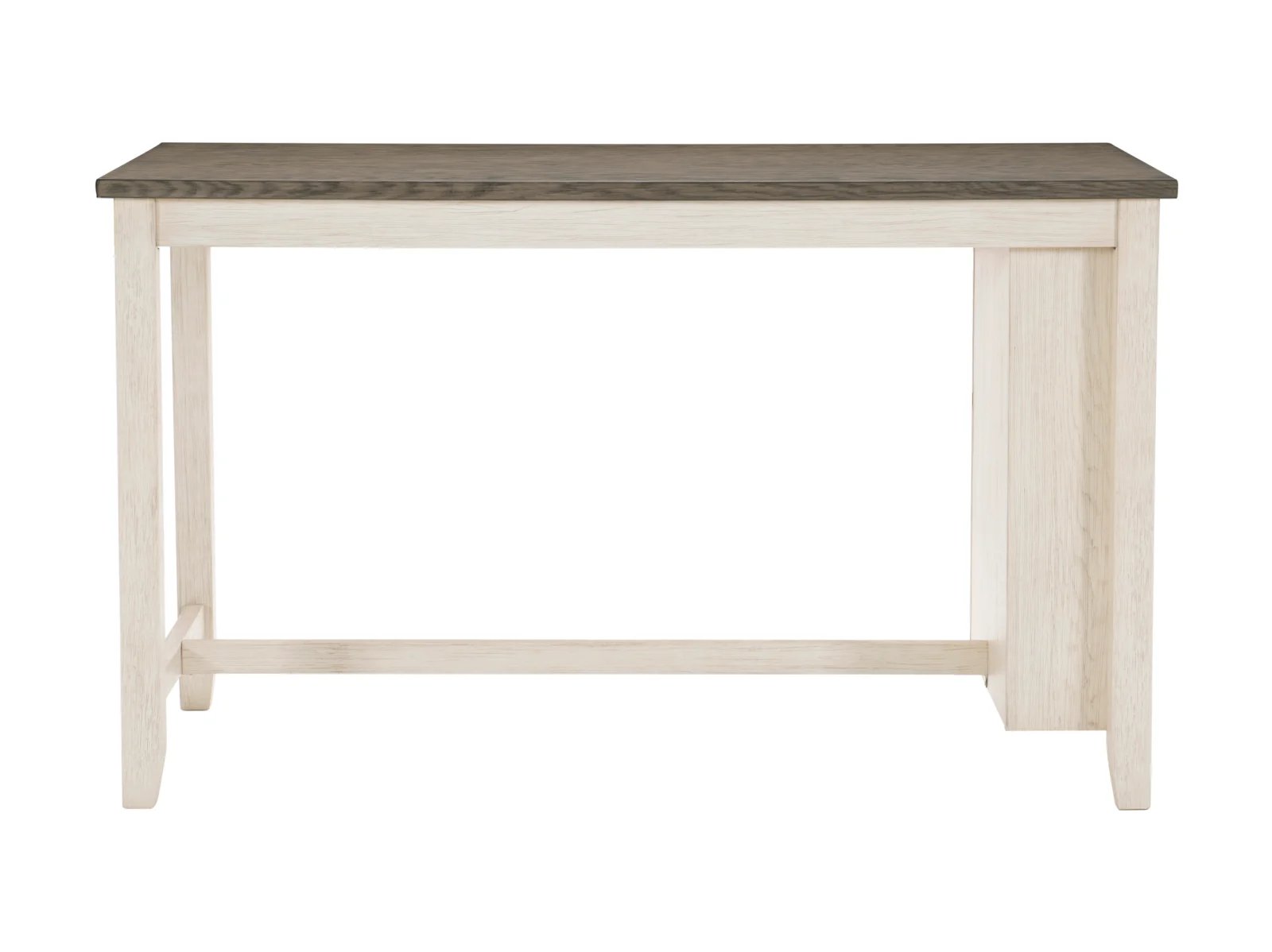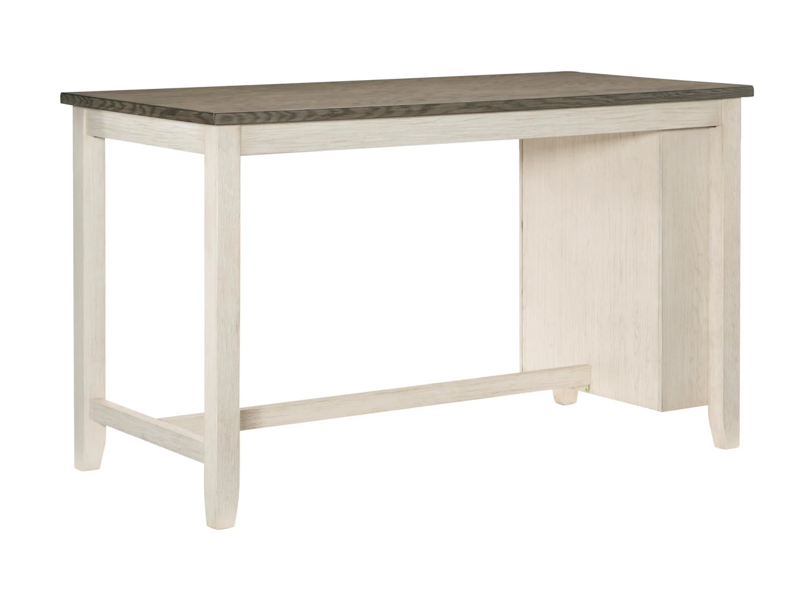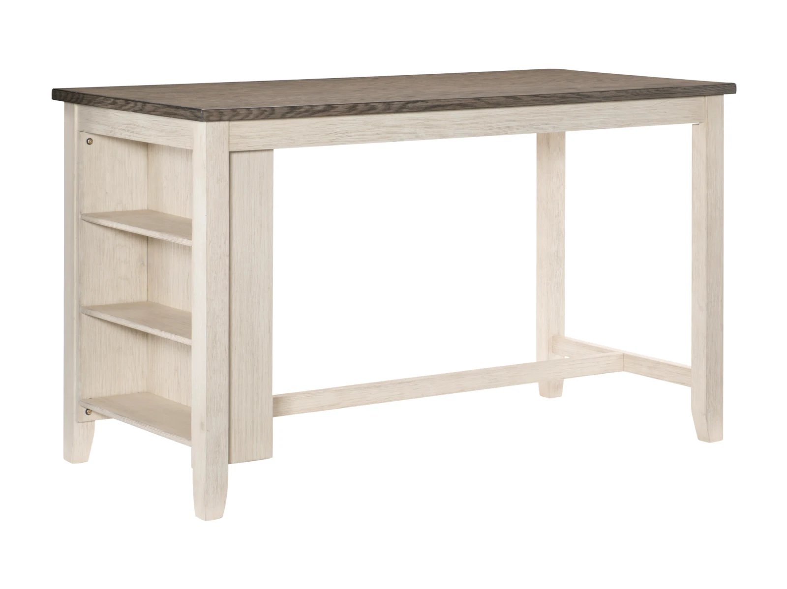 An exquisite blend of form and function, the Dogwood Counter Height Table is a compact, two-toned marvel. Built from sustainable acacia wood with acacia veneers, the skirt and tapered legs of this table are finished in a creamy white while its counter height tabletop is a rich wire brushed gray. The most intriguing aspect of this table is that it comes with a built in bookcase-style shelving unit, perfect for displaying accessories or storing glass and tableware. Able to seamlessly mesh with today’s transitional styles, the Dogwood Counter Height Table can be yours today either by itself or as a 5 Piece Set with our Dogwood Backless Barstools.
