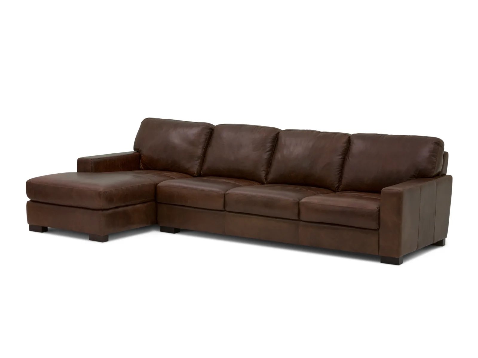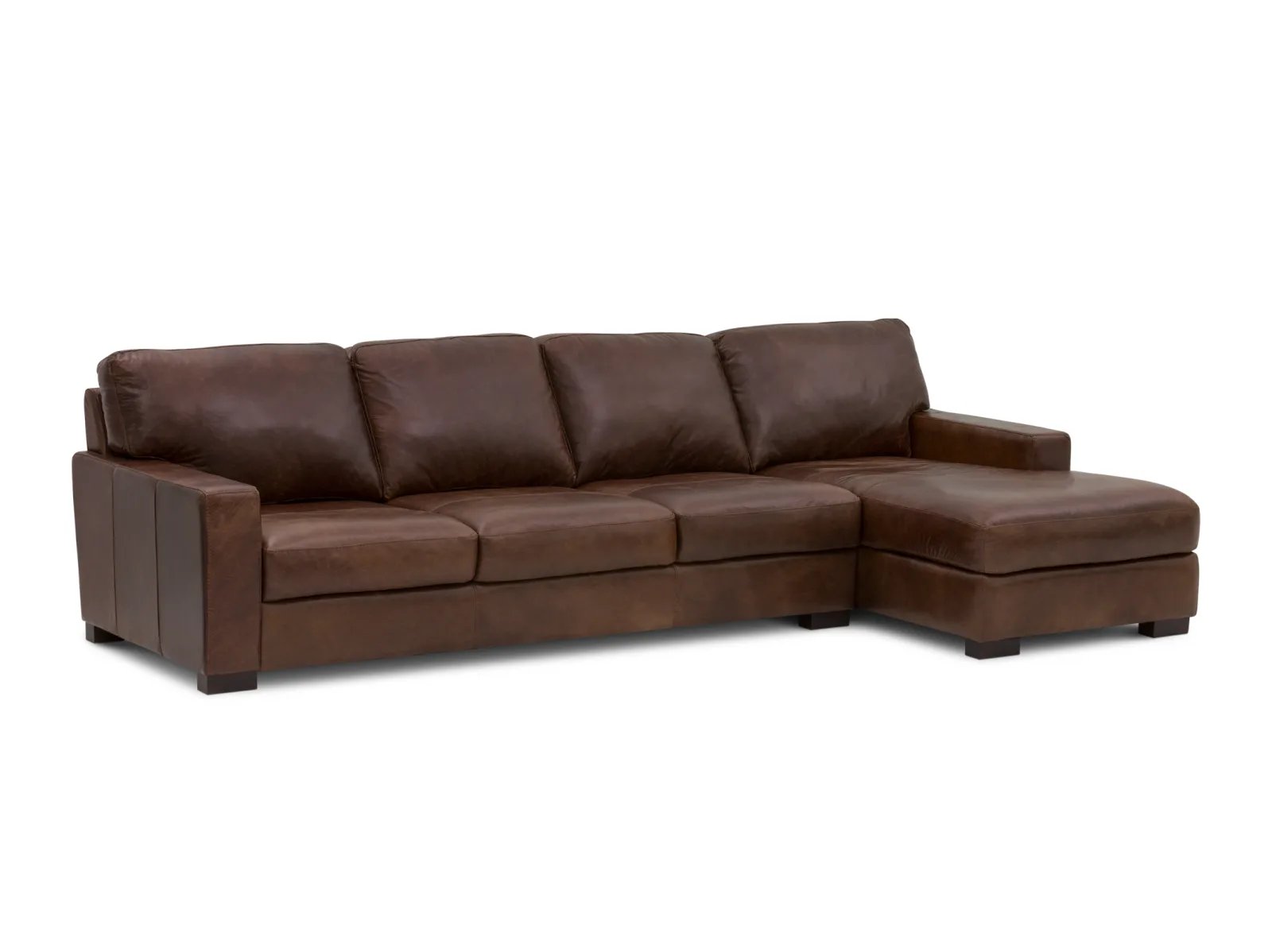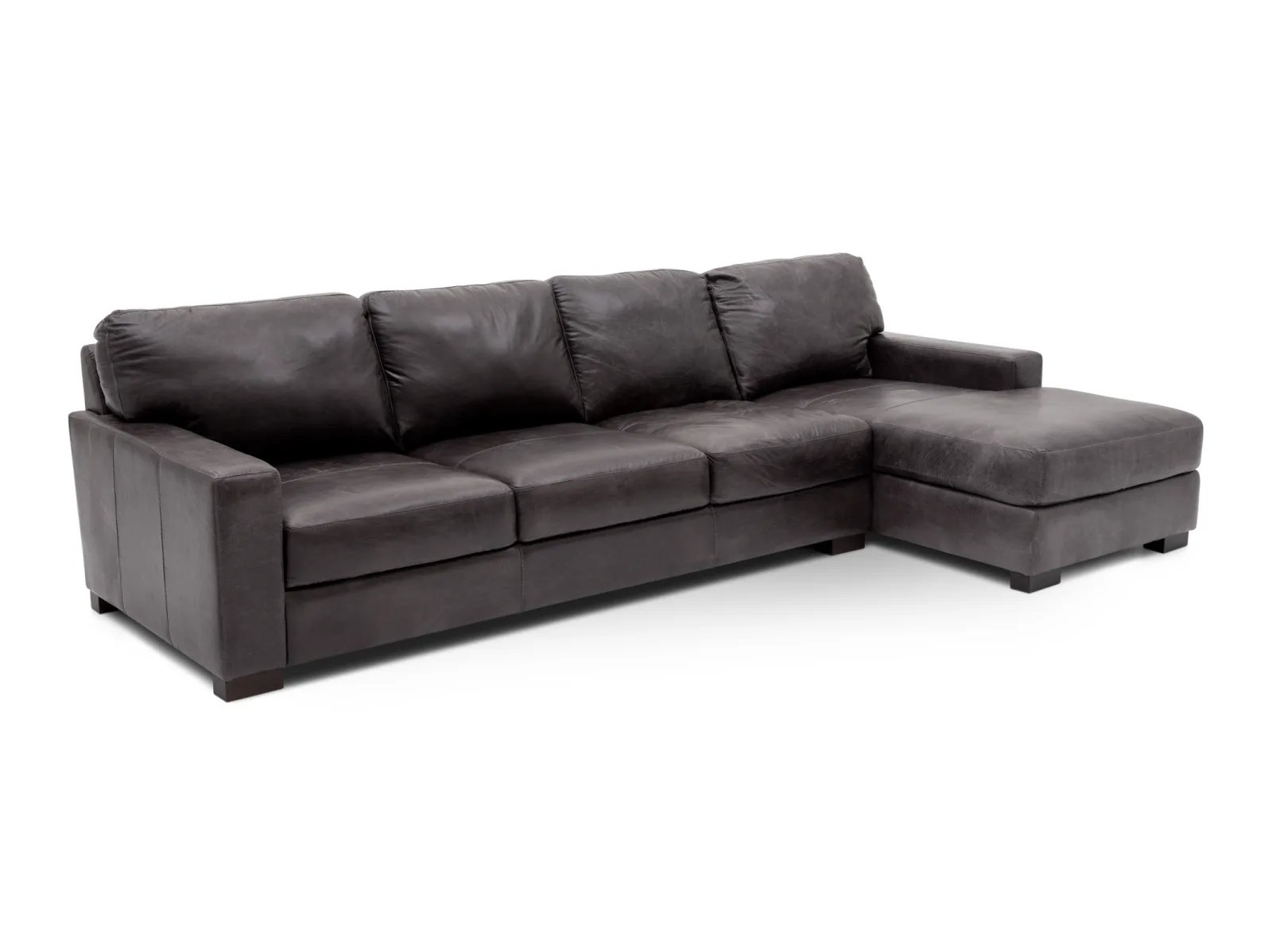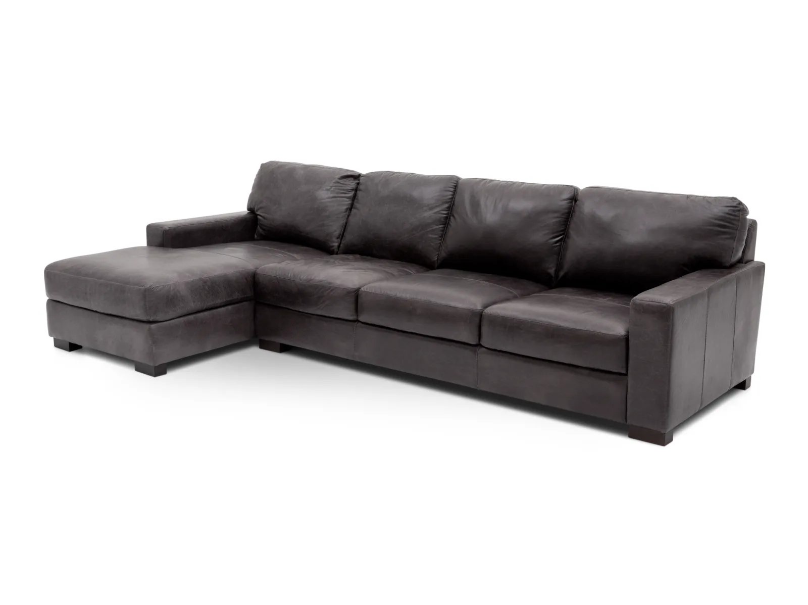 & Free ShippingAdd unbeatable leather luxury to your living space with the Durango 2 Pc. Chaise Sectional. Upholstered in 100% Italian-made, top-grain leather, the Durango is oiled and waxed for extra shine, guaranteeing quality appearance and style. With sleek track arms, solid hardwood feet, large-scale deep seating, and comfy attached cushions, this seating offers unrivaled relaxation for all of your guests. Never search for a place to sit again. The Durango is available in dark gray or chestnut brown in a left arm or right arm facing sectional set-up including a sofa and chaise.