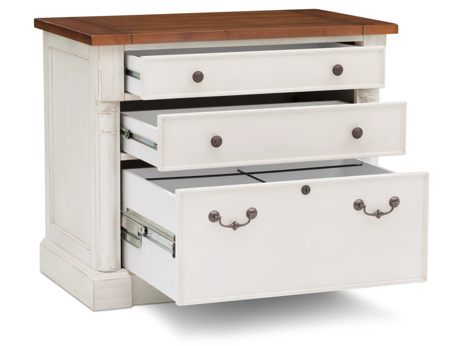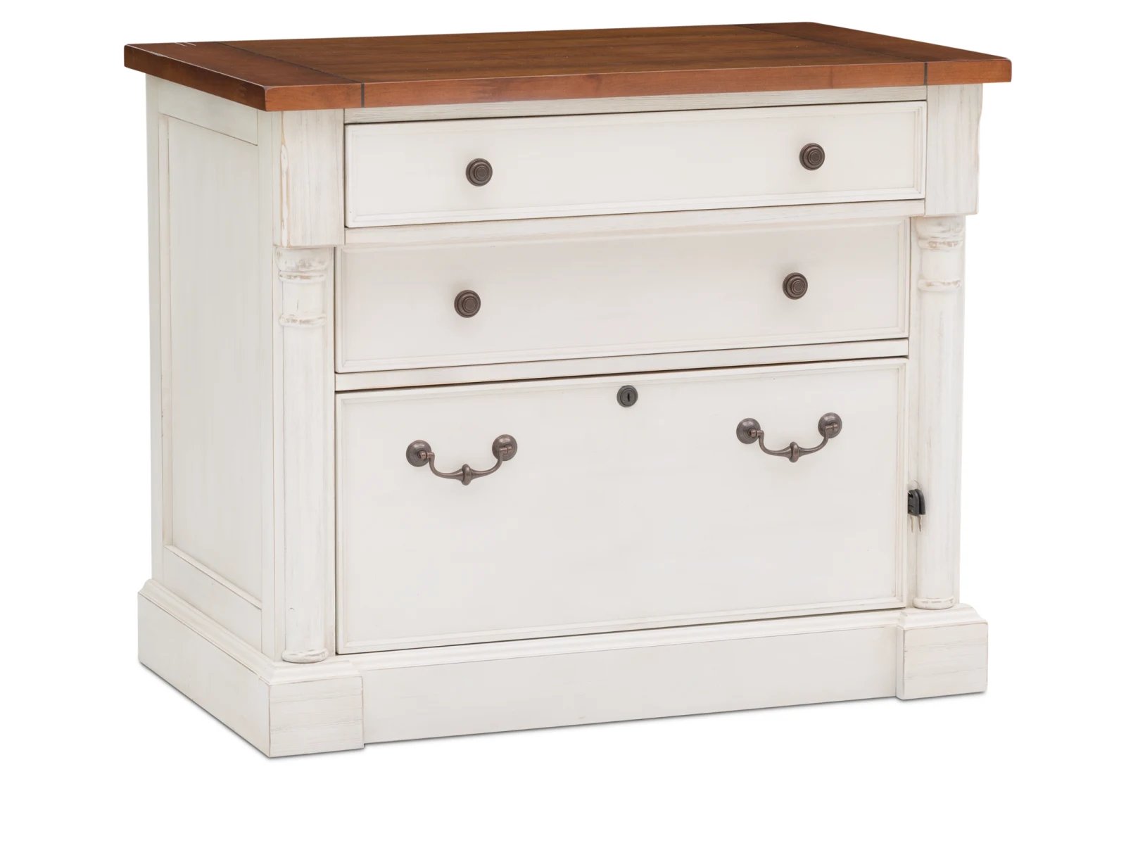 & Free ShippingThe Durham File Cabinet with its chalk white finish on poplar solids and birch veneers and knotty cherry top reflect a weathered, shabby chic design that will fit seamlessly into your home office. From traditional to cottage styles, this storage piece will be right at home in either a classic formal setting or a more relaxed, eclectic space. Featuring dovetailed drawers with antique metal knobs and pulls, the Durham has the function you need with the sophisticated style you love. Take it home today.