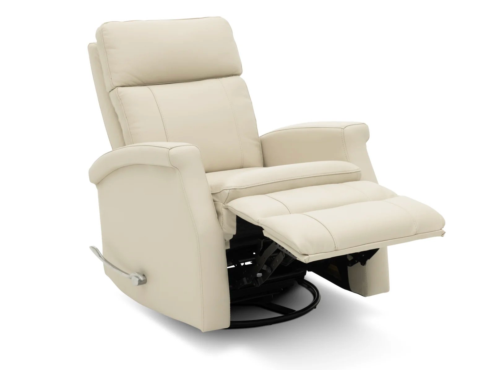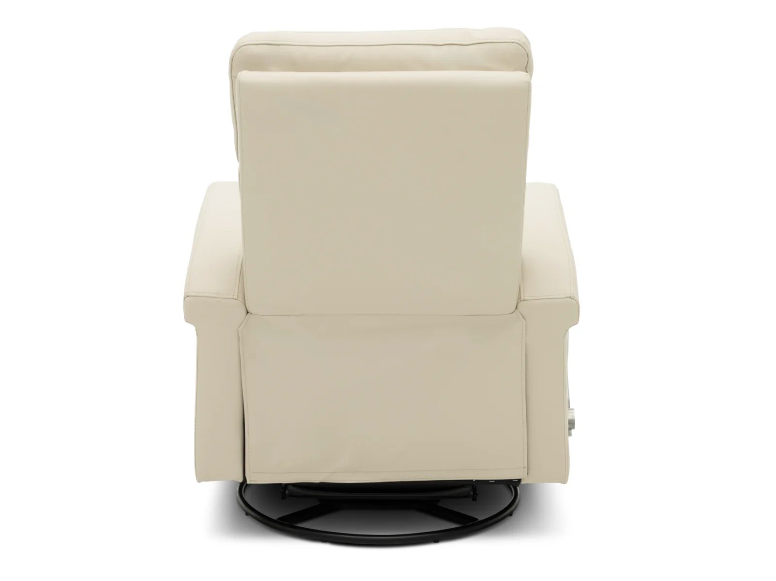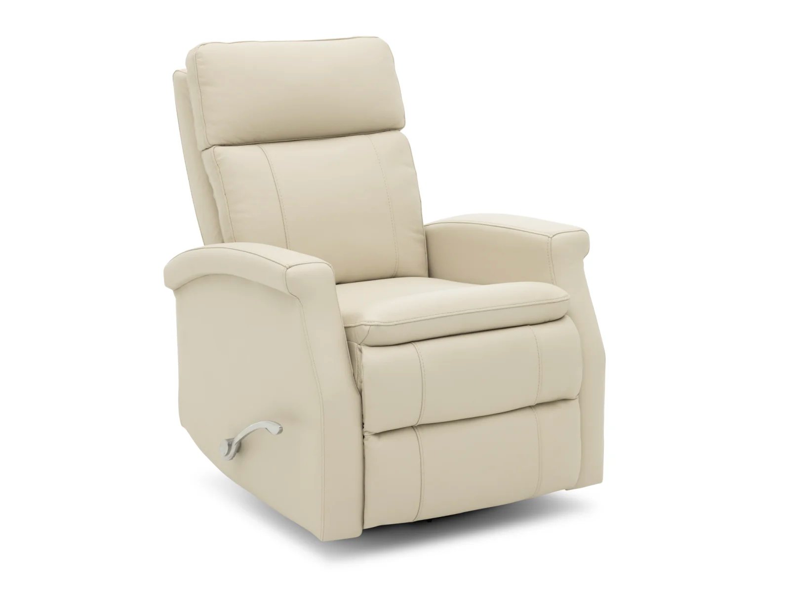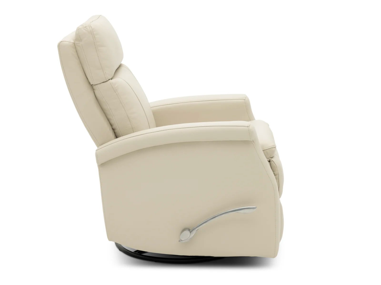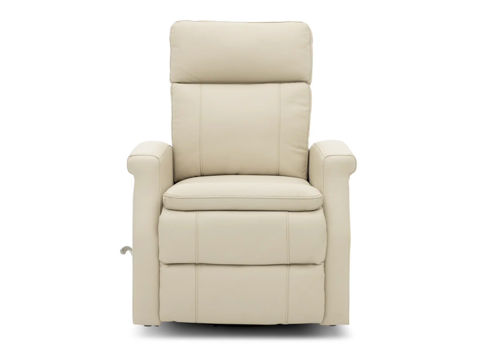 Sink into ultimate relaxation with the Eddie Swivel Recliner, a sophisticated contemporary chair designed to enhance your everyday living space. Built with a durable hardwood frame and high-density foam cushioning, the Eddie combines comfort with lasting quality. It features smooth power-assisted reclining and a full swivel function, making it perfect for any living room or entertainment space. Adorned in wrapped in luxurious stone-colored leather, the Eddie is complete with a chrome handle activator assist and sleek track arms for a modern attitude. Make the most of your home — and relaxation — with the Eddie Swivel Recliner.