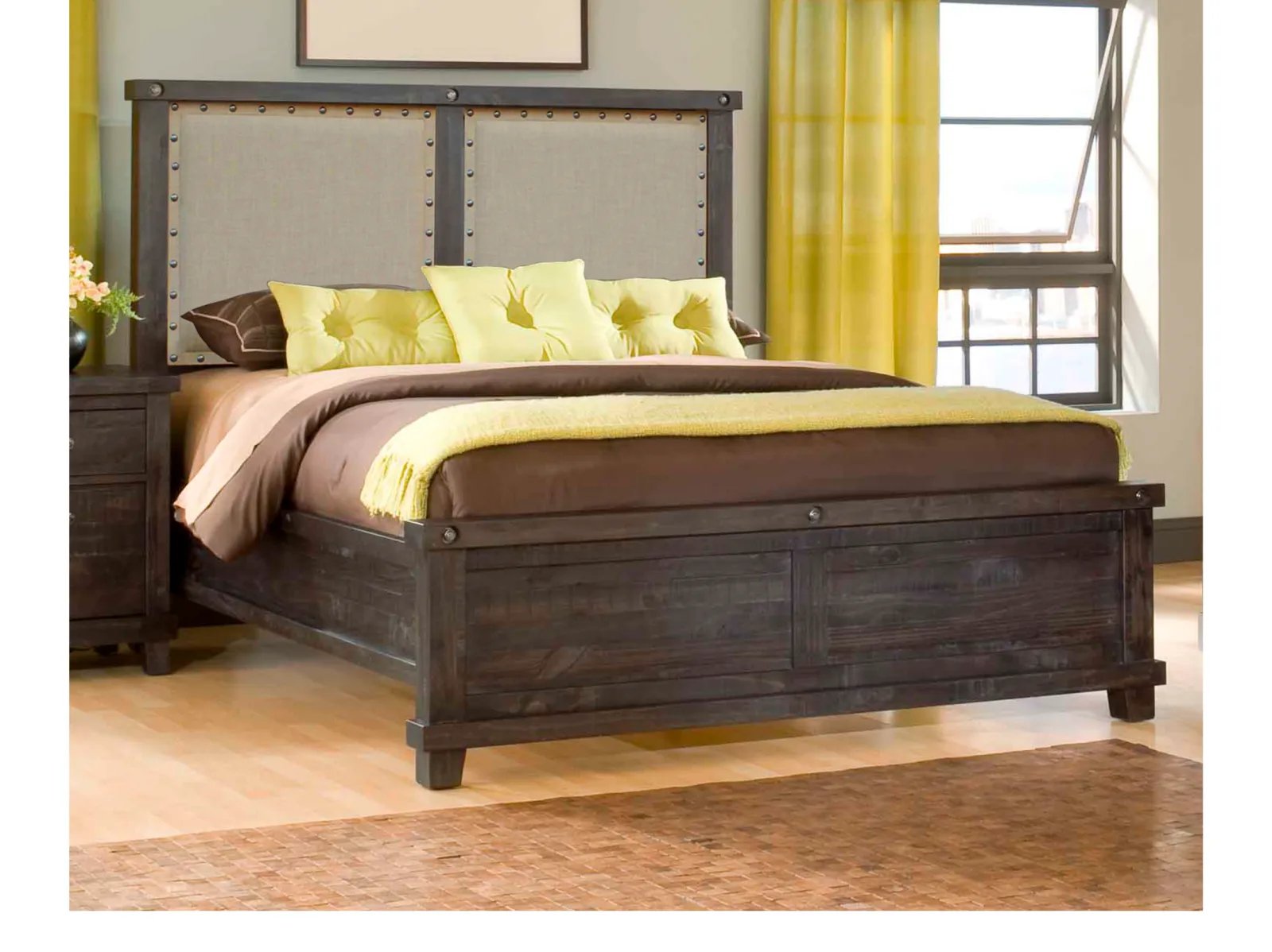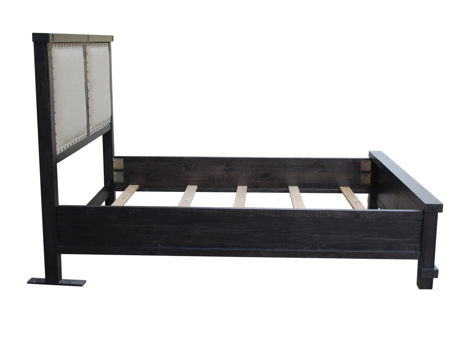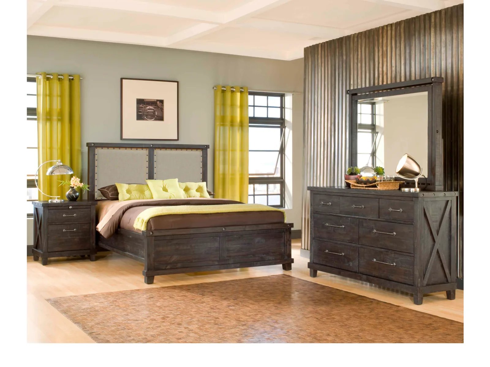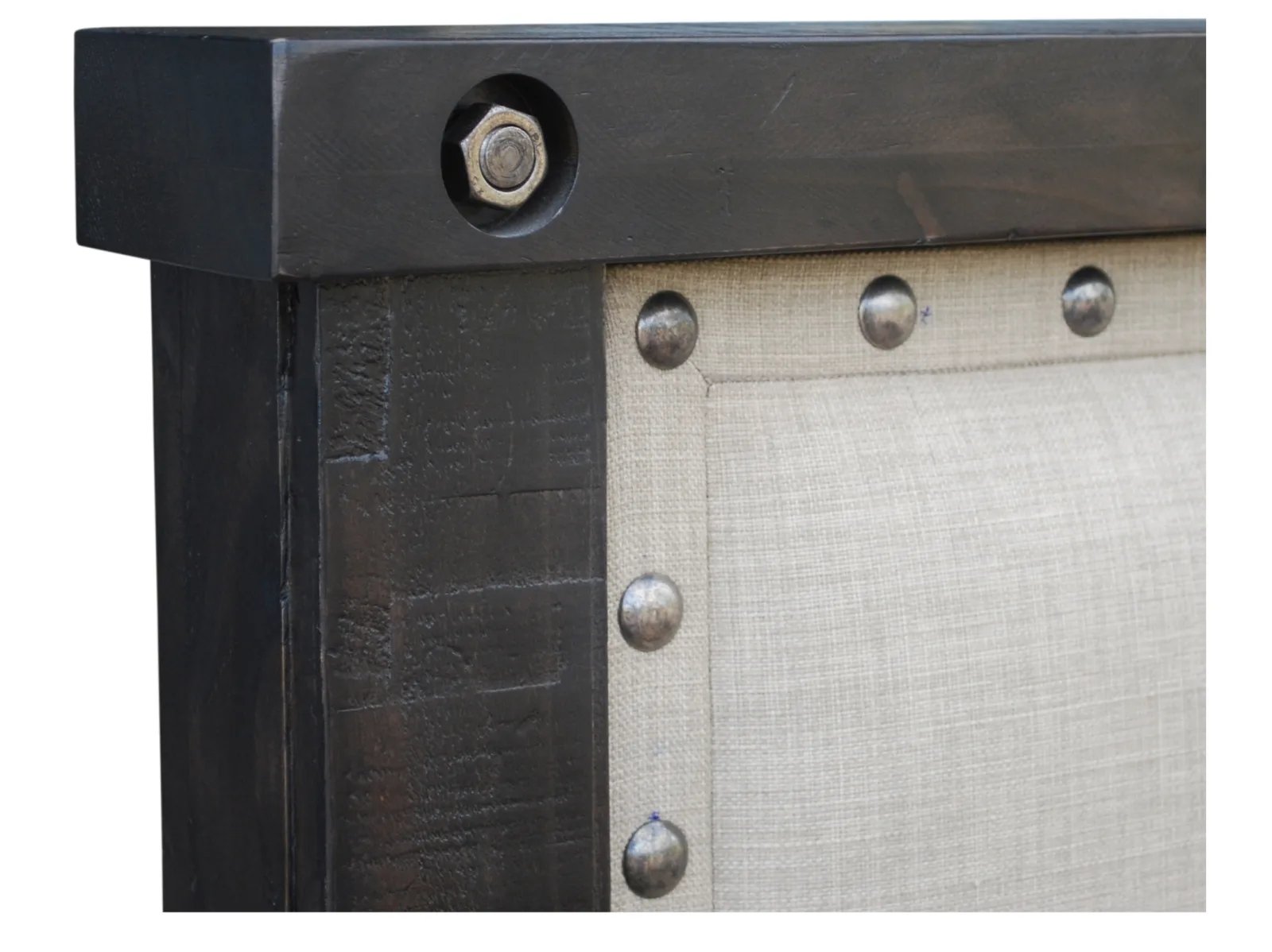 The Emerson bedroom recreates the improvised, utilitarian look of early 20th century factory furniture. A rustic black pine finish balances transparency and opacity to showcase these natural imperfections. Exposed bolts, hammered metal pulls, cross-braces and a tilt-style mirror evoke the ingenuity and earnestness that characterized the turn of the century. Choose from headboards with cross braced detailing or cushioned linen panels fashioned with nail head trim. Bed frames include 5 cross slats with center leg supports for use with out a box spring.