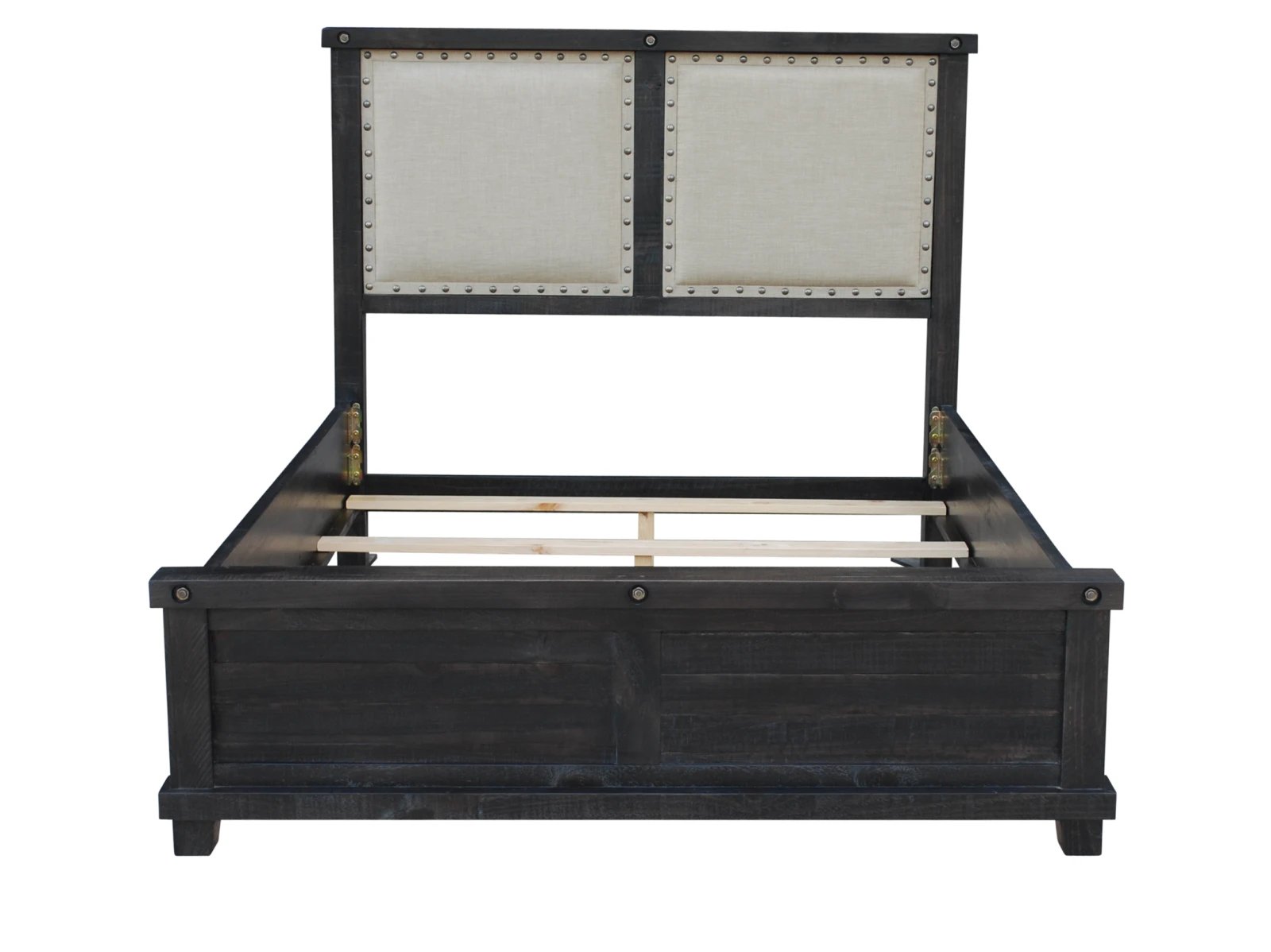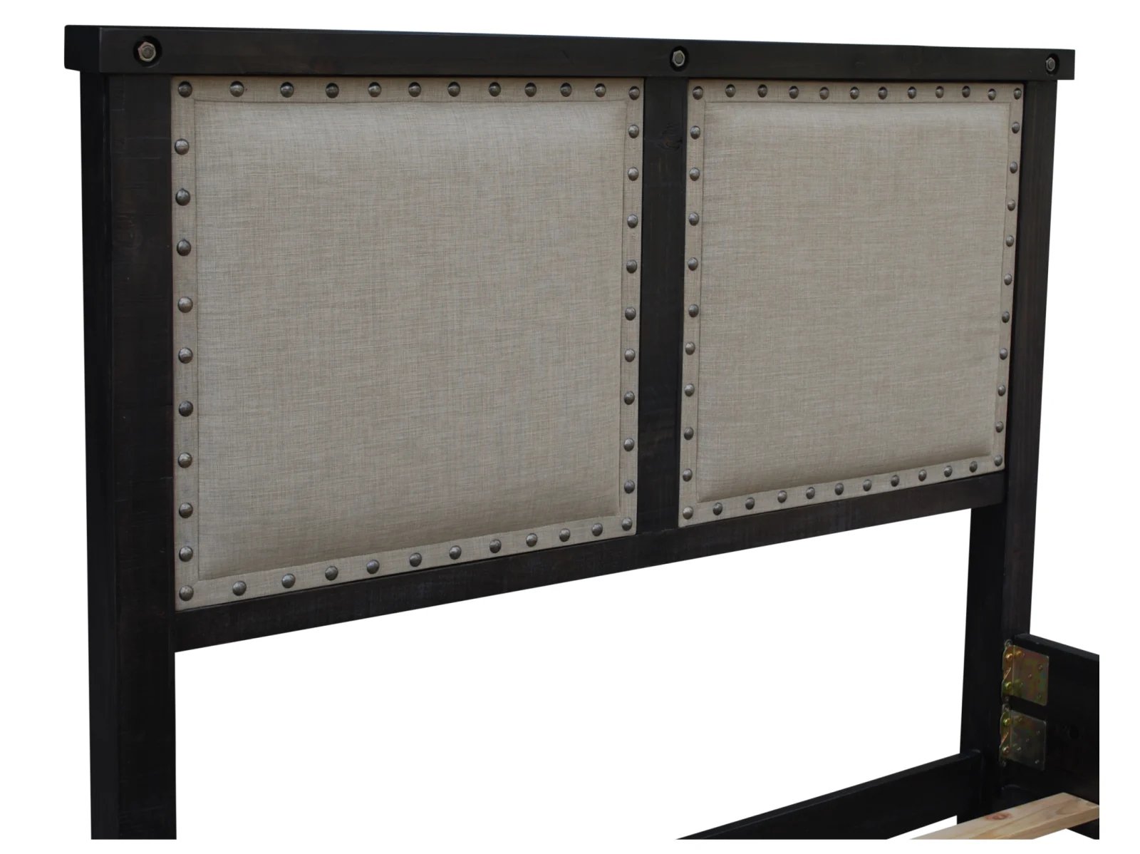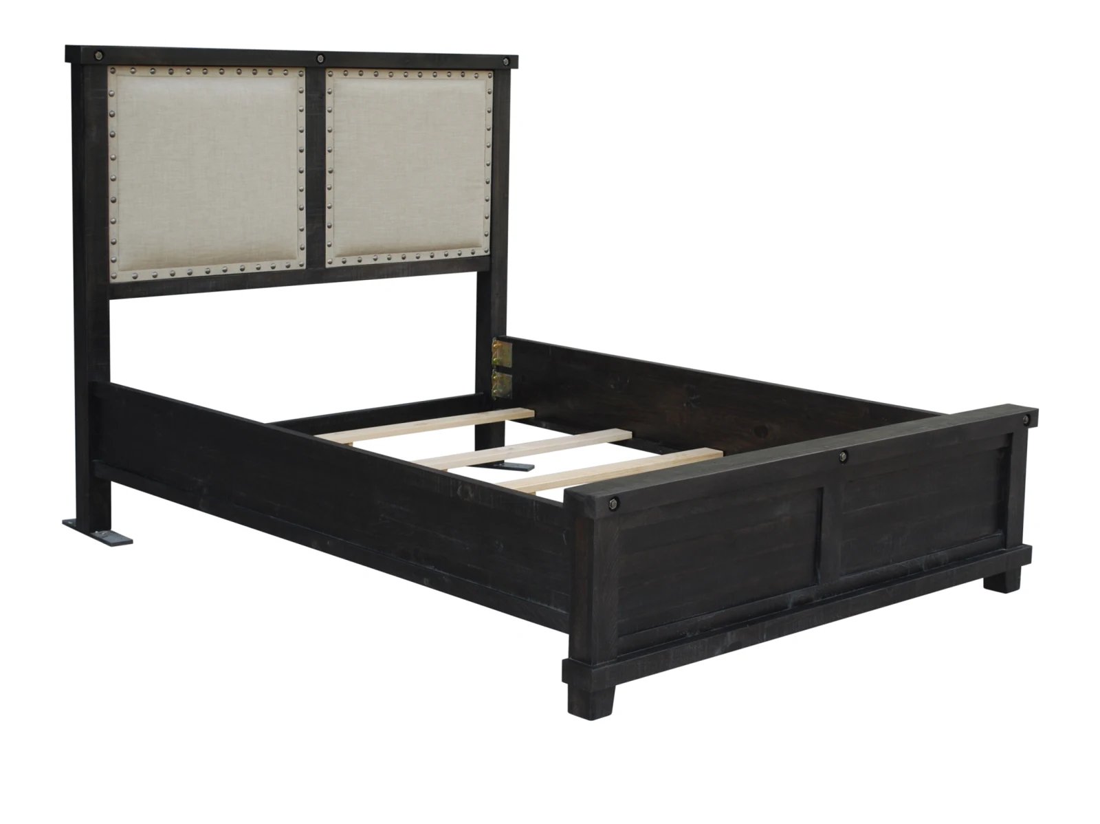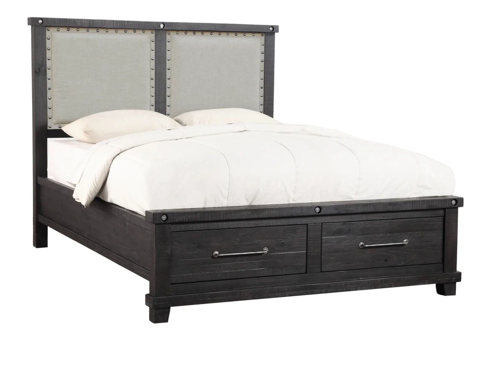 The Emerson bedroom recreates the improvised, utilitarian look of early 20th century factory furniture. A rustic black pine finish balances transparency and opacity to showcase these natural imperfections. Exposed bolts, hammered metal pulls, cross-braces and a tilt-style mirror evoke the ingenuity and earnestness that characterized the turn of the century. Choose from headboards with cross braced detailing or cushioned linen panels fashioned with nail head trim. Bed frames include 5 cross slats with center leg supports for use with out a box spring.