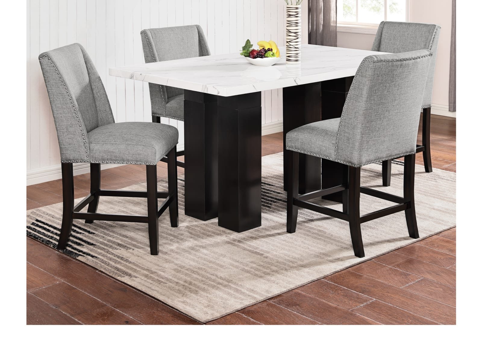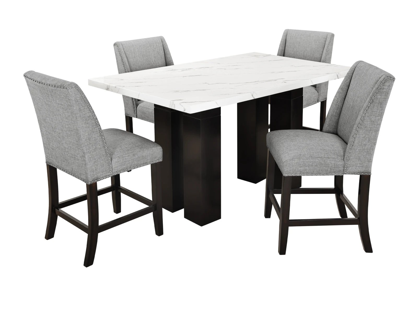 & Free ShippingThe Fairmont Dining Collection is the epitome of modern elegance and versatility. Crafted with a combination of rubberwood and engineered wood composite, this collection offers durability and stability. The faux marble table top adds a touch of sophistication and visual appeal. The chairs feature 100% polyester fabric upholstery, providing both comfort and style. The nail head trim on the chairs adds a subtle yet luxurious detail. What sets this collection apart is the adjustable height table top, allowing you to customize the dining experience to your preference. Whether you’re hosting a formal dinner or a casual gathering, the Fairmont Dining Collection is designed to meet your needs with its exquisite design and functional features. Elevate your dining space with this stunning collection and create unforgettable moments with family and friends.