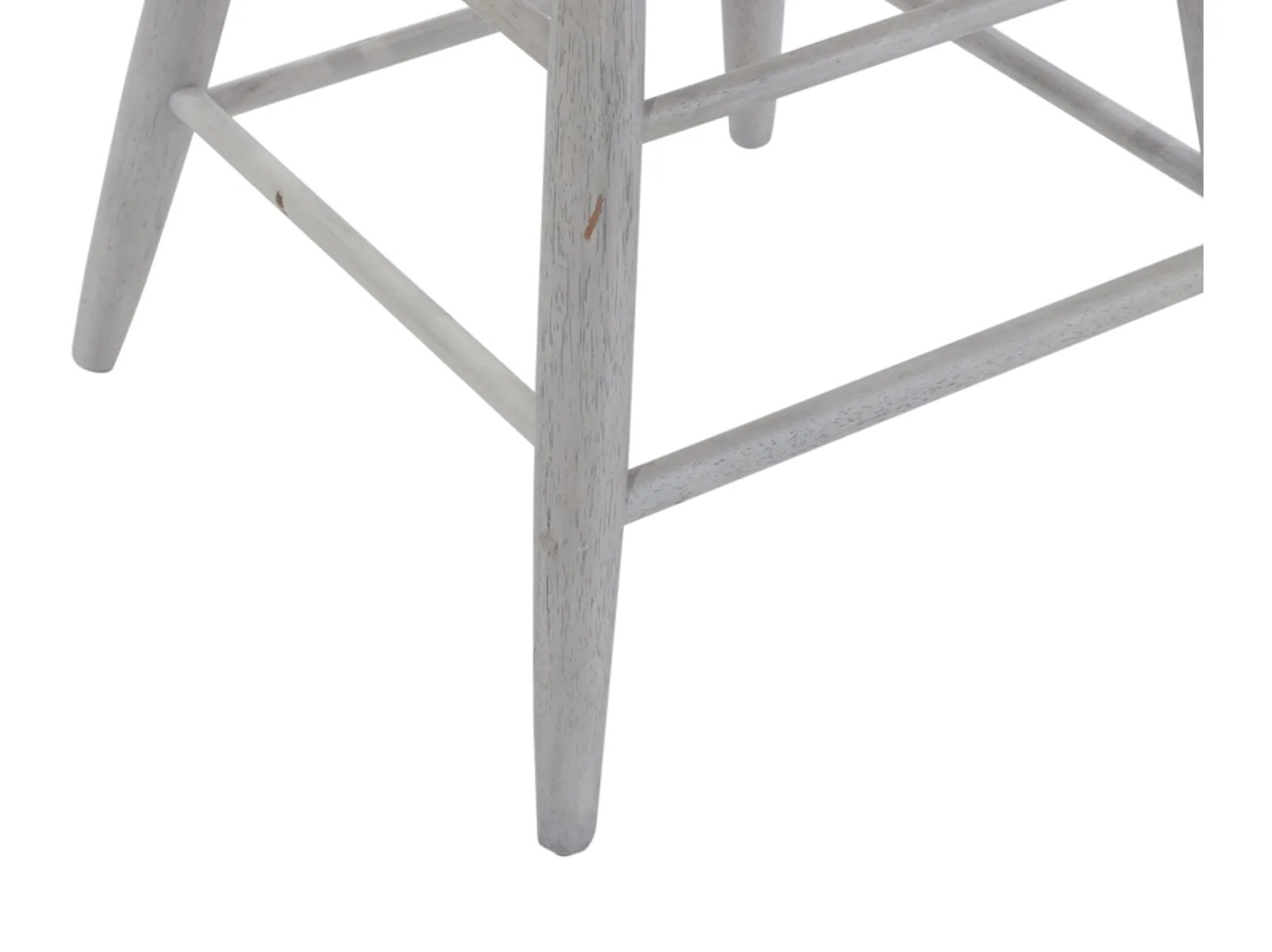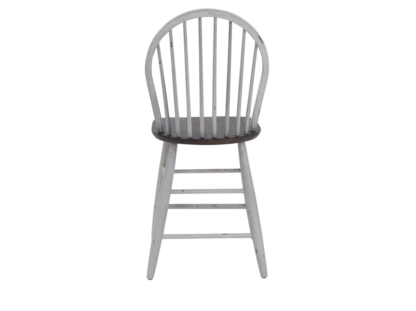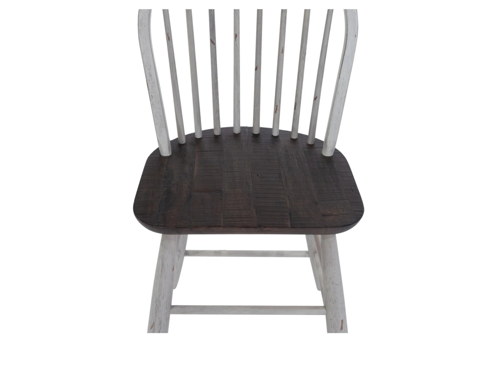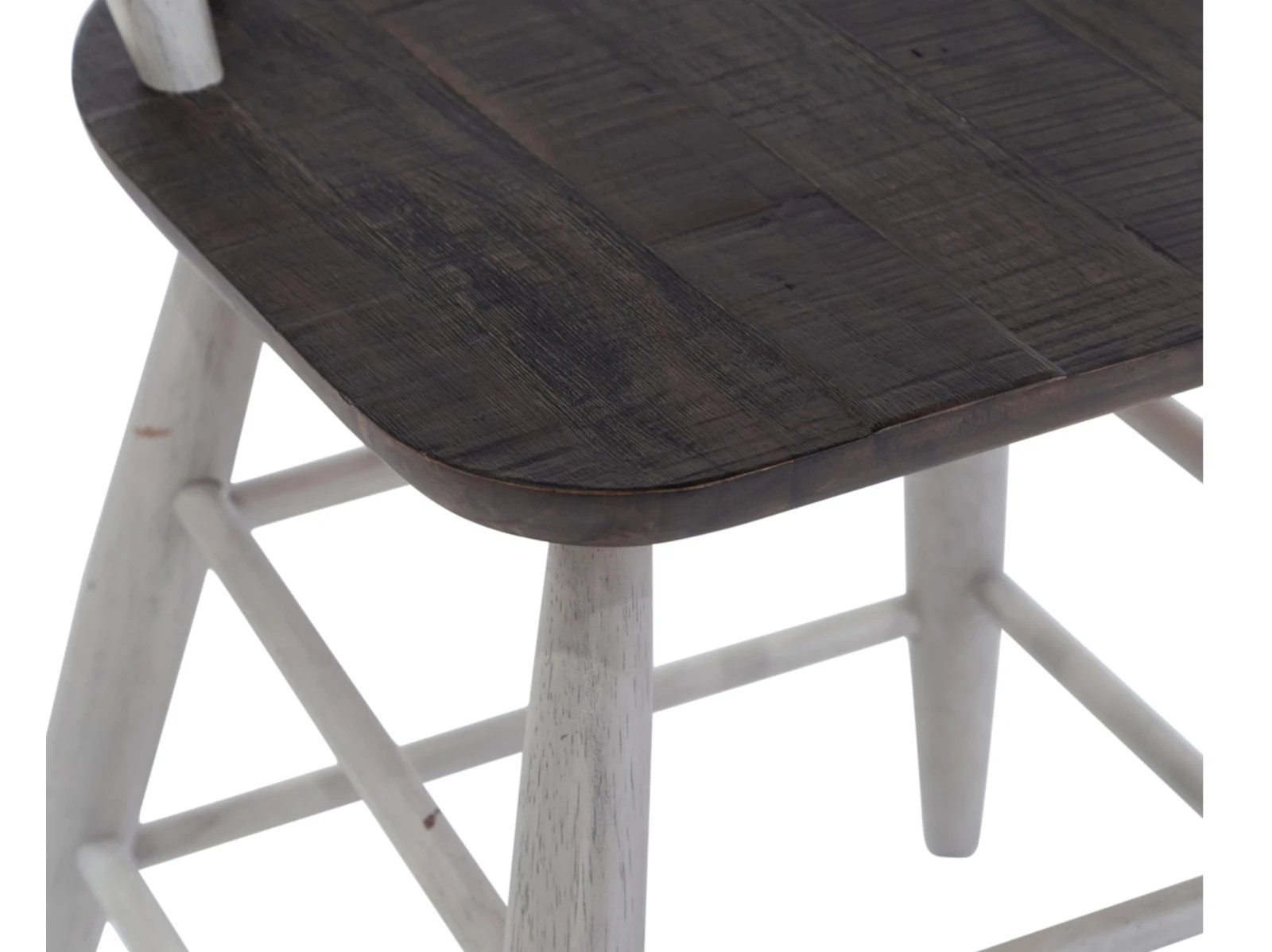 Sit in style and comfort with the Farmhouse Windsor back bar stool. Crafted of rubberwood solids, this piece features a timeless heavy distressing and nylon chair glides to protect your flooring. The two-tone white finish with wood tone seat creates a versatile look that is sure to be the perfect addition to any space.