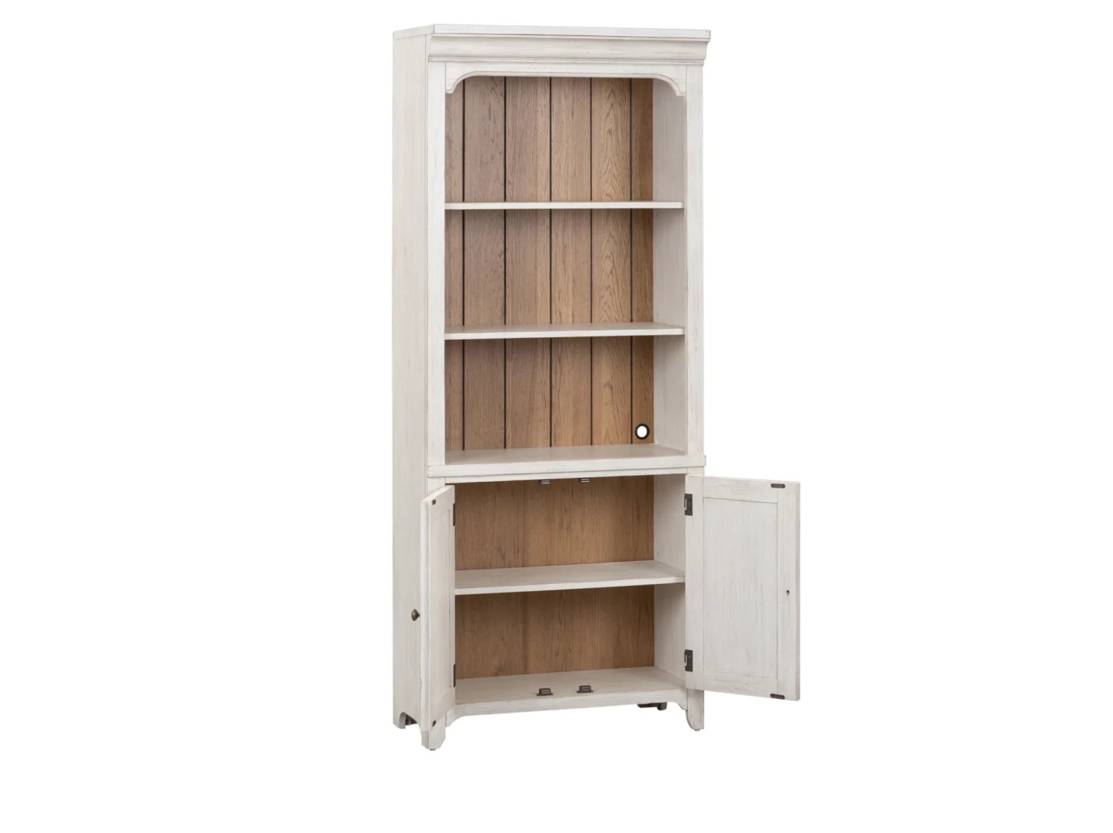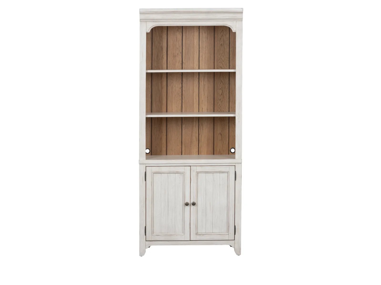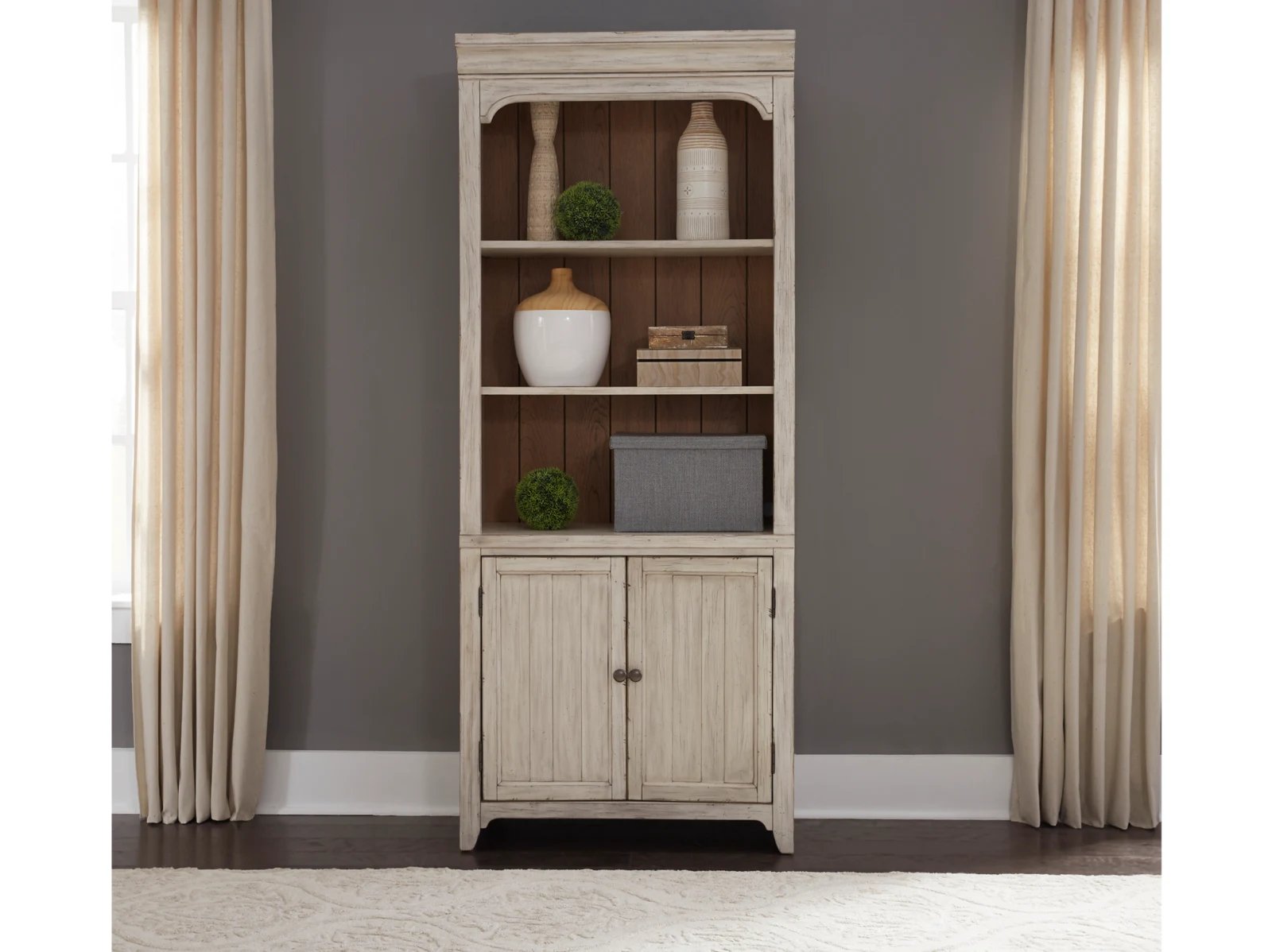 & Free ShippingCreate a classic look with a casual feel using the FarmLand Bookcase. Crafted with pine solids with hickory and pine veneers, this piece features heavy distressing, wire management access, and a planked back panel in the chestnut finish, accented by antique brass knob hardware. Storage abounds with three adjustable shelves, one located behind the planked doors. The antique white finish with chestnut accents results in a look that is compatible with today’s homes.