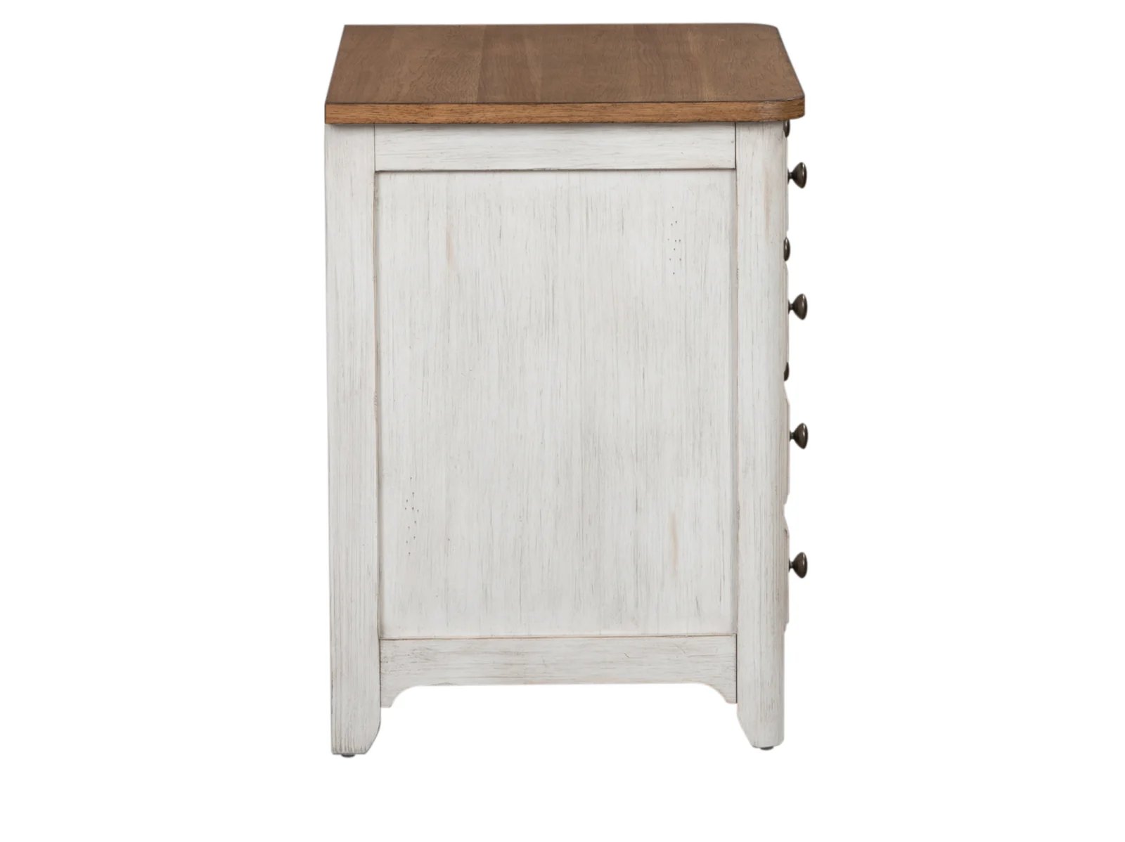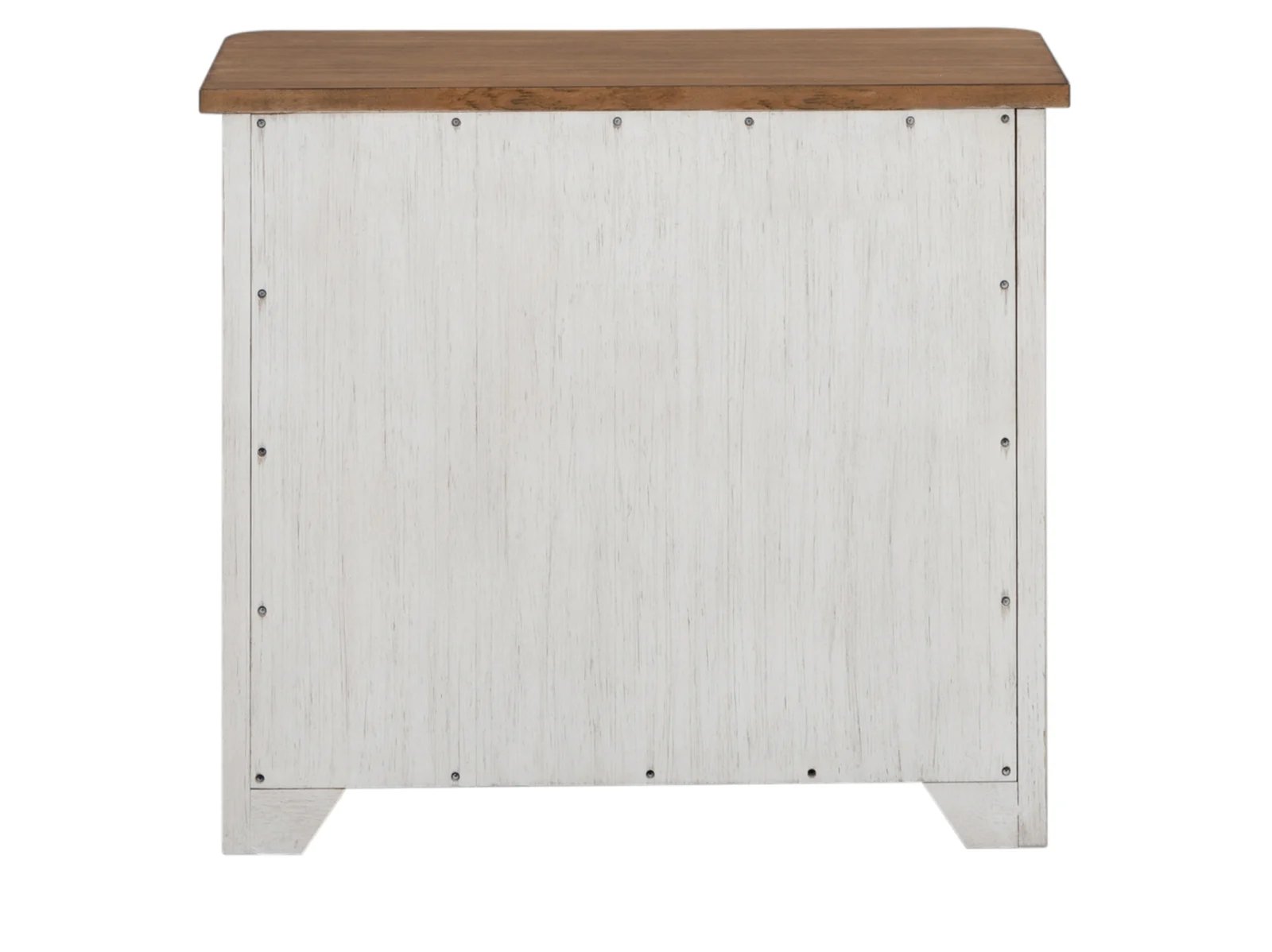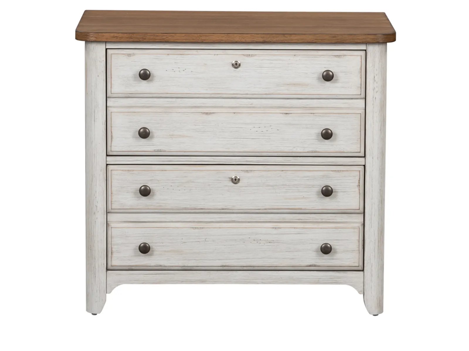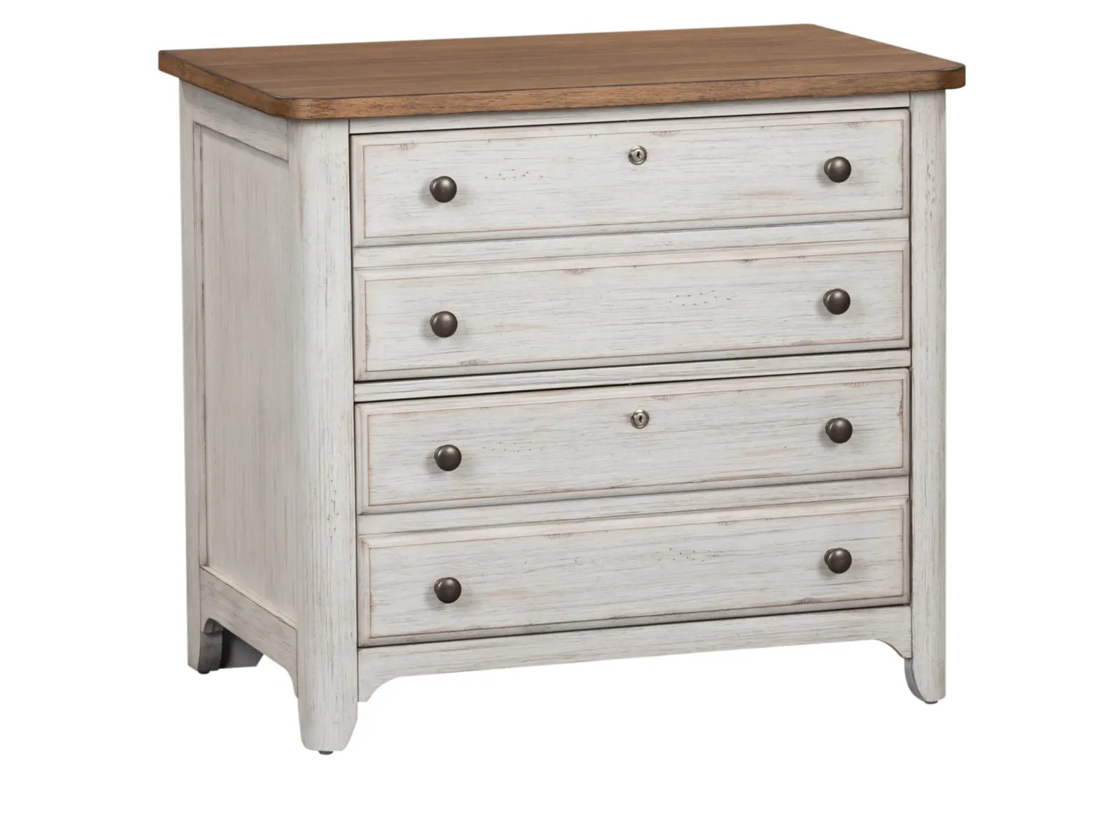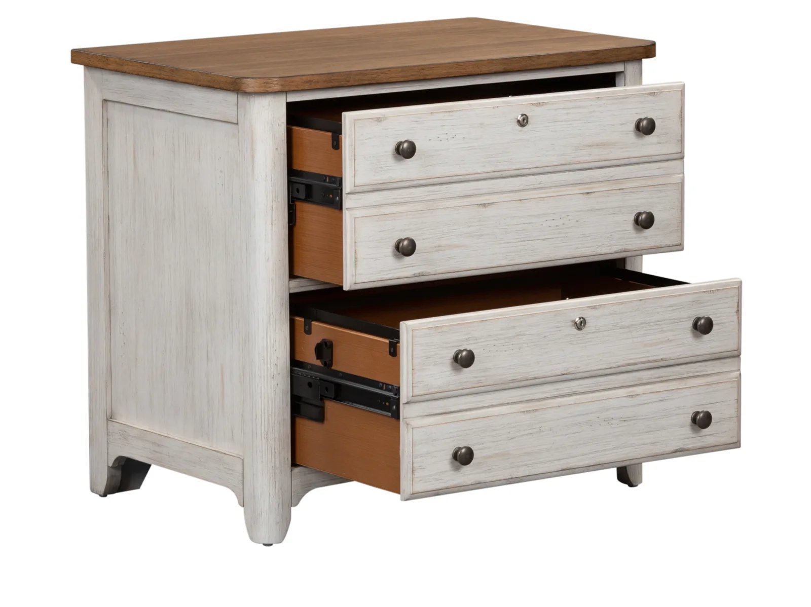 & Free ShippingEnhance your office space with the Farmland file Cabinet. Crafted of pine solids with hickory and pine veneers, this piece features a two toned antique white finish with chestnut tops, two full extension locking storage file drawers for easy access to storage, fully stained interior drawers, chamfered drawer fronts, heavy distressing, and is accented by antique brass knob hardware.