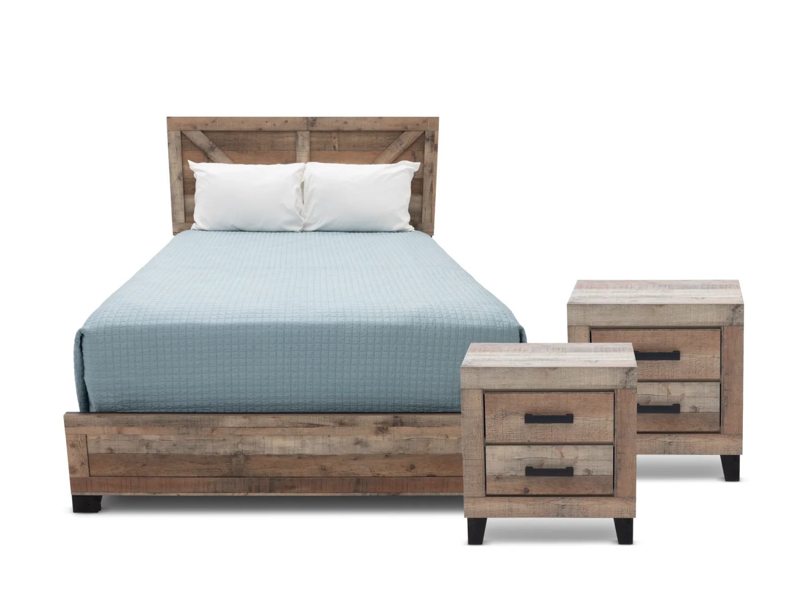 & Free ShippingTransform your bedroom into a rustic retreat with the Frontier 3 Pc. Bedroom Set. Combining the charm of rustic materials with urban sophistication, this set features a Bed and two Nightstands for a cohesive bedroom foundation. The Asian hardwood construction with paper veneer ensures durability, while the illustrious brown finish beautifully highlights the natural wood grain. The bed’s headboard showcases a striking barn door look, adding a touch of farmhouse flair to your space. And for convenient storage, each bedside companion includes two English dovetail drawers with center glides and black bar hardware for a dramatic final touch. Your bedroom will never fall short on charisma or craftsmanship thanks to the Frontier 3 Pc. Bedroom Set!