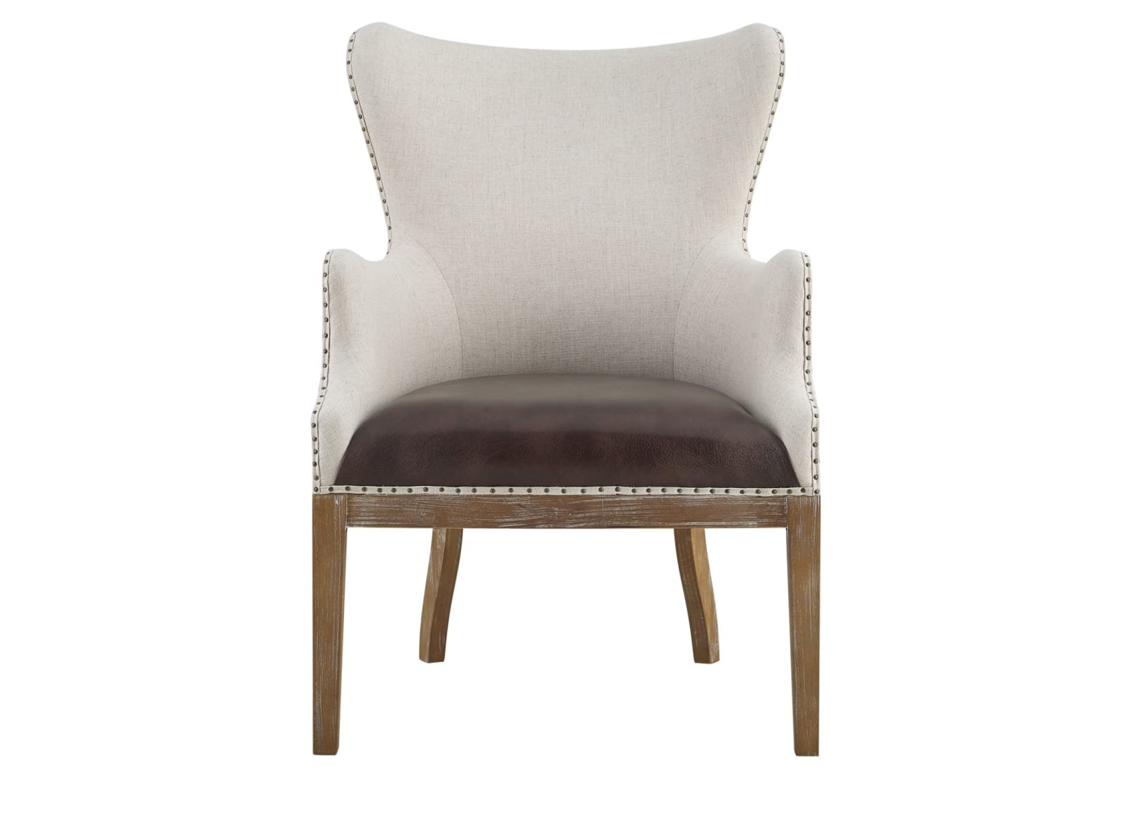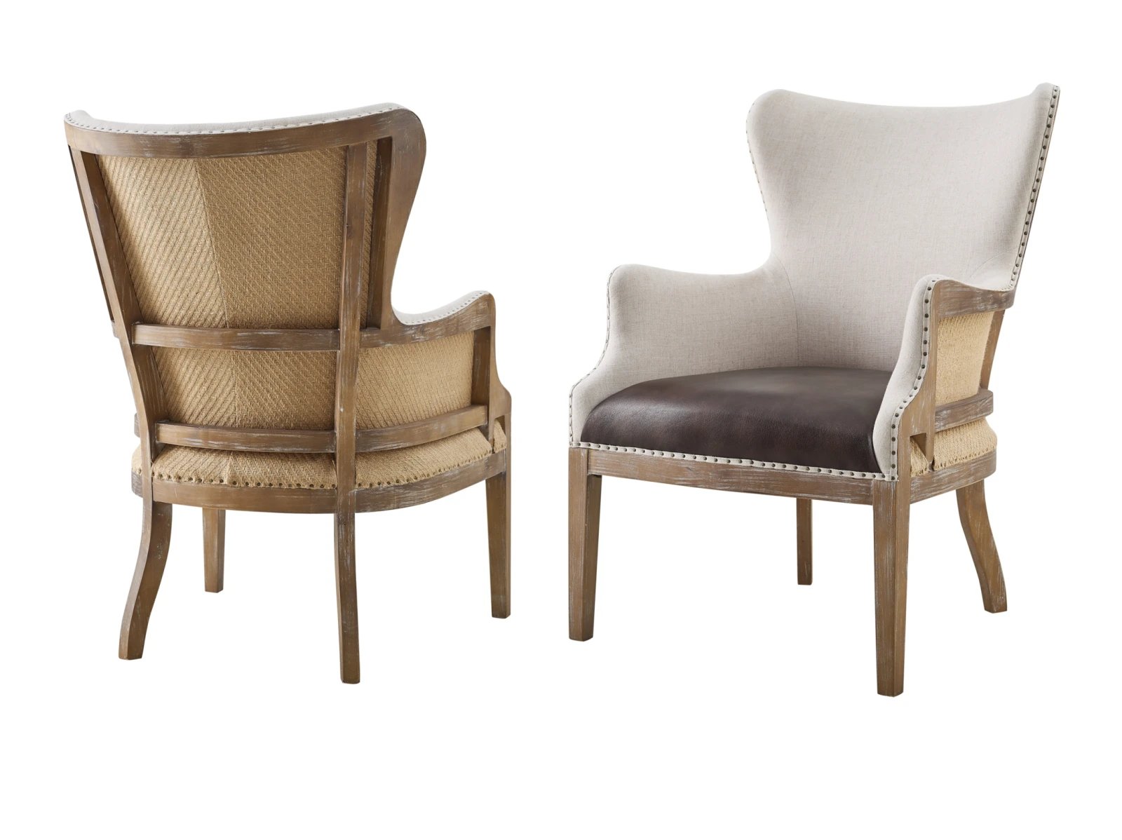 Rustic living at its finest, the Gannon Wingback Chair mixes together textures, shapes, and materials to create a chair you will fall in love with. This two-tone chair features alabaster linen inside back with a faux rawhide seat and nailhead trim but the real action is on the outside where an exposed wood frame and distressed oak finish make the chair a real head-turner. Use as an Accent Chair, a Captains Chair at a dining table or both.
